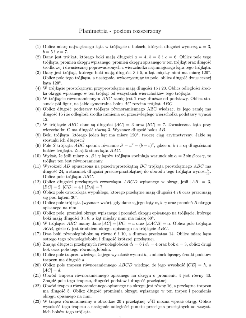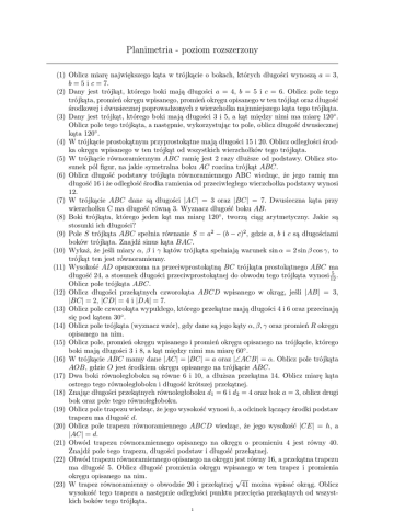 Planimetria - poziom rozszerzony (1) Oblicz miarę największego kąta w trójkącie o bokach, których długości wynoszą a = 3, b = 5 i c = 7. (2) Dany jest trójkąt, którego boki mają długości a = 4, b = 5 i c = 6. Oblicz pole tego trójkąta, promień okręgu wpisanego, promień okręgu opisanego w ten trójkąt oraz długość środkowej i dwusiecznej poprowadzonych z wierzchołka najmniejszego kąta tego trójkąta. (3) Dany jest trójkąt, którego boki mają długości 3 i 5, a kąt między nimi ma miarę 120◦ . Oblicz pole tego trójkąta, a następnie, wykorzystując to pole, oblicz długość dwusiecznej kąta 120◦ . (4) W trójkącie prostokątnym przyprostokątne mają długości 15 i 20. Oblicz odległości środka okręgu wpisanego w ten trójkąt od wszystkich wierzchołków tego trójkąta. (5) W trójkącie równoramiennym ABC ramię jest 2 razy dłuższe od podstawy. Oblicz stosunek pól figur, na jakie symetralna boku AC rozcina trójkąt ABC. (6) Oblicz długość podstawy trójkąta równoramiennego ABC wiedząc, że jego ramię ma długość 16 i że odległość środka ramienia od przeciwległego wierzchołka podstawy wynosi 12. (7) W trójkącie ABC dane są długości |AC| = 3 oraz |BC| = 7. Dwusieczna kąta przy wierzchołku C ma długość równą 3. Wyznacz długość boku AB. (8) Boki trójkąta, którego jeden kąt ma miarę 120◦ , tworzą ciąg arytmetyczny. Jakie są stosunki ich długości? (9) Pole S trójkąta ABC spełnia równanie S = a2 − (b − c)2 , gdzie a, b i c są długościami boków trójkąta. Znajdź sinus kąta BAC. (10) Wykaż, że jeśli miary α, β i γ kątów trójkąta spełniają warunek sin α = 2 sin β cos γ, to trójkąt ten jest równoramienny. (11) Wysokość AD opuszczona na przeciwprostokątną BC trójkąta prostokątnego ABC ma 5 . długość 24, a stosunek długości przeciwprostokątnej do obwodu tego trójkąta wynosi 12 Oblicz pole trójkąta ABC. (12) Oblicz długości przekątnych czworokąta ABCD wpisanego w okrąg, jeśli |AB| = 3, |BC| = 2, |CD| = 4 i |DA| = 7. (13) Oblicz pole czworokąta wypukłego, którego przekątne mają długości 4 i 6 oraz przecinają się pod kątem 30◦ . (14) Oblicz pole trójkąta (wyznacz wzór), gdy dane są jego kąty α, β, γ oraz promień R okręgu opisanego na nim. (15) Oblicz pole, promień okręgu wpisanego i promień okręgu opisanego na trójkącie, którego boki mają długości 3 i 8, a kąt między nimi ma miarę 60◦ . (16) W trójkącie ABC mamy dane |AC| = |BC| = a oraz |∠ACB| = α. Oblicz pole trójkąta AOB, gdzie O jest środkiem okręgu opisanego na trójkącie ABC. (17) Dwa boki równoległoboku są równe 6 i 10, a dłuższa przekątna 14. Oblicz miarę kąta ostrego tego równoległoboku i długość krótszej przekątnej. (18) Znając długości przekątnych równoległoboku d1 = 6 i d2 = 4 oraz bok a = 3, oblicz drugi bok oraz pole tego równoległoboku. (19) Oblicz pole trapezu wiedząc, że jego wysokość wynosi h, a odcinek łączący środki podstaw trapezu ma długość d. (20) Oblicz pole trapezu równoramiennego ABCD wiedząc, że jego wysokość |CE| = h, a |AC| = d. (21) Obwód trapezu równoramiennego opisanego na okręgu o promieniu 4 jest równy 40. Znajdź pole tego trapezu, długości podstaw i długość przekątnej. (22) Obwód trapezu równoramiennego opisanego na okręgu jest równy 16, a przekątna trapezu ma długość 5. Oblicz długość promienia okręgu wpisanego w ten trapez i promienia okręgu opisanego na nim. √ (23) W trapez równoramienny o obwodzie 20 i przekątnej 41 można wpisać okrąg. Oblicz wysokość tego trapezu a następnie odległości punktu przecięcia przekątnych od wszystkich boków tego trójkąta. (24) Trapez, w którym ramię ma długość 5, wpisano w okrąg o promieniu 6,5. Oblicz pole tego trapezu wiedząc, że dłuższa podstawa jest średnicą tego okręgu. Odpowiedzi: (1) 120◦ √ (2) P = 157 7 , R = √ √ 8 7 7 , 15 8 √ r= (3) (4) (5) (6) (7) (8) (9) (10) (11) P = 154 3 , d = √ √ √ 5 2, 5 5, 5 10 (12) (13) (14) (15) |AC| = 377 27 , |BD| = 2 6 2R2 sin α sin β sin γ √ √ 2 3 P = 6 6, r = 3 , R = (16) (17) (18) (19) (20) (21) 7 2 , √ środkowa = 106 2 , dwusieczna = √ 5 82 11 2 5√ 4 √10 20 7 7 3:5:7 8 17 Wskazówka: α = 180◦ − (β + γ) 60 q q a2 (1−cos α) cos α 2 sin √α 60◦ , 2 19 221 29 √ 7 3 3 √ √ a = 17, P = 8 3 hd hd √ P = 80, a = 16, b √ = 4, d = 2 41 7 (22) r = 1, 5, R = 5(4+ 12 (23) h = 4, d1 = 0, 8, d2 = 3, 2, d3 = d4 = 1, 28 (24) 8640 169 Edukacja Karol Suchoń www.karolsuchon.pl [email protected]