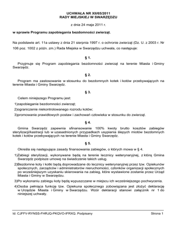UCHWAŁA NR XII/65/2011 RADY MIEJSKIEJ W SWARZĘDZU z dnia 24 maja 2011 r. w sprawie Programu zapobiegania bezdomności zwierząt. Na podstawie art. 11a ustawy z dnia 21 sierpnia 1997 r. o ochronie zwierząt (Dz. U. z 2003 r. Nr 106 poz. 1002 z późn. zm.) Rada Miejska w Swarzędzu uchwala, co następuje: § 1. Przyjmuje się Program zapobiegania bezdomności zwierząt na terenie Miasta i Gminy Swarzędz. § 2. Program ma zastosowanie w stosunku do bezdomnych kotek i kotów przebywających na terenie Miasta i Gminy Swarzędz. § 3. Celem niniejszego Programu jest: 1)zapobieganie bezdomności zwierząt; 2)ograniczenie niekontrolowanego rozrodu kotów; 3)promowanie prawidłowych postaw i zachowań człowieka w stosunku do zwierząt. § 4. Gmina Swarzędz zapewnia sfinansowanie 100% kwoty brutto kosztów zabiegów sterylizacji/kastracji lub w uzasadnionych przypadkach usypiania ślepych miotów bezdomnych kotek i kotów przebywających na terenie Miasta i Gminy Swarzędz. § 5. Określa się następujące zasady finansowania zabiegów, o których mowa w § 4. 1)Zabiegi sterylizacji, wykonywane będą na terenie lecznicy weterynaryjnej, z którą Gmina Swarzędz podpisze umowę na świadczenie takich usług. 2)Bezdomne koty i kotki będą doprowadzane do lecznicy weterynaryjnej przez tzw. Opiekunów społecznych, zarządców i administratorów nieruchomości, członków organizacji społecznych po wcześniejszym uzyskaniu skierowania na zabieg, które wystawione zostanie przez Urząd Miasta i Gminy w Swarzędzu. 3)Po wykonaniu zabiegu koty będą wypuszczane w miejscu ich wcześniejszego pochwycenia. 4)Osoba pełniąca funkcję tzw. Opiekuna społecznego zobowiązana jest złożyć deklarację w Urzędzie Miasta i Gminy w Swarzędzu. Wzór deklaracji stanowi załącznik nr 1 do niniejszej uchwały. Id: CJFFV-RYNSS-FHRJQ-PKQVO-IFRXQ. Podpisany Strona 1 § 6. Osoba lub jednostka chcąca uzyskać skierowanie na zabieg sterylizacji lub kastracji bezdomnych kotów lub uśpienia ślepych miotów obowiązana jest uzyskać skierowanie z Urzędu Miasta i Gminy w Swarzędzu. Wzór wniosku o udzielenie skierowania stanowi załącznik nr 2 do niniejszej uchwały, natomiast wzór skierowania stanowi załącznik nr 3 do niniejszej uchwały. § 7. Gmina Swarzędz będzie prowadzić działania edukacyjne mające na celu podniesienie poziomu wiedzy mieszkańców w zakresie obowiązków, jakie ciążą na osobach utrzymujących lub hodujących zwierzęta domowe, między innymi poprzez ulotki, plakaty, zajęcia edukacyjne, konkursy i audycje. § 8. Ilość zabiegów wymienionych w Programie będzie limitowana wysokością środków przeznaczonych w budżecie gminy na realizację Programu w danym roku budżetowym. § 9. Wykonanie uchwały powierza się Burmistrzowi Miasta i Gminy Swarzędz. § 10. Uchwała wchodzi w życie po upływie 14 dni od opublikowania w Dzienniku Urzędowym Województwa Wielkopolskiego. Id: CJFFV-RYNSS-FHRJQ-PKQVO-IFRXQ. Podpisany Strona 2 Uzasadnienie Aktem prawnym regulującym postępowanie ze zwierzętami bezdomnymi jest ustawa z dnia 21 sierpnia 1997 r. O ochronie zwierząt (Dz. U. Z 2003 r. Nr 106 poz. 1002 z późn. zm.). Zgodnie z art. 11a ust. 1 pkt 1 w/w ustawy rada gminy może w drodze uchwały przyjąć program zapobiegający bezdomności zwierząt obejmujący w szczególności: sterylizację albo kastrację zwierząt, poszukiwanie nowych właścicieli dla zwierząt, usypianie ślepych miotów. Zważywszy na występujący na terenie gminy problem bezpańskich kotów postanowiono przyjąć ww. program w zakresie obejmującym sterylizację, kastrację lub usypianie ślepych miotów kotek i kotów z terenów gminy Swarzędz. Powyższe ma na celu złagodzenie uciążliwości związanych z bytowaniem bezpańskich zwierząt na terenie gminy Swarzędz, ograniczenie ich cierpienia, poprawę warunków bezpieczeństwa mieszkańców i stanu sanitarno epidemiologicznego, w tym przypadku, poprzez sprawowanie kontroli nad nieplanowanym rozrodem kotów z terenów Miasta i Gminy Swarzędz. Pozwoli to na ograniczenie ilości oraz zmniejszy populację porzuconych zwierząt. W związku z powyższym podjęcie niniejszej uchwały należy uznać za uzasadnione. Id: CJFFV-RYNSS-FHRJQ-PKQVO-IFRXQ. Podpisany Strona 1 Załącznik Nr 1 do Uchwały Nr XII/65/2011 Rady Miejskiej w Swarzędzu z dnia 24 maja 2011 r. DEKLARACJA OPIEKUNA SPOŁECZNEGO ZWIERZĄT Imię i nazwisko Opiekuna społecznego zwierząt Adres zamieszkania, numer telefonu Zwierzęta objęte opieką, ich liczba i płeć Miejsce przebywania zwierząt Forma udzielanej zwierzętom opieki Informacje dodatkowe /np. informacja o konieczności wykonania zabiegów: sterylizacji lub kastracji zwierząt Wyrażam zgodę na przetwarzanie moich danych osobowych zawartych we wniosku dla potrzeb wynikających z realizacji programu zapobiegania bezdomności zwierząt na terenie Miasta i Gminy Swarzędz zgodnie z ustawą z dnia 29 sierpnia 1997r. o ochronie danych osobowych (Dz.U. Z 2002r. Nr 101,poz. 926 ze zm.) ….................................................. miejscowość, data …................................................... podpis opiekuna społecznego zwierząt Id: CJFFV-RYNSS-FHRJQ-PKQVO-IFRXQ. Podpisany Strona 1 Załącznik Nr 2 do Uchwały Nr XII/65/2011 Rady Miejskiej w Swarzędzu z dnia 24 maja 2011 r. WNIOSEK O UZYSKANIE SKIEROWANIA NA ZABIEG STERYLIZACJI/KASTRACJI* BEZDOMNYCH KOTÓW LUB UŚPIENIE ŚLEPYCH MIOTÓW* w ramach “Programu zapobiegania bezdomności zwierząt na terenie Miasta i Gminy Swarzędz” - Imię i nazwisko lub nazwa jednostki zgłaszającej - Adres zamieszkania lub siedziby Numer telefonu - Ilość zwierząt zgłoszonych do zabiegu (szt.) - Rodzaj zabiegu: sterylizacja (szt.) kastracja (szt.) uśpienie ślepego miotu (szt.) - Miejsce przebywania zwierząt - Informacje dodatkowe Oświadczam, że zgłoszone przeze mnie do zabiegu bezpłatnej sterylizacji/kastracji* lub usypiania ślepych miotów koty są kotami b