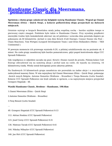 Handzame Classic dla Meersmana, "pomarańczowi" daleko Sprintem z dużej grupy zakończył się belgijski wyścig Handzame Classic. Wygrał go Gianni Meersman (Etixx – Quick Step), a kolarze polkowickiej ekipy przyjechali na dalszych miejscach. Ostatnie wyścigi w krajach Beneluksu miały jedną wspólną cechę – bardzo szybkie tempo w pierwszej części zmagań. Podobnie było także w Handzame Classic. Przy wysokiej prędkości niezwykle trudno było komukolwiek oderwać się od peletonu i ucieczka dnia powstała dopiero po pokonaniu ok.50 kilometrów. Jechali w niej Alex Kirsch (Cult Energy), Connor Dunne (An Post – Chain Reaction), Tom Wirtgen (Leopard Development Team ) and Dries Hollanders (Metec – TKH Continental ). W pewnym momencie ich przewaga wyniosła 6:20, a później ustabilizowała się na poziomie ok. 4 minut. Na czele grupy zasadniczej było bardzo pomarańczowo, gdyż pogoń kontrolowała ekipa CCC Sprandi Polkowice. Gdy współpraca w odjeździe zaczęła się psuć, Kirsch i Dunne ruszyli do przodu. Później kolarz Cult Energy zdecydował się na samotną akcję i jechał sam na czele, do wjazdu na ostatnią, 16 kilometrową rundę. Wtedy został doścignięty przez aktywny peleton. Na finałowych 10 kilometrach grupa zasadnicza nie pozwalała na żadne akcje i o zwycięstwie zadecydował masowy finisz. W nim najszybszy był Gianni Meersman (Etixx – Quick Step), pokonując dwóch innych Belgów, Antoine Demoitie (Wallonie – Bruxelles) i Tiesja Benoota (Lotto Soudal). Kolarze CCC Sprandi Polkowice nie brali udziału w sprincie, a na najwyższym miejscu przyjechał Grzegorz Stępniak – 48. Wyniki Handzame Classic, Bredene – Handzame, 198.6km 1.Gianni Meersman (Etixx – Quick Step) 2.Antoine Demoitie (Wallonie – Bruxelles) 3.Tiesj Benoot (Lotto Soudal) … 49. Grzegorz Stępniak (CCC Sprandi Polkowice) 0:13 112. Adrian Honkisz (CCC Sprandi Polkowice) 123. Josef Cerny (CCC Sprandi Polkowice) 0:31 136. Mateusz Taciak (CCC Sprandi Polkowice) 0:41 144. Nikolay Mihaylov (CCC Sprandi Polkowice) 146. Jan Hirt (CCC Sprandi Polkowice) DNF Jarosław Marycz (CCC Sprandi Polkowice) DNF Christian Delle Stelle (CCC Sprandi Polkowice) Składy CCC Sprandi Polkowice na nadchodzące jednodniówki Dwa składy CCC Sprandi Polkowice będą się ścigać w nadchodzących czterech jednodniówkach, rozgrywanych w Belgii, Holandii i we Włoszech. Dla części ekipy, będzie to ostatni test przed pierwszym głównym celem sezonu – Mediolan – San Remo. Finałowym sprawdzianem przed La Primaverą, będzie dla nas GP Nobili Rubinetterie. Rozgrywany jest on niedaleko Mediolanu i podobnie jak M-SR, także tu zawodnicy zmierzą się w końcówce z dwoma wzniesieniami. Możliwe są zatem dwa scenariusze – albo finisz z małego peletonu, albo oderwanie się na podjazdach ucieczki, która dojedzie do mety. W pierwszym wariancie powalczyć ma szansę Grega Bole, a w drugim, jednym z atakujących może być Maciej Paterski, Sylwester Szmyd lub Davide Rebellin – wyjaśnia Piotr Wadecki, dyrektor sportowy ekipy. Wyścig ma stosunkowo płaski profil i liczy 187,5km. Największą „przeszkodą” na trasie są dwie wspinaczki pod Massino Visconti w końcowej fazie zmagań. Obecni kolarze CCC Sprandi Polkowice mają bardzo dobry bilans w GP Nobili Rubinetterie, gdyż trzykrotnie stawali w nim na podium. Bole triumfował tam w 2009 roku, Rebellin był trzeci dwa lata później, a przed rokiem Christian Delle Stelle zameldował się na 2.pozycji (minimalnie przegrywając z Simone Ponzim w masowym sprincie). Tylko Delle Stelle z tej trójki nie stanie na starcie tegorocznej edycji. 26-letni Włoch będzie w tym czasie rywalizować w krajach Beneluksu – belgijskich Nokere Koerse (18.03) i Handzame Classic (20.03) oraz holenderskim Ronde Van Zeeland Seaports (21.03). Wyścigi te mają typowy dla tego regionu charakter – wąskie, kręte ulice, często pokryte brukiem, prowadzące po krótkich pagórkach. W ostatnich latach warunki na trasie i ukształtowanie terenu nie doprowadziły do większej selekcji i o zwycięstwie decydował finisz z peletonu. Stąd w składzie tacy zawodnicy jak Delle Stelle, czy też Grzegorz Stępniak. W holenderskim Ronde Van Zeeland Seaports chcemy dać też szansę pokazania się młodym kolarzom, ze składu U23. Będą mogli oni spróbować swoich sił w rywalizacji z zawodnikami z ekip World Tour i Professional Continental. Takie „ościganie” się wśród najlepszych, powinno mieć pozytywny wpływ na ich dalszy rozwój – dodaje Piotr Wadecki. Skład na Nokere Koerse – Danilith Classic (18.03): Josef Cerny, Nikolay Mihaylov, Grzegorz Stępniak, Jan Hirt, Jarosław Marycz, Mateusz Taciak, Adrian Honkisz, Christian Delle Stelle. Skład na GP Nobili Rubinetterie (19.03): Grega Bole, Adrian Kurek, Tomasz Kiendyś, Davide Rebellin, Bartłomiej Matysiak, Maciej Paterski, Sylwester Szmyd, Branislau Samoilau Skład na Handzame Classic (20.03): Josef Cerny, Nikolay Mihaylov, Grzegorz Stępniak, Jan Hirt, Jarosław Marycz, Mateusz Taciak, Adrian Honkisz, Christian Delle Stelle. Skład na Ronde Van Zeeland Seaports (21.03): Piotr Brożyna, Nikolay Mihaylov, Grzegorz Stępniak, Jakub Kaczmarek, Leszek Pluciński, Mateusz Taciak, Eryk Latoń, Christian Delle Stelle.