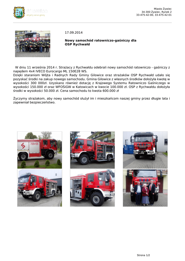 Miasto Żywiec 34-300 Żywiec, Rynek 2 33-475-42-00, 33-475-42-01 17.09.2014 Nowy samochód ratowniczo-gaśniczy dla OSP Rychwałd W dniu 11 września 2014 r. Strażacy z Rychwałdu odebrali nowy samochód ratowniczo - gaśniczy z napędem 4x4 IVECO Eurocargo ML 150E28 WS. Dzięki staraniom Wójta i Radnych Rady Gminy Gilowice oraz strażaków OSP Rychwałd udało się pozyskać środki na zakup nowego samochodu. Gmina Gilowice z własnych środków dołożyła kwotę w wysokości 300 000zł. Uzyskano również dotację z Krajowego Systemu Ratowniczo Gaśniczego w wysokości 150.000 zł oraz WFOŚiGW w Katowicach w kwocie 100.000 zł. OSP z Rychwałdu dołożyła środki w wysokości 50.000 zł. Cena samochodu to kwota 600.000 zł Życzymy strażakom, aby nowy samochód służył im i mieszkańcom naszej gminy przez długie lata i zapewniał bezpieczeństwo. Strona 1/2 Miasto Żywiec 34-300 Żywiec, Rynek 2 33-475-42-00, 33-475-42-01 Strona 2/2 Powered by TCPDF (www.tcpdf.org)