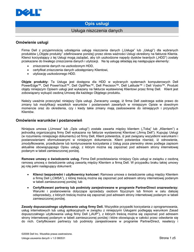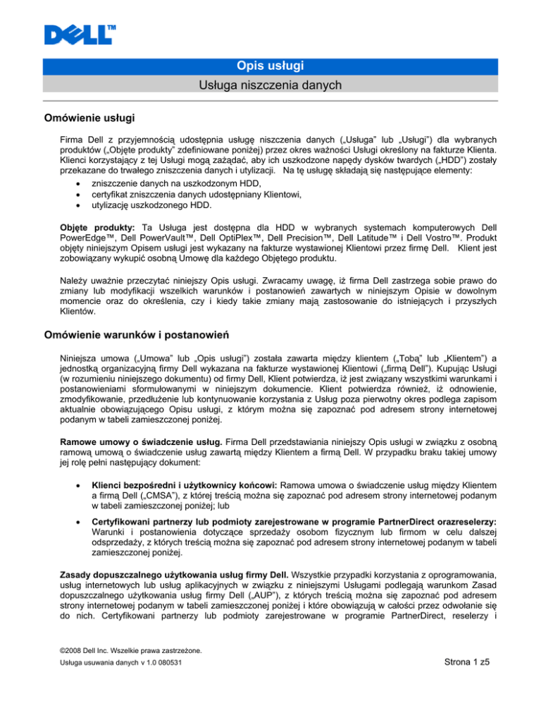 Opis usługi Usługa niszczenia danych Omówienie usługi Firma Dell z przyjemnością udostępnia usługę niszczenia danych („Usługa” lub „Usługi”) dla wybranych produktów („Objęte produkty” zdefiniowane poniżej) przez okres ważności Usługi określony na fakturze Klienta. Klienci korzystający z tej Usługi mogą zażądać, aby ich uszkodzone napędy dysków twardych („HDD”) zostały przekazane do trwałego zniszczenia danych i utylizacji. Na tę usługę składają się następujące elementy: • • • zniszczenie danych na uszkodzonym HDD, certyfikat zniszczenia danych udostępniany Klientowi, utylizację uszkodzonego HDD. Objęte produkty: Ta Usługa jest dostępna dla HDD w wybranych systemach komputerowych Dell PowerEdge™, Dell PowerVault™, Dell OptiPlex™, Dell Precision™, Dell Latitude™ i Dell Vostro™. Produkt objęty niniejszym Opisem usługi jest wykazany na fakturze wystawionej Klientowi przez firmę Dell. Klient jest zobowiązany wykupić osobną Umowę dla każdego Objętego produktu. Należy uważnie przeczytać niniejszy Opis usługi. Zwracamy uwagę, iż firma Dell zastrzega sobie prawo do zmiany lub modyfikacji wszelkich warunków i postanowień zawartych w niniejszym Opisie w dowolnym momencie oraz do określenia, czy i kiedy takie zmiany mają zastosowanie do istniejących i przyszłych Klientów. Omówienie warunków i postanowień Niniejsza umowa („Umowa” lub „Opis usługi”) została zawarta między klientem („Tobą” lub „Klientem”) a jednostką organizacyjną firmy Dell wykazana na fakturze wystawionej Klientowi („firmą Dell”). Kupując Usługi (w rozumieniu niniejszego dokumentu) od firmy Dell, Klient potwierdza, iż jest związany wszystkimi warunkami i postanowieniami sformułowanymi w niniejszym dokumencie. Klient potwierdza również, iż odnowienie, zmodyfikowanie, przedłużenie lub kontynuowanie korzystania z Usług poza pierwotny okres podlega zapisom aktualnie obowiązującego Opisu usługi, z którym można się zapoznać pod adresem strony internetowej podanym w tabeli zamieszczonej poniżej. Ramowe umowy o świadczenie usług. Firma Dell przedstawiania niniejszy Opis usługi w związku z osobną ramową umową o świadczenie usług zawartą między Klientem a firmą Dell. W przypadku braku takiej umowy jej rolę pełni następujący dokument: • Klienci bezpośredni i użytkownicy końcowi: Ramowa umowa o świadczenie usług między Klientem a firmą Dell („CMSA”), z której treścią można się zapoznać pod adresem strony internetowej podanym w tabeli zamieszczonej poniżej; lub • Certyfikowani partnerzy lub podmioty zarejestrowane w programie PartnerDirect orazreselerzy: Warunki i postanowienia dotyczące sprzedaży osobom fizycznym lub firmom w celu dalszej odsprzedaży, z których treścią można się zapoznać pod adresem strony internetowej podanym w tabeli zamieszczonej poniżej. Zasady dopuszczalnego użytkowania usług firmy Dell. Wszystkie przypadki korzystania z oprogramowania, usług internetowych lub usług aplikacyjnych w związku z niniejszymi Usługami podlegają warunkom Zasad dopuszczalnego użytkowania usług firmy Dell („AUP”), z których treścią można się zapoznać pod adresem strony internetowej podanym w tabeli zamieszczonej poniżej i które obowiązują w całości przez odwołanie się do nich. Certyfikowani partnerzy lub podmioty zarejestrowane w programie PartnerDirect, reselerzy i ©2008 Dell Inc. Wszelkie prawa zastrzeżone. Usługa usuwania danych v 1.0 080531 Strona 1 z5 usługodawcy są zobowiązani dopilnować, aby ich klienci będący użytkownikami końcowymi przez rozpoczęciem korzystania z Usług wyrazili zgodę na związane warunkami i postanowieniami zasad AUP. Procedury świadczenia wsparcia technicznego W przypadku wystąpienia problemów lub podejrzenia uszkodzenia HDD Klienci powinni kontaktować się z działem pomocy technicznej zgodnie ze stosowną umową serwisową Klienta. Klienci uzyskają telefoniczną pomoc techniczną dotyczącą rozwiązywania problemów zgodnie z posiadaną umową serwisową. Jeśli technik serwisowy firmy Dell ustali, że w HDD wystąpił problem objęty ograniczoną gwarancją sprzętową firmy Dell, firma Dell wyśle do Klienta nowy HDD zgodnie ze stosowną umową serwisową danego Klienta (np. dostawa w ciągu 4 godzin lub następnego dnia roboczego). Ta Usługa umożliwia Klientowi zwrócenie uszkodzonego HDD w celu trwałego zniszczenia danych i utylizacji uszkodzonego HDD. Po otrzymaniu uszkodzonego HDD przez regionalne laboratorium odzyskiwania, zostanie zainicjowany proces niszczenia, a dane rejestracyjne dotyczące danego zgłoszenia zostaną przekazane do portalu firmy Dell przedstawiającego stan ochrony danych pod adresem www.dell.com/dataprotectionportal. W trakcie niszczenia danych Klient może się zalogować do portalu w celu sprawdzenia stanu zwróconego sprzętu, kasowania danych i utylizacji HDD. Po zniszczeniu danych przez rozmagnesowanie HDD stan w portalu zostanie uaktualniony w celu odzwierciedlenia zakończonego procesu. Klient może pobrać z portalu certyfikat skasowania potwierdzający zniszczenie danych. Uszkodzony i rozmagnesowany HDD zostanie następnie zutylizowany w bezpieczny dla środowiska sposób zatwierdzony przez firmę Dell. Usługa nie uprawniania do: • • • • • odtworzenia danych lub wykonania kopii zapasowej danych; takich czynności, jak instalacja, deinstalacja, przeniesienie, konserwacja zapobiegawcza, pomoc szkoleniowa, zdalne administrowanie; pomocy technicznej w przypadku szkód powstałych przy przenoszeniu Objętego produktu do innej lokalizacji bądź do innego oddziału; jakichkolwiek czynności lub usług nieokreślonych wyraźnie w niniejszym Opisie usługi; ta usługa jest niedostępna dla klientów, którzy kupili usługę Zachowaj swój dysk twardy firmy Dell. Obowiązki klienta • • • • • • Zgłoszenie każdego wystąpienia aw