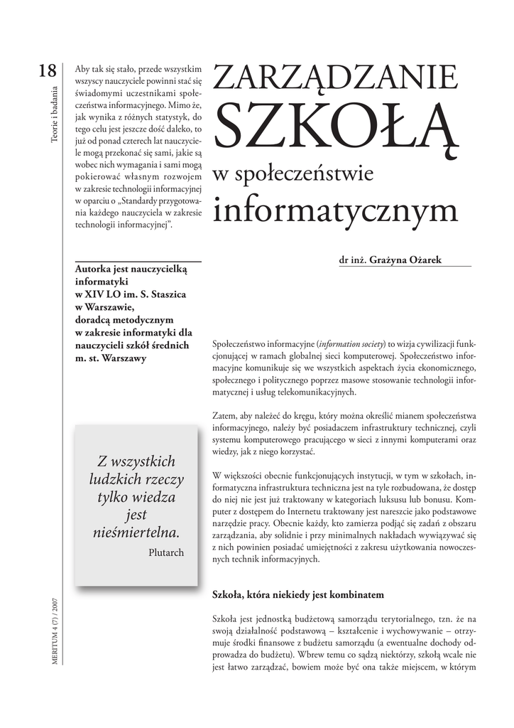 Teorie i badania 1 Aby tak się stało, przede wszystkim wszyscy nauczyciele powinni stać się świadomymi uczestnikami społeczeństwa informacyjnego. Mimo że, jak wynika z różnych statystyk, do tego celu jest jeszcze dość daleko, to już od ponad czterech lat nauczyciele mogą przekonać się sami, jakie są wobec nich wymagania i sami mogą pokierować własnym rozwojem w zakresie technologii informacyjnej w oparciu o „Standardy przygotowania każdego nauczyciela w zakresie technologii informacyjnej”. Autorka jest nauczycielką informatyki w XIV LO im. S. Staszica w Warszawie, doradcą metodycznym w zakresie informatyki dla nauczycieli szkół średnich m. st. Warszawy Z wszystkich ludzkich rzeczy tylko wiedza jest nieśmiertelna. MERITUM 4 (7) / 2007 Plutarch ZARZĄDZANIE SZKOŁĄ w społeczeństwie informatycznym dr inż. Grażyna Ożarek Społeczeństwo informacyjne (information society) to wizja cywilizacji funkcjonującej w ramach globalnej sieci komputerowej. Społeczeństwo informacyjne komunikuje się we wszystkich aspektach życia ekonomicznego, społecznego i politycznego poprzez masowe stosowanie technologii informatycznej i usług telekomunikacyjnych. Zatem, aby należeć do kręgu, który można określić mianem społeczeństwa informacyjnego, należy być posiadaczem infrastruktury technicznej, czyli systemu komputerowego pracującego w sieci z innymi komputerami oraz wiedzy, jak z niego korzystać. W większości obecnie funkcjonujących instytucji, w tym w szkołach, informatyczna infrastruktura techniczna jest na tyle rozbudowana, że dostęp do niej nie jest już traktowany w kategoriach luksusu lub bonusu. Komputer z dostępem do Internetu traktowany jest nareszcie jako podstawowe narzędzie pracy. Obecnie każdy, kto zamierza podjąć się zadań z obszaru zarządzania, aby solidnie i przy minimalnych nakładach wywiązywać się z nich powinien posiadać umiejętności z zakresu użytkowania nowoczesnych technik informacyjnych. Szkoła, która niekiedy jest kombinatem Szkoła jest jednostką budżetową samorządu terytorialnego, tzn. że na swoją działalność podstawową – kształcenie i wychowywanie – otrzymuje środki finansowe z budżetu samorządu (a ewentualne dochody odprowadza do budżetu). Wbrew temu co sądzą niektórzy, szkołą wcale nie jest łatwo zarządzać, bowiem może być ona także miejscem, w którym Zatem szkoła przy pewnym splocie okoliczności może być średniej wielkości zakładem pracy (z uwagi na liczbę zatrudnionych), ale także złożonym „przedsiębiorstwem” o dość rozbudowanej strukturze. Głównym zadaniem dyrektora i podstawową funkcją szkoły jest oczywiście organizacja procesu dydaktycznego i wychowawczego, ale jak wynika z przytoczonych przykładów, czasami to podstawowe zadanie pociąga za sobą jeszcze inne dodatkowe, które są komplementarne i wspomagają realizację celów statutowych. Zatem dla dyrektora, który podejmie się zarządzania takim swoistym kombinatem, jest to nie lada wyzwanie. Zadania dyrektora szkoły Zarówno dyrektor małej szkoły, jak i dyrektor swoistego kombinatu edukacyjnego jest przede wszystkim kierownikiem zakładu pracy. Zgodnie z art. 7 Karty Nauczyciela dyrektor: 1. jest przełożonym służbowym wszystkich pracowników szkoły, 2. odpowiada za poziom dydaktyczny i wychowawczy placówki, 3. zobowiązany jest do tworzenia warunków sprzyjających samorządnej i samodzielnej pracy uczniów i wychowanków oraz do zapewnienia pomocy nauczycielom w realizacji ich zadań, 4. powinien zapewnić, w miarę możliwości, odpowiednie warunki organizacyjne do realizacji zadań dydaktycznych i opiekuńczo-wychowawczych szkoły. W ustawie o systemie oświaty kompetencje dyrektora zawarte są w art. 39. W myśl ustawy, do jego podstawowych zadań należy m.in.: 19 Teorie i badania 1. kierowanie działalnością szkoły i reprezentowanie jej na zewnątrz, 2. sprawowanie nadzoru pedagogicznego, 3. sprawowanie opieki nad uczniami oraz stwarzanie im warunków do harmonijnego rozwoju psychofizycznego poprzez działania prozdrowotne, 4. realizacja uchwał rady pedagogicznej, 5. zarządzanie budżetem szkoły, 6. zatrudnianie i zwalnianie pracowników, 7. wykonywanie innych zadań wynikających z przepisów szczegółowych. Warto podkreślić, że dyrektor jest także przewodniczącym i członkiem rady pedagogicznej (art. 40 i 41) oraz przedstawicielem administracji publicznej. Dyrektor szkoły i jego obowiązki Przytoczone powyżej podstawowe zadania dyrektora szkoły umożliwiają sformułowanie wypływających z nich obowiązków. Szczegółowy zakres obowiązków i odpowiedzialności dyrektora szkoły można znaleźć w zarządzeniu MEN z dnia 8 kwietnia 1997 r. w sprawie zadań nauczycieli, którym powierzono stanowiska kierownicze w szkole. W art. 3 cytowanego zarządzenia zawarty jest zbiór kilkudziesięciu obowiązków dyrektora wynikających wprost z funkcji zrządzania, czyli planowania, organizacji, kierowania i nadzorowania. Dyrektor jest zobowiązany między innymi do: 1. współdziałania z organem prowadzącym w zakresie realizacji zadań, 2. przedkładania interesariuszom szkoły – do zaopiniowania lub zatwierdzenia – projektów planów pracy szkoły, 3. ustalania – po zasięgnięciu opinii rady pedagogicznej – organizacji pracy szkoły, w tym zwłaszcza tygodniowego rozkładu zajęć lekcyjnych i pozalekcyjnych, 4. przedkładania radzie pedagogicznej – w celu podjęcia uchwały – projektów, innowacji i eksperymentów pedagogicznych, 5. opracowywania i realizowania planu finansowego szkoły, stosowania się do przepisów określających zasady gospodarki finansowej szkół oraz przedstawiania projektu do zaopiniowania radzie pedagogicznej i radzie szkoły, 6. przydzielania nauczycielom, w uzgodnieniu z radą pedagogiczną, prac i zajęć w ramach wynagrodzenia zasadniczego oraz dodatkowo płatnych zajęć dydaktycznych, wychowawczych i opiekuńczych, M