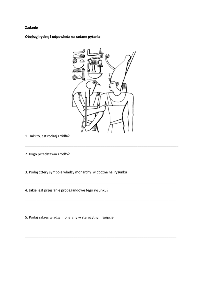 Zadanie Obejrzyj rycinę i odpowiedz na zadane pytania 1. Jaki to jest rodzaj źródła? _______________________________________________________________________________ 2. Kogo przedstawia źródło? ______________________________________________________________________________ 3. Podaj cztery symbole władzy monarchy widoczne na rysunku ______________________________________________________________________________ 4. Jakie jest przesłanie propagandowe tego rysunku? ______________________________________________________________________________ ______________________________________________________________________________ 5. Podaj zakres władzy monarchy w starożytnym Egipcie ______________________________________________________________________________ ______________________________________________________________________________