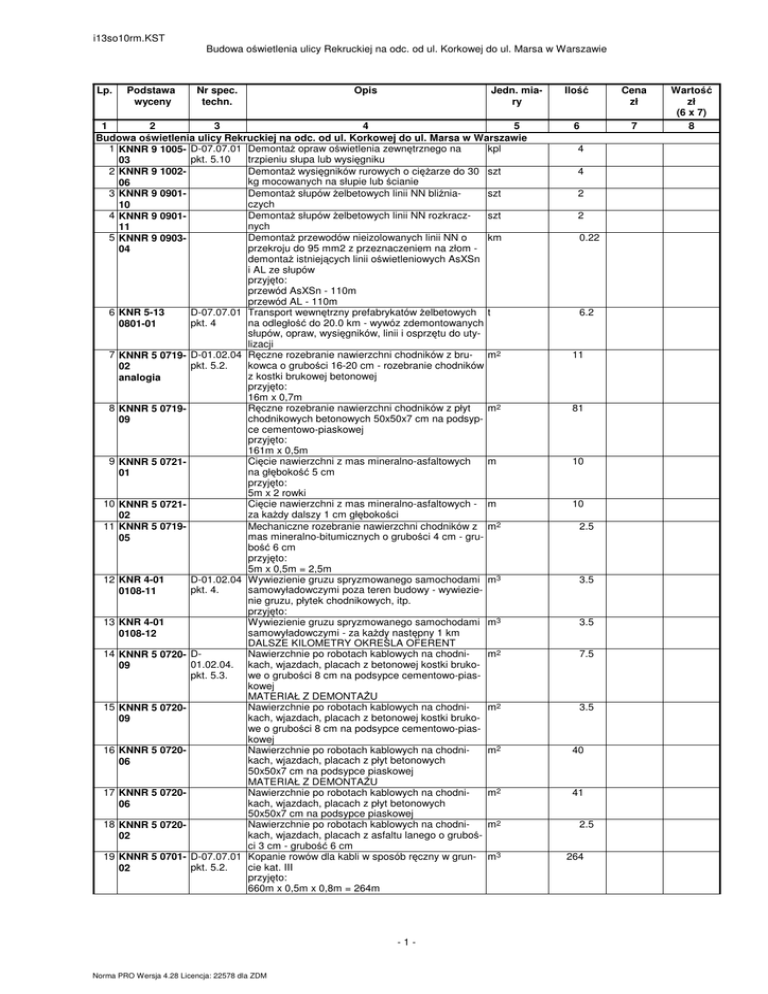 i13so10rm.KST Budowa oświetlenia ulicy Rekruckiej na odc. od ul. Korkowej do ul. Marsa w Warszawie Lp. Podstawa wyceny Nr spec. techn. Opis Jedn. miary 1 2 3 4 5 Budowa oświetlenia ulicy Rekruckiej na odc. od ul. Korkowej do ul. Marsa w Warszawie 1 KNNR 9 1005- D-07.07.01 Demontaż opraw oświetlenia zewnętrznego na kpl pkt. 5.10 trzpieniu słupa lub wysięgniku 03 2 KNNR 9 1002Demontaż wysięgników rurowych o ciężarze do 30 szt kg mocowanych na słupie lub ścianie 06 3 KNNR 9 0901Demontaż słupów żelbetowych linii NN bliźniaszt czych 10 4 KNNR 9 0901Demontaż słupów żelbetowych linii NN rozkraczszt nych 11 5 KNNR 9 0903Demontaż przewodów nieizolowanych linii NN o km przekroju do 95 mm2 z przeznaczeniem na złom 04 demontaż istniejących linii oświetleniowych AsXSn i AL ze słupów przyjęto: przewód AsXSn - 110m przewód AL - 110m 6 KNR 5-13 D-07.07.01 Transport wewnętrzny prefabrykatów żelbetowych t pkt. 4 na odległość do 20.0 km - wywóz zdemontowanych 0801-01 słupów, opraw, wysięgników, linii i osprzętu do utylizacji 7 KNNR 5 0719- D-01.02.04 Ręczne rozebranie nawierzchni chodników z bru- m2 pkt. 5.2. kowca o grubości 16-20 cm - rozebranie chodników 02 z kostki brukowej betonowej analogia przyjęto: 16m x 0,7m 8 KNNR 5 0719Ręczne rozebranie nawierzchni chodników z płyt m2 chodnikowych betonowych 50x50x7 cm na podsyp09 ce cementowo-piaskowej przyjęto: 161m x 0,5m 9 KNNR 5 0721Cięcie nawierzchni z mas mineralno-asfaltowych m na głębokość 5 cm 01 przyjęto: 5m x 2 rowki 10 KNNR 5 0721Cięcie nawierzchni z mas mineralno-asfaltowych - m za każdy dalszy 1 cm głębokości 02 11 KNNR 5 0719Mechaniczne rozebranie nawierzchni chodników z m2 mas mineralno-bitumicznych o grubości 4 cm - gru05 bość 6 cm przyjęto: 5m x 0,5m = 2,5m 12 KNR 4-01 D-01.02.04 Wywiezienie gruzu spryzmowanego samochodami m3 pkt. 4. samowyładowczymi poza teren budowy - wywiezie0108-11 nie gruzu, płytek chodnikowych, itp. przyjęto: 13 KNR 4-01 Wywiezienie gruzu spryzmowanego samochodami m3 samowyładowczymi - za każdy następny 1 km 0108-12 DALSZE KILOMETRY OKREŚLA OFERENT 14 KNNR 5 0720- DNawierzchnie po robotach kablowych na chodnim2 01.02.04. kach, wjazdach, placach z betonowej kostki bruko09 pkt. 5.3. we o grubości 8 cm na podsypce cementowo-piaskowej MATERIAŁ Z DEMONTAŻU 15 KNNR 5 0720Nawierzchnie po robotach kablowych na chodnim2 kach, wjazdach, placach z betonowej kostki bruko09 we o grubości 8 cm na podsypce cementowo-piaskowej 16 KNNR 5 0720Nawierzchnie po robotach kablowych na chodnim2 kach, wjazdach, placach z płyt betonowych 06 50x50x7 cm na podsypce piaskowej MATERIAŁ Z DEMONTAŻU 17 KNNR 5 0720Nawierzchnie po robotach kablowych na chodnim2 kach, wjazdach, placach z płyt betonowych 06 50x50x7 cm na podsypce piaskowej 18 KNNR 5 0720Nawierzchnie po robotach kablowych na chodnim2 kach, wjazdach, placach z asfaltu lanego o gruboś02 ci 3 cm - grubość 6 cm 19 KNNR 5 0701- D-07.07.01 Kopanie rowów dla kabli w sposób ręczny w grun- m3 pkt. 5.2. cie kat. III 02 przyjęto: 660m x 0,5m x 0,8m = 264m -1- Norma PRO Wersja 4.28 Licencja: 22578 dla ZDM Ilość Cena zł 6 7 4 4 2 2 0.22 6.2 11 81 10 10 2.5 3.5 3.5 7.5 3.5 40 41 2.5 264 Wartość zł (6 x 7) 8 i13so10rm.KST Budowa oświetlenia ulicy Rekruckiej na odc. od ul. Korkowej do ul. Marsa w Warszawie Lp. Podstawa wyceny 1 2 20 KNNR 5 072402 Nr spec. techn. Opis 3 4 Wykopy pionowe ręczne dla urządzenia przeciskowego wraz z jego zasypaniem w gruncie nienawodnionym kat.III-IV przyjęto: 2 przepusty x 2 doły = 4 doły 4 doły x 2m3 = 8m3 Zasypywanie rowów dla kabli wykonanych ręcznie w gruncie kat. III Zabezpieczenie drzew o średnicy do 30 cm na okres wykonywania robót ziemnych - zabezpieczenie drzew podczas wykonywania robót, nawadnianie Wykonanie trawników dywanowych siewem na gruncie kat. III z nawożeniem Przewierty mechaniczne dla rury o śr.do 125 mm pod obiektami SRS-110 Przewierty mechaniczne dla ruro śr.do 125 mm pod obiektami - dodatek za każdą następną rurę w wiązce - montaż przepustów rurami sztywnymi, gładkimi z PCW o śr. 110 mm (druga- rura) - SRS 110 Ułożenie rur osłonowych z PCW o śr.do 140 mm montaż rur sztywnych, gładkich z PCW o śr. 110 mm w rowie kablowym - SRS 110 Ułożenie rur osłonowych z PCW o śr.do 140 mm montaż rur giętkich, karbowanych z PCW o śr. 110 mm w rowie kablowym - DVK 110 Układanie kabli o masie do 1.0 kg/m w rurach, pustakach lub kanałach zamkniętych - wciągnięcie kabla YKYżo 5x25 mm2 w rury osłonowe, fundamenty słupów + zapasy eksploatacyjne itp. przyjęto: kabel w rury - 691m kabel w słup + zapas - 34 wciągnięcia x 3m = 102 m łącznie: 793m Montaż uziomów poziomych w wykopie o głębokości do 0.6 m; kat.gruntu III - montaż bednarki FeZn 25x4 mm w rowie kablowym Przewody uziemiające i wyrównawcze w kanałach lub tunelach luzem (bednarka o przekroju do 200 mm2) - wciągnięcie bednarki FeZn 25x4 mm w słupy, fundamenty itp. przyjęto: 4 wciągnięcia x 3m =12m Montaż i stawianie słupów oświetleniowych o masie do 300 kg - montaż słupów aluminiowych, anodowanych, cylindryczno-stożkowych dwuelementowych posadowionych na fundamentach prefabrykowanych realizujących zawiesznie oprawy na 10m, posiadające fabrycznie zabezpieczenie stopy słupowej elastomerem. przyjęto: - słup aluminiowy np. typu SAL - 10, wraz z wysięgnikiem jednoramiennym o wysięgu 1,5m - fundament prefabrykowany do słupa aluminiowego - tabliczka słupowa Montaż przewodów do opraw oświetleniowych wciąganie w słupy, rury osłonowe i wysięgniki przy wysokości latarń do 10 m - YDY 3x2,5mm2 przyjęto: 17słupów x 10m = 170m Montaż opraw oświetlenia zewnętrznego na wysięgniku - montaż dwukomorowych oprawy sodowych, szczelnych, o mocy 150W, konstrukcji zamkniętej i stopniu ochrony IP 66 dla całej oprawy łącznie z komorą układu stabilizująco - zapłonowego, posiadające optykę "Opti-C", np. oprawa SGS 453 o mocy 150W, w I klasie 