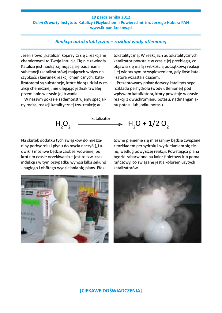 19 października 2012 Dzień Otwarty Instytutu Katalizy i Fizykochemii Powierzchni im. Jerzego Habera PAN www.ik-pan.krakow.pl Reakcja autokatalityczna – rozkład wody utlenionej Jeżeli słowo „kataliza” kojarzy Ci się z reakcjami chemicznymi to Twoja intuicja Cię nie zawiodła. Kataliza jest nauką zajmującą się badaniami substancji (katalizatorów) mających wpływ na szybkość i kierunek reakcji chemicznych. Katalizatorami są substancje, które biorą udział w reakcji chemicznej, nie ulegając jednak trwałej przemianie w czasie jej trwania. W naszym pokazie zademonstrujemy specjalny rodzaj reakcji katalitycznej tzw. reakcję au- H2O2 katalizator Na skutek dodatku tych związków do mieszaniny perhydrolu i płynu do mycia naczyń („Ludwik”) możliwe będzie zaobserwowanie, po krótkim czasie oczekiwania – jest to tzw. czas indukcji i w tym przypadku wynosi kilka sekund - nagłego i obfitego wydzielania się piany. Efek- tokatalityczną. W reakcjach autokatalitycznych katalizator powstaje w czasie jej przebiegu, co objawia się małą szybkością początkową reakcji i jej widocznym przyspieszeniem, gdy ilość katalizatora wzrasta z czasem. Prezentowany pokaz dotyczy katalitycznego rozkładu perhydrolu (wody utlenionej) pod wpływem katalizatora, który powstaje w czasie reakcji z dwuchromianu potasu, nadmanganianu potasu lub jodku potasu. H2O + 1/2 O2 towne pienienie się mieszaniny będzie związane z rozkładem perhydrolu i wydzielaniem się tlenu, według powyższej reakcji. Powstająca piana będzie zabarwiona na kolor fioletowy lub pomarańczowy, co związane jest z kolorem użytych katalizatorów. [CIEKAWE DOŚWIADCZENIA]