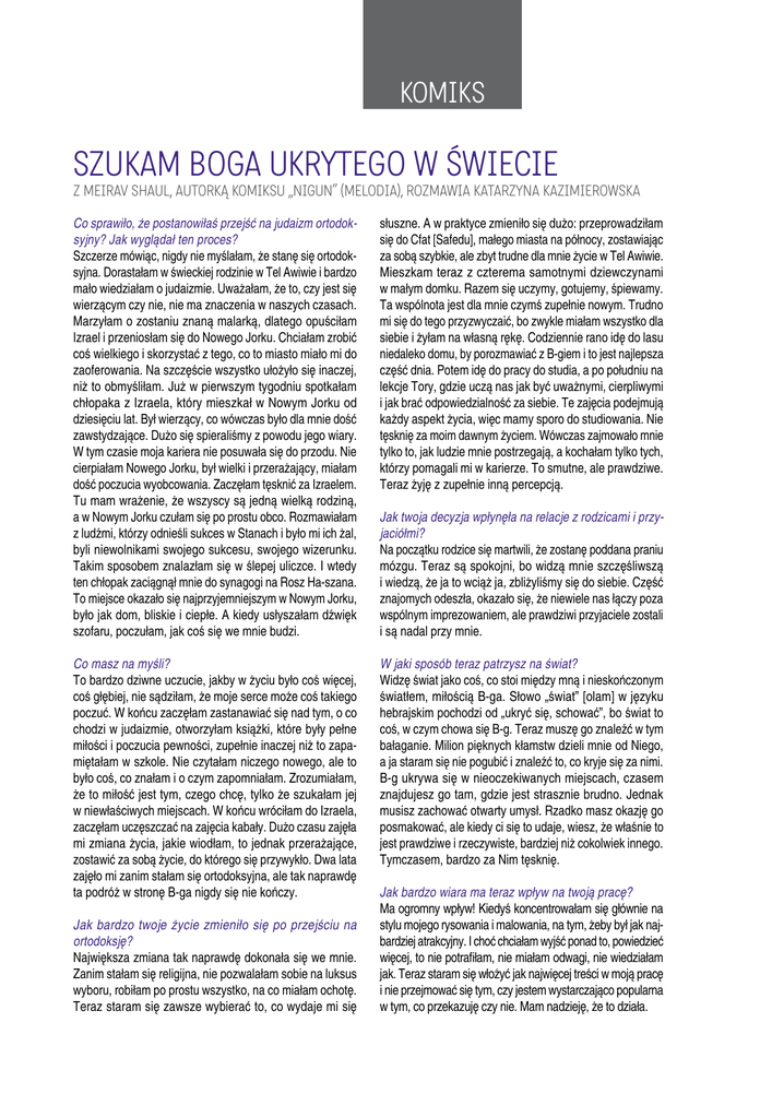 komiks Szukam Boga ukrytego w świecie Z Meirav Shaul, autorką komiksu „Nigun” (Melodia), rozmawia Katarzyna Kazimierowska Co sprawiło, że postanowiłaś przejść na judaizm ortodoksyjny? Jak wyglądał ten proces? Szczerze mówiąc, nigdy nie myślałam, że stanę się ortodoksyjna. Dorastałam w świeckiej rodzinie w Tel Awiwie i bardzo mało wiedziałam o judaizmie. Uważałam, że to, czy jest się wierzącym czy nie, nie ma znaczenia w naszych czasach. Marzyłam o zostaniu znaną malarką, dlatego opuściłam Izrael i przeniosłam się do Nowego Jorku. Chciałam zrobić coś wielkiego i skorzystać z tego, co to miasto miało mi do zaoferowania. Na szczęście wszystko ułożyło się inaczej, niż to obmyśliłam. Już w pierwszym tygodniu spotkałam chłopaka z Izraela, który mieszkał w Nowym Jorku od dziesięciu lat. Był wierzący, co wówczas było dla mnie dość zawstydzające. Dużo się spieraliśmy z powodu jego wiary. W tym czasie moja kariera nie posuwała się do przodu. Nie cierpiałam Nowego Jorku, był wielki i przerażający, miałam dość poczucia wyobcowania. Zaczęłam tęsknić za Izraelem. Tu mam wrażenie, że wszyscy są jedną wielką rodziną, a w Nowym Jorku czułam się po prostu obco. Rozmawiałam z ludźmi, którzy odnieśli sukces w Stanach i było mi ich żal, byli niewolnikami swojego sukcesu, swojego wizerunku. Takim sposobem znalazłam się w ślepej uliczce. I wtedy ten chłopak zaciągnął mnie do synagogi na Rosz Ha-szana. To miejsce okazało się najprzyjemniejszym w Nowym Jorku, było jak dom, bliskie i ciepłe. A kiedy usłyszałam dźwięk szofaru, poczułam, jak coś się we mnie budzi. słuszne. A w praktyce zmieniło się dużo: przeprowadziłam się do Cfat [Safedu], małego miasta na północy, zostawiając za sobą szybkie, ale zbyt trudne dla mnie życie w Tel Awiwie. Mieszkam teraz z czterema samotnymi dziewczynami w małym domku. Razem się uczymy, gotujemy, śpiewamy. Ta wspólnota jest dla mnie czymś zupełnie nowym. Trudno mi się do tego przyzwyczaić, bo zwykle miałam wszystko dla siebie i żyłam na własną rękę. Codziennie rano idę do lasu niedaleko domu, by porozmawiać z B-giem i to jest najlepsza część dnia. Potem idę do pracy do studia, a po południu na lekcje Tory, gdzie uczą nas jak być uważnymi, cierpliwymi i jak brać odpowiedzialność za siebie. Te zajęcia podejmują każdy aspekt życia, więc mamy sporo do studiowania. Nie tęsknię za moim dawnym życiem. Wówczas zajmowało mnie tylko to, jak ludzie mnie postrzegają, a kochałam tylko tych, którzy pomagali mi w karierze. To smutne, ale prawdziwe. Teraz żyję z zupełnie inną percepcją. Co masz na myśli? To bardzo dziwne uczucie, jakby w życiu było coś więcej, coś głębiej, nie sądziłam, że moje serce może coś takiego poczuć. W końcu zaczęłam zastanawiać się nad tym, o co chodzi w judaizmie, otworzyłam książki, które były pełne miłości i poczucia pewności, zupełnie inaczej niż to zapamiętałam w szkole. Nie czytałam niczego nowego, ale to było coś, co znałam i o czym zapomniałam. Zrozumiałam, że to miłość jest tym, czego chcę, tylko że szukałam jej w niewłaściwych miejscach. W końcu wróciłam do Izraela, zaczęłam uczęszczać na zajęcia kabały. Dużo czasu zajęła mi zmiana życia, jakie wiodłam, to jednak przerażające, zostawić za sobą życie, do którego się przywykło. Dwa lata zajęło mi zanim stałam się ortodoksyjna, ale tak naprawdę ta podróż w stronę B-ga nigdy się nie kończy. W jaki sposób teraz patrzysz na świat? Widzę świat jako coś, co stoi między mną i nieskończonym światłem, miłością B-ga. Słowo „świat” [olam] w języku hebrajskim pochodzi od „ukryć się, schować”, bo świat to coś, w czym chowa się B-g. Teraz muszę go znaleźć w tym bałaganie. Milion pięknych kłamstw dzieli mnie od Niego, a ja staram się nie pogubić i znaleźć to, co kryje się za nimi. B-g ukrywa się w nieoczekiwanych miejscach, czasem znajdujesz go tam, gdzie jest strasznie brudno. Jednak musisz zachować otwarty umysł. Rzadko masz okazję go posmakować, ale kiedy ci się to udaje, wiesz, że właśnie to jest prawdziwe i rzeczywiste, bardziej niż cokolwiek innego. Tymczasem, bardzo za Nim tęsknię. Jak bardzo twoje życie zmieniło się po przejściu na ortodoksję? Największa zmiana tak naprawdę dokonała się we mnie. Zanim stałam się religijna, nie pozwalałam sobie na luksus wyboru, robiłam po prostu wszystko, na co miałam ochotę. Teraz staram się zawsze wybierać to, co wydaje mi się Jak twoja decyzja wpłynęła na relacje z rodzicami i przyjaciółmi? Na początku rodzice się martwili, że zostanę poddana praniu mózgu. Teraz są spokojni, bo widzą mnie szczęśliwszą i wiedzą, że ja to wciąż ja, zbliżyliśmy się do siebie. Część znajomych odeszła, okazało się, że niewiele nas łączy poza wspólnym imprezowaniem, ale prawdziwi przyjaciele zostali i są nadal przy mnie. Jak bardzo wiara ma teraz wpływ na twoją pracę? Ma ogromny wpływ! Kiedyś koncentrowałam się głównie na stylu mojego rysowania i malowania, na tym, żeby był jak najbardziej atrakcyjny. I choć chciałam wyjść ponad to, powiedzieć więcej, to nie potrafiłam, nie miałam odwagi, nie wiedziałam jak. Teraz staram się włożyć jak najwięcej treści w moją pracę i nie przejmować się tym, czy jestem wystarczająco popularna w tym, co przekazuję czy nie. Mam nadzieję, że to działa.