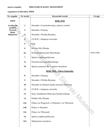 nazwa zespołu: PREZYDIUM RADY MINISTRÓW sygnatura archiwalna: PRM. Nr zespołu Zawartość teczki Nr teczki PRM ROK 1939 Th Archiwum osobiste Prezesa Rady Ministrów Uwagi e 1 Stosunki z Czechosłowacją i sprawy czeskie 2 Stosunki z Francją 3 Stosunki z Wielką Brytanią Po 4 Z.S.R.R. i okupacja sowiecka lis 5 h 6 Kraj Polskie Siły Zbrojne 7 st In 7a Przemówienia gen.Sikorskiego 7b Sprawa amnestii dla więźniów brzeskich 6a Korespondencja gen.Sikorskiego 1939-1940 Sprawy ogólno-polityczne te itu d an ROK 1940 – Okres francuski. Stosunki z Francją 9 Stosunki z Wielką Brytanią 10 Stosunki ze Stanami Zjedn.Ameryki Północnej 11 Z.S.R.R. i okupacja sowiecka 12 Kraj i działalność Biura gen.Sosnkowskiego 13 Polskie Siły Zbrojne 14a Polacy na Węgrzech, w Rumunii i we Włoszech 14b Polacy w Rumunii 14c Polacy we Włoszech 15 Sprawy ogólno-polityczne 15a Mniejszości narodowe rs ko Si 8 ki m eu us M nazwa zespołu: PREZYDIUM RADY MINISTRÓW sygnatura archiwalna: PRM. Nr teczki PRM 16 Sprawa pomocy Finlandii Archiwum osobiste Prezesa Rady Ministrów 17 Złoto Banku Polskiego 18 Pusty numer Th Nr zespołu Zawartość teczki Uwagi e Po ROK 1940- Po ewakuacji do W.Brytanii. Stosunki z Czechosłowacją i sprawy czeskie 20 Stosunki z Wielką Brytanią lis 19 h Stosunki ze Stanami Zjednoczonymi Ameryki Północnej 22 st In 21 23 Okupacja sowiecka 24 Kraj 25 Kraj i działalność Biura gen.Sosnkowskiego 26 Polskie Siły Zbrojne 27 Polacy w Ameryce Południowej 28 Polacy na kontynencie 29 Akcja Kontynentalna 30 Sprawa Finlandii 31 Złoto Banku Polskiego 32 Stosunki z Rumunią, Włochami, Francją i Japonią 33 Ogólny przegląd sytuacji światowej 34 Powojenna organizacja Europy 35 Ogólne wytyczne polskiej polityki 35a Przemówienia gen. Sikorskiego 36 Mniejszości narodowe Stosunki z Z.S.R.R. te itu d an Znajduje się duża ilość akt z okresu Francji. rs ko Si ki m eu us M nazwa zespołu: PREZYDIUM RADY MINISTRÓW sygnatura archiwalna: PRM. Nr teczki PRM 37a Korespondencja N.W.z gen.Kukielem Archiwum osobiste Prezesa Rady Ministrów 37b Różne sprawy polityczne 37c Przesilenie lipcowe Th Nr zespołu Zawartość teczki Uwagi e Dziennik podawczy 37d Po lis ROK 1941 h Stosunki z Czechosłowacją i sprawy czeskie Generał Sikorski – Prez. Benesz – Korespondencja - Memoriały 38b st In 38a 38c Projekty Zasad Aktu Konstytucyjnego Związku Polski i Czechosłowacji 38d Mieszany Komitet Koordynacyjny polsko-czechosłowacki Protokóły 38e Stosunki polsko-czechosłowackie. Sprawozdania ze spotkań i rozmów 38f Stosunki polsko-czechosłowackie. Sprawozdania prasowe 38g Stosunki polsko-czechosłowackie. Przemówienia prezydenta Benesza 38h Stosunki polsko-czechosłowackie. Odczyty i wywiady prasowe 38i Stosunki polsko-czechosłowackie. Różne. 39a Stosunki z Wielką Brytanią. Korespondencja, memoranda, przemówienia 39b Stosunki z Wielką Brytanią. Rozmowy Komitet Polityczny Rady Ministrów – Protokóły – Uchwały Stosunki polsko-czechosłowackie te itu d an rs ko Si ki m eu us M Stosunki ze Stanami Zjednoczonymi Ameryki Północnej 40a Stosunki ze Stanami Zjednoczonymi. Korespondencja nazwa zespołu: PREZYDIUM RADY MINISTRÓW sygnatura archiwalna: PRM. Nr zespołu Nr teczki PRM 40b Stosunki ze Stanami Zjednoczonymi. Materiał dla Prezydenta Roosevelta 40c Stosunki ze Stanami Zjednoczonymi. Sprawozdania ze spotkań i rozmów Th Archiwum osobiste Prezesa Rady Ministrów e 40d Zawartość teczki Uwagi lis Po Stosunki ze Stanami Zjednoczonymi. Sprawozdanie Prezesa Rady Ministrów gen. W. Sikorskiego z podróży do Kanady i Stanów Zjedn. Ameryki Północnej 40e h Stosunki ze Stanami Zjednoczonymi. Raporty Ambasady R.P. w Waszyngtonie 41/1 st In 41/2 Korespondencja z Z.S.R.R. 41/3 Korespondencja z Aliantami 41/4 Rozmowy z przedstawicielami Z.S.R.R. 41/5 Rozmowy z przedstawicielami alianckimi 41/6 Interwencja Aliantów Stosunki z Rządem Z.S.R.R. Umowy te itu d an ko Si rs Z.S.R.R. – działalność wewnętrzna polska: 42/3 Pisma i depesze prof. Kota 42/4 Pisma gen. Andersa 42/5 Raporty Ambasady 42/6 Ważniejsze depesze M.S.Z. i Ambasady 42/7 Sprawozdania mężów zaufania 42/8 Polskie Siły Zbrojne m Pisma i depesze dr Retingera eu 42/2 us M Dyrektywy Premiera i Rządu ki 42/1 nazwa zespołu: PREZYDIUM RADY MINISTRÓW sygnatura archiwalna: PRM. Nr teczki PRM 42/9 Pomoc dla ludności polskiej Archiwum osobiste Prezesa Rady Ministrów 42/10 Finanse i sprawy wewn. Ambasady Th Nr zespołu Zawartość teczki Uwagi Akta kryzysu znajdują się i w teczkach 58-59. e Z.S.R.R. – działalność polska wewnętrzna: Publiczne enuncjacje gen. Sikorskiego 43/2 Opinie zagranicy i Kraju 43/3 Polonia w Z.S.R.R. wobec porozumienia polsko-sowieckiego lis Po 43/1 h Sprawa Polaków z Wileńszczyzny 43/5 st In 43/4 43/6 Emigracja rosyjska 43/7 Relacje z okupacji sowieckiej i pobytu w Z.S.R.R. 43/8 Raporty i notatki w sprawach polsko-sowieckich 43/9 Komunikaty Ministerstwa Informacji 43/10 Meldunki Sztabu N.W. 43/11 Prasa i hasła sowieckie 43/12 Różne Sprawa Bundu te itu d an rs ko Si ki Z.S.R.R. – podróż gen. Sikorskiego: 44/2 Korespondencja do gen. Sikorskiego 44/3 Konferencje prasowe gen. Sikorskiego 44/4 Polskie Siły Zbrojne 44/5 Memoriały i dezyderaty, przedstawione Generałowi 44/6 Oddźwięki Polonii. 45A Kraj - depesze m Depesze gen. Sikorskiego eu us M 44/1 nazwa zespołu: PREZYDIUM RADY MINISTRÓW sygnatura archiwalna: PRM. Nr teczki PRM 45B Kraj - prasa Archiwum osobiste Prezesa Rady Ministrów 45C Kraj – memoriały, sprawozdania, listy 45D Kraj - różne Th Nr zespołu Uwagi e Kraj – okupacja niemiecka - sprawozdania 46A Po 46B Zawartość teczki Kraj – okupacja sowiecka - sprawozdania lis 47A h Korespondencja gen. Sikorski - gen. Sosnkowski w sprawach krajowych 47C Korespondencja gen. Sikorski - gen. Sosnkowski w sprawach stosunków polsko-czeskich te itu 47D Korespondencja gen. Sikorski - gen. Sosnkowski w sprawach polsko-sowieckich st In 47B Korespondencja gen. Sikorski - g