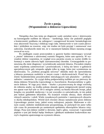 Życie z pasją. (Wspomnienie o doktorze Lipowskim) Niespełna dwa lata temu po diagnozie wady aortalnej serca i skierowaniu na koronografie trafiłem do lekarza – kardiologa, który nie podzielił poglądu o konieczności poddania się zabiegowi i zasugerował leczenie farmakologiczne oraz aktywność fizyczną i redukcję wagi ciała. Intensywnie w tym czasie pływałem i jeździłem na rowerze, więc nie trudno mi było przyjąć i zastosować owe zalecenia. Zaciekawiło mnie też, że w starannym badaniu lekarz staranną uwagę zwracał na oczy. Po niedługim czasie przeczytałem w gazecie bardzo interesujący wywiad z „moim” doktorem o zdrowotnej wartości biegania, które sam uprawia. W wywiadzie doktor wspomina, że wygląd oczu pacjenta uważa za ważne źródło informacji o stanie zdrowia bądź zaawansowanej chorobie. Uwiarygodniło to postawioną dla mnie diagnozę i wywindowało autorytet lekarza. Poczułem między nami wspólnotę zainteresowań i przeświadczeń, o którą nie łatwo w gabinecie specjalistycznym gdy ortopeda ogląda tylko tę nogę, która jest wymieniona na skierowaniu. Ta „osobista przygoda sercowa” skłoniła mnie do opowiedzenia o lekarzu poznanym osobiście w innym czasie i okolicznościach. Przed laty na Ziemi Sandomierskiej poszukiwałem mieszkających tam plastyków – profesjonalistów i amatorów. Za czyjąś dobrą podpowiedzią trafiłem po raz pierwszy do domu doktora Wojciecha Lipowskiego w Zawichoście. Rozmawialiśmy w gabinecie doktora. W rogu przy oknie – biurko z przymocowaną do niego wirówką do robienia analiz; na środku pokoju okazały aparat rentgenowski (przed wojną ten aparat wart był tyle co 30-ci morgów ziemi); na biurku bloczek recept, jakaś książka czy poradnik medyczny i to już wszystko co zaświadczało, że ten pokój jest byłym gabinetem lekarskim. Na ścianach wisiały obrazy, dużo obrazów różnych autorów i szkół. Wiele rysunkowych portretów i nastrojowych obrazów w duchu młodopolskim. Wśród nich również obrazy namalowane przez doktora Lipowskiego: portret żony, jakieś sceny rodzajowe, pejzaże. Malowane w różnym czasie; niektóre niedokończone przypominają, że poświęcił im autor tylko tyle czasu ile pozostawało po sumiennym spełnieniu obowiązków lekarza wiejskiego. Poza tym doktor rzeźbił w drewnie, lepił z gliny, wyszywał. I opowiadał pięknie o tym jak kiedyś będąc biednym i głodnym studentem krakowskim marzył o kupieniu upatrzonego na wystawie obrazu. 357 W tym gabinecie rozmawialiśmy kilkakrotnie, gdy odwiedzałem doktora Lipowskiego z moimi przyjaciółmi malarzami kiedy gościli w Sandomierzu. Planowaliśmy wystawę twórczości pana Lipowskiego w galerii Biura Wystaw Artystycznych i rozmawialiśmy o tajemnym wpływie sztuki na jakość jednostkowego ludzkiego życia. Na wystawie miały być też pokazane zdjęcia zrobione przez Doktora w lutym 1944 r tuż po pacyfikacji przez Niemców Borowa i sąsiednich wiosek. Nie bacząc na niebezpieczeństwo ratował rannych i sporządzał świadectwo niemieckiego ludobójstwa. Te zdjęcia i relacje stały się potem cennym dowodem dla Komisji Badania Zbrodni Hitlerowskich w Polsce. Dowiedziałem się podczas tych spotkań, że doktor Lipowski pisał wspomnienia i pracował nad monografią Zawichosta. W gabinecie dyrektora I Liceum Ogólnokształcącego w Sandomierzu Józefa Nowaka, równocześnie prezesa Sandomierskiego Oddziału PTTK, wisiały zdjęcia znakomitych absolwentów tej szkoły (przed wojną męskiego gimnazjum humanistycznego). Wśród innych zdjęć rozpoznałem W. Lipowskiego z Zawichosta. Zdjęcie przedstawiało Doktora, w jego gabinecie, na tle obrazu z Delfiną Potocką. Pogadując o programie pracy PTTK, o Stefanie Żeromskim, Aleksandrze Patkowskim, o historii tej szkoły i jej wychowankach wybieraliśmy się z dyrektorem Nowakiem do Zawichosta. Przynagliło nas do wyjazdu ukazanie się zapowiadanych wspomnień doktora Lipowskiego. Zabraliśmy do podpisania przez autora trzy książki, bo jedna była przeznaczona do gabloty w gabinecie dyrektora szkoły. Znalazła się tam w towarzystwie książek Wincentego Burka z Ocinka, Wiesława Myśliwskiego z Dwikóz i Juliana Kawalca z Wrzaw. Książka ma tytuł „Lekarz” (LSW Warszawa, 1980). Czterdzieści dwa lata pracował W. Lipowski jako lekarz w warunkach trudnych i bardzo trudnych; bez możliwości natychmiastowego kontaktu z kliniką; bez szybkich i pewnych środków komunikacji; w środowisku bez większej tradycji sanitarnej i świadomości medycznej. Najpierw dorobił się zawodowego autorytetu, a potem codziennie potwierdzał ten autorytet żmudną pracą wśród ludzi. Najnowsze osiągnięcia medycyny akademickiej z pierwiastkiem medycyny ludowej, trochę intuicji, zawodowy talent i wyobraźnia, znakomita znajomość środowiska społecznego i bezwzględnie przestrzegana etyka lekarska, przysporzyły mu satysfakcji zawodowej i szacunku ludzkiego. Solidność, poczucie obowiązku i upór tchną z kart autobiografii tego lekarza. Bez tych cech nie przekroczyłby barier dzielących wówczas chłopaka wiejskiego od katedr uniwersyteckich. Cnoty na ogół wynosi się z rodziny i środowiska. „Dzielny i światły gospodarz” służył za wzór we wsi, w której kształtował swój charakter Wojtek Lipowski. Wiejska zamaszystość, jak robić to porządnie i niech lata postoi (jak to widać po solidnych, jakby na wyrost stawianych remizach i domach ludowych). Nie można biadolić. We wsi jak w domu powinno być widać dostatek i honorność, na dziady nie zejść i nie zhańbić się. Doktor Lipowski działał społecznie bardzo intensywnie. Był w zarządach organizacji spółdzielczych; szefował stra- 358 żakom; inicjował i patronował ważnym budowlom na wsi; prowadził teatr amatorski; wydawał z kolegami gazetkę satyryczną. Ważny wątek Jego biografii miał miejsce w czasie II wojny światowej. Niemal trzecią część książki z