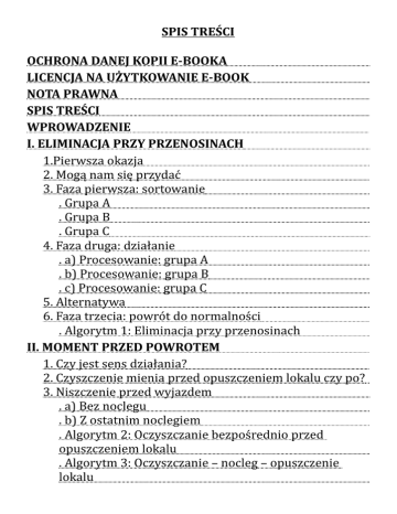 SPIS TREŚCI OCHRONA DANEJ KOPII E-BOOKA LICENCJA NA UŻYTKOWANIE E-BOOK NOTA PRAWNA SPIS TREŚCI WPROWADZENIE I. ELIMINACJA PRZY PRZENOSINACH 1.Pierwsza okazja 2. Mogą nam się przydać 3. Faza pierwsza: sortowanie . Grupa A . Grupa B . Grupa C 4. Faza druga: działanie . a) Procesowanie: grupa A . b) Procesowanie: grupa B . c) Procesowanie: grupa C 5. Alternatywa 6. Faza trzecia: powrót do normalności . Algorytm 1: Eliminacja przy przenosinach II. MOMENT PRZED POWROTEM 1. Czy jest sens działania? 2. Czyszczenie mienia przed opuszczeniem lokalu czy po? 3. Niszczenie przed wyjazdem . a) Bez noclegu . b) Z ostatnim noclegiem . Algorytm 2: Oczyszczanie bezpośrednio przed opuszczeniem lokalu . Algorytm 3: Oczyszczanie – nocleg – opuszczenie lokalu III. NISZCZENIE PRZED DOMEM 1. Przygotowanie 2. Pełne usługi zewnętrzne . a) Potrzebujemy . b) Oddajemy . c) Okrycie 3. Częściowe usługi zewnętrzne . a) Potrzebujemy . b) Zostawiamy 4. Przestrzeń prywatna poza lokalem . Algorytm 4: Niszczenie pomiędzy wyjazdem a lokalem docelowym IV. NISZCZENIE W DOMU 1. Możemy potrzebować . a) Tuż przed wyjazdem . b) Po przyjeździe do domu 2. Redukcja . a) Do Użytkowania . b) Do Kwarantanny 3. Sortowanie właściwe . a) Grupa A . b) Grupa B . c) Grupa C 4. Moment wejścia do domu . a) Potrzebujemy . b) Wszystko posortowane . c) Nieposortowane 5. Procesowanie . a) Procesowanie: grupa A . b) Procesowanie: grupa B . c) Procesowanie: grupa C 6. Czy stosować dodatkowo chemię? 7. Część w domu – część poza . Algorytm 5: Sortowanie poza i oczyszczanie w domu . Algorytm 6: Sortowanie i oczyszczanie w lokalu docelowym V. OCZYSZCZANIE BIERNE 1. Potrzebujemy 2. Oczyszczamy, nie oczyszczając 3. Warunki konieczne . a) Warunek 1 . b) Warunek 2 . c) Warunek 3 . d) Warunek 4 . e) Warunek 5 . Algorytm 7: Oczyszczanie bierne VI. PRZEPROWADZKA DO INNEGO MIEJSCA STAŁEGO ZAMIESZKANIA Analogia 1. Niszczenie przed przeprowadzką Analogia 2. Niszczenie w trakcie przeprowadzki Analogia 3. Niszczenie na nowym mieszkaniu VII. PLUSKWY W ŚRODKACH LOKOMOCJI: POCIĄG, BUS, SAMOLOT 1. Gdzie najczęściej? 2. Czy się zorientujemy? 3. Procedury analogiczne 4. Profilaktyka VIII. PLUSKWY W SZPITALU 1. Skąd pluskwy w szpitalu? 2. Analogie 3. Profilaktyka . a) Depozyt . b) Świeże ubranie . c) Sala na oddziale . d) Bagaż lub torba od laptopa IX. AKADEMIK, BURSA 1. Ograniczenie ilości rzeczy 2. Analogia 1. Niszczenie przed wyprowadzką 3. Analogia 2. Niszczenie w trakcie wyprowadzki 4. Analogia 3. Niszczenie w nowym miejscu lub domu rodzinnym 5. Profilaktyka długoterminowa w akademiku X. PLUSKWY W KINIE 1. W Polsce? 2. Gdyby jednak 3. Rezygnacja z wyjść do kina? 4. Pluskwy w restauracji? XI. PLUSKWY W MIEJSCU PRACY 1. Zwierzęta 2. Kontakt z przenoszącymi 3. Lokale mieszkalne 4. Więzienia 5. Rozwiązania . a) Rozdzielenie . b) Zmiana odzieży . c) Przechowywanie . d) Czyszczenie XII. UŻYWANE MEBLE 1. Przeznaczenie 2. Dostęp do zakamarków 3. Pluskwy w nowych meblach? ZAKOŃCZENIE INDEKS ALGORYTMÓW