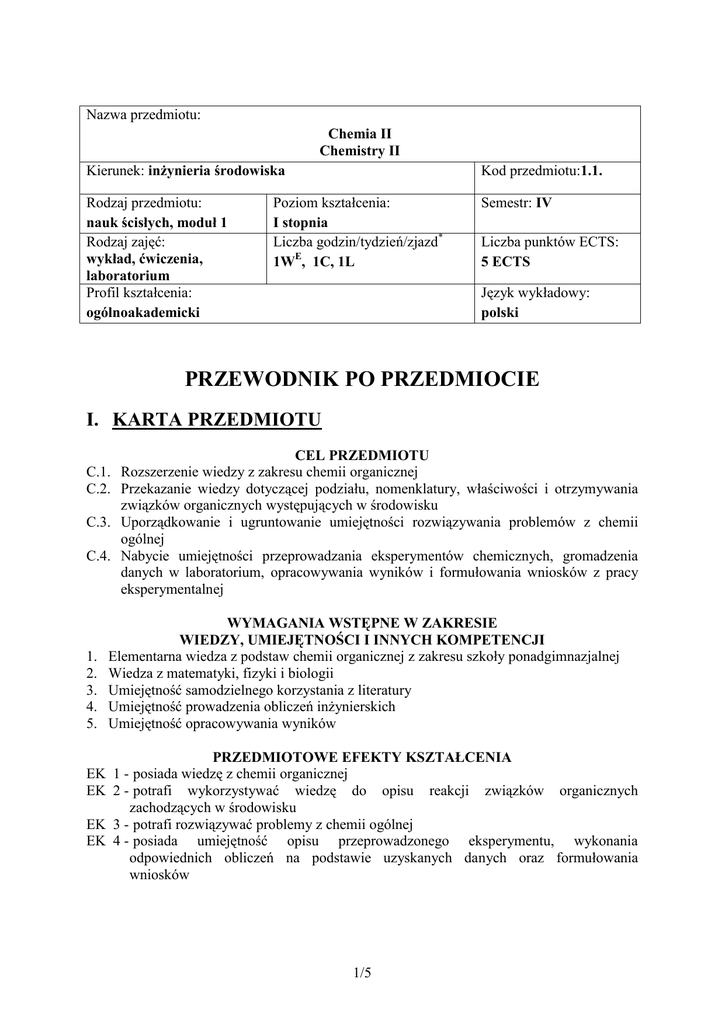 Nazwa przedmiotu: Chemia II Chemistry II Kierunek: inżynieria środowiska Rodzaj przedmiotu: nauk ścisłych, moduł 1 Rodzaj zajęć: wykład, ćwiczenia, laboratorium Profil kształcenia: ogólnoakademicki Kod przedmiotu:1.1. Poziom kształcenia: I stopnia Liczba godzin/tydzień/zjazd* 1WE, 1C, 1L Semestr: IV Liczba punktów ECTS: 5 ECTS Język wykładowy: polski PRZEWODNIK PO PRZEDMIOCIE I. KARTA PRZEDMIOTU CEL PRZEDMIOTU C.1. Rozszerzenie wiedzy z zakresu chemii organicznej C.2. Przekazanie wiedzy dotyczącej podziału, nomenklatury, właściwości i otrzymywania związków organicznych występujących w środowisku C.3. Uporządkowanie i ugruntowanie umiejętności rozwiązywania problemów z chemii ogólnej C.4. Nabycie umiejętności przeprowadzania eksperymentów chemicznych, gromadzenia danych w laboratorium, opracowywania wyników i formułowania wniosków z pracy eksperymentalnej 1. 2. 3. 4. 5. EK EK EK EK WYMAGANIA WSTĘPNE W ZAKRESIE WIEDZY, UMIEJĘTNOŚCI I INNYCH KOMPETENCJI Elementarna wiedza z podstaw chemii organicznej z zakresu szkoły ponadgimnazjalnej Wiedza z matematyki, fizyki i biologii Umiejętność samodzielnego korzystania z literatury Umiejętność prowadzenia obliczeń inżynierskich Umiejętność opracowywania wyników PRZEDMIOTOWE EFEKTY KSZTAŁCENIA 1 - posiada wiedzę z chemii organicznej 2 - potrafi wykorzystywać wiedzę do opisu reakcji związków organicznych zachodzących w środowisku 3 - potrafi rozwiązywać problemy z chemii ogólnej 4 - posiada umiejętność opisu przeprowadzonego eksperymentu, wykonania odpowiednich obliczeń na podstawie uzyskanych danych oraz formułowania wniosków 1/5 TREŚCI PROGRAMOWE Forma zajęć – wykłady W 1,2 – Istota chemii organicznej, nazewnictwo i podział związków organicznych W 3, – Alkany W 4 – Alkeny W 5 – Alkiny i dieny W 6 – Halogenki alkilu W 7 – Typy i mechanizmy reakcji związków organicznych W 8 – Związki aromatyczne W 9 – Alkohole i fenole W 10 – Etery i epoksydy W 11 – Aldehydy i ketony W 12 – Kwasy karboksylowe i ich pochodne W 13 – Aminy W 14 –Węglowodany W 15 –Peptydy i białka Forma zajęć – ćwiczenia C 1,2,3 - Kinetyka chemiczna C 4,5 - Statyka chemiczna C 6 - Kolokwium cząstkowe C 7,8 – Elektrochemia C 9 – Kolokwium cząstkowe C 10,11- Prawa gazowe C 12,13- Metody obliczeniowe w spektroskopii absorpcyjnej C 14 – Kolokwium cząstkowe C 15 – Podsumowanie zajęć, wpisywanie zaliczeń Forma zajęć – laboratorium L 1 - Zapoznanie z programem zajęć, zasadami zaliczenia oraz obowiązującą literaturą; zapoznanie z regulaminem obowiązującym w laboratorium chemicznym; podział na grupy ćwiczeniowe; rozdanie instrukcji do ćwiczeń. L 2 - zasady użytkowania i obsługi spektrofotometru, przygotowanie krzywej wzorcowej L 3,4 Analiza miareczkowa. Redoksymetria - manganometryczne oznaczanie kwasu szczawiowego L 5,6 –Wyznaczanie stopnia i stałej dysocjacji słabych elektrolitów L 7,8 –Wyznaczanie stałej szybkości reakcji chemicznej L 9,10 –Badanie własności fizyko-chemicznych wody L 11,12 –Wyznaczanie krzywej miareczkowania w układzie kwas-zasada L 13,14 –Kinetyka reakcji chemicznych L 15 –Poprawianie i odrabianie zaległych ćwiczeń NARZĘDZIA DYDAKTYCZNE 2/5 Liczba godzin 2 1 1 1 1 1 1 1 1 1 1 1 1 1 Liczba godzin 3 3 1 2 1 2 2 1 1 Liczba godzin 1 1 2 2 2 2 2 2 1 1. Wykład informacyjny i problemowy z elementami prezentacji multimedialnych 2. Ćwiczenia audytoryjne 3. Ćwiczenia laboratoryjne, doświadczenia, obserwacja i pomiar SPOSOBY OCENY ( F – FORMUJĄCA, P – PODSUMOWUJĄCA) F1. – Ocena samodzielnego przygotowania do zajęć F2. – Ocena pracy w grupie podczas rozwiązywania zadań F3. – Ocena samodzielnej pracy podczas ćwiczeń laboratoryjnych P1. – Egzamin obejmujący dwie części z zakresu chemii ogólnej i organicznej P2. – Kolokwium zaliczeniowe obejmujące dwie części P3 – Kolokwia dopuszczające do ćwiczeń laboratoryjnych P4 – Ocena wykonania sprawozdania OBCIĄŻENIE PRACĄ STUDENTA Forma aktywności Udział w wykładach Udział w ćwiczeniach audytoryjnych Udział w zajęciach laboratoryjnych Przygotowanie do egzaminu Egzamin Przygotowanie do ćwiczeń audytoryjnych Kolokwium Przygotowanie do zajęć laboratoryjnych Sprawdzian dopuszczający do zajęć laboratoryjnych Godziny kontaktowe z nauczycielem Suma SUMARYCZNA LICZBA PUNKTÓW ECTS DLA PRZEDMIOTU Średnia liczba godzin na zrealizowanie aktywności ……………………... 15 h ……………………... 15 h ...…………………….15 h ………………………30 h ……………………….3 h ………………………10 h ……………………... .3 h ……………………... 10 h ...…………………….7 h ………………………17 h 125 h 5 ECTS LITERATURA PODSTAWOWA I UZUPEŁNIAJĄCA Galus Z. (red.): Ćwiczenia rachunkowe z chemii analitycznej, Wydawnictwo Naukowe PWN, Warszawa 1993 Lipiec T., Szmal Z.: Chemia analityczna z elementami analizy instrumentalnej, Wydawnictwo PZWL, Warszawa 1996 McMurry J.: Chemia organiczna, T. 1-5, Wydawnictwo naukowe PWN, Warszawa 2007 Minczewski J., Marczenko Z.: Chemia analityczna, T. 2, Wydawnictwo Naukowe PWN, Warszawa 2010 Morrison RT., Boyd R.: Chemia organiczna, Wydawnictwo Naukowe PWN, Warszawa 1990 Sienko M. J., Plane R.A.: Chemia podstawy i zastosowania, Wydawnictwo Naukowe PWN, Warszawa 1999 Śliwa A. (red.).: Obliczenia chemiczne, Wydawnictwo Naukowe PWN, Warszawa 1987 Whittaker A.G., Mount A.R., Heal M.R.: Chemia fizyczna. Krótkie wykłady, Wydawnictwo Naukowe PWN, Warszawa 2006 3/5 KOORDYNATOR PRZEDMIOTU ( IMIĘ, NAZWISKO, ADRES E-MAIL) 1. dr hab. Agata Rosińska, prof. PCz, [email protected] 1. 2. 3. 4. PROWADZĄCY PRZEDMIOT ( IMIĘ, NAZWISKO, ADRES E-MAIL) dr hab. Agata Rosińska, prof. PCz, [email protected], wykład dr Beata Karwowska, [email protected], ćwiczenia laboratoryjne mgr inż. Katarzyna Kipigroch, [email protected], ćwiczenia laborator