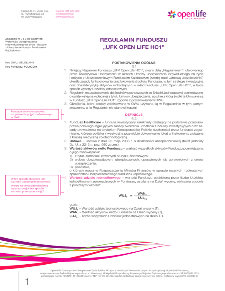 Open Life TU Życie S.A. ul. Przyokopowa 33 01-208 Warszawa infolinia 801 222 333 [email protected] www.openlife.pl REGULAMIN FUNDUSZU „UFK OPEN LIFE HC1” Załącznik nr 2 z 2 do Ogólnych Warunków Ubezpieczenia indywidualnego na życie i dożycie z Ubezpieczeniowym Funduszem Kapitałowym POSTANOWIENIA OGÓLNE § 1 1. Niniejszy Regulamin Funduszu „UFK Open Life HC1”, zwany dalej „Regulaminem”, oferowanego przez Towarzystwo Ubezpieczeń w ramach Umowy ubezpieczenia indywidualnego na życie i dożycie z Ubezpieczeniowym Funduszem Kapitałowym (zwanej dalej „Umową ubezpieczenia”) określa zasady funkcjonowania oraz lokowania środków Funduszu, w tym strategię inwestycyjną oraz charakterystykę aktywów wchodzących w skład Funduszu „UFK Open Life HC1”, a także sposób wyceny Udziałów jednostkowych. 2. Regulamin ma zastosowanie do środków pochodzących ze Składki Jednorazowej pomniejszonej o opłatę wstępną wpłacanej z tytułu Umowy ubezpieczenia, zgodnie z którą środki te lokowane są w Fundusz „UFK Open Life HC1”, zgodnie z postanowieniami OWU. 3. Określenia, które zostały zdefiniowane w OWU używane są w Regulaminie w tym samym znaczeniu, o ile Regulamin nie stanowi inaczej. Kod OWU: UB_OLIJ145 Kod Funduszu: FOLHC001 Poniższe definicje stanowią uzupełnienie pojęć zdefiniowanych w OWU. 1. 2. 3. W ten sposób obliczana jest wartość Udziału jednostkowego. Więcej na temat zastosowania wyznaczonej w ten sposób wartości przeczytasz w § 7. 4. DEFINICJE § 2 Fundusz Healthcare – fundusz inwestycyjny zamknięty działający na podstawie przepisów prawa polskiego regulujących zasady tworzenia i działania funduszy inwestycyjnych oraz zasady prowadzenia na terytorium Rzeczpospolitej Polskiej działalności przez fundusze zagraniczne, którego polityka inwestycyjna przewiduje dokonywanie lokat w instrumenty związane z branżą medyczną i biotechnologiczną. Ustawa – Ustawa z dnia 22 maja 2003 r. o działalności ubezpieczeniowej (tekst jednolity Dz. U. z 2013 r., poz. 950 ze zm.). Wartość aktywów netto Funduszu – wartość wszystkich aktywów Funduszu pomniejszona o jego zobowiązania: 1) z tytułu transakcji zawartych na rynku finansowym; 2) wobec ubezpieczających, ubezpieczonych, uposażonych lub uprawnionych z umów ubezpieczenia; 3) pozostałe, o których mowa w Rozporządzeniu Ministra Finansów w sprawie rocznych i półrocznych sprawozdań ubezpieczeniowego funduszu kapitałowego. Wartość udziału jednostkowego – wartość Funduszu podzieloną przez liczbę Udziałów jednostkowych zgromadzonych w Funduszu, ustalaną na Dzień wyceny, obliczana zgodnie z poniższym wzorem: WUJT = WANT LUJT-1 gdzie: WUJT – Wartość udziału jednostkowego na Dzień wyceny (T), WANT – Wartość aktywów netto Funduszu na Dzień wyceny (T), LUJT-1 – liczba wszystkich Udziałów jednostkowych na dzień T-1. 1 Open Life Towarzystwo Ubezpieczeń Życie Spółka Akcyjna z siedzibą w Warszawie przy ul. Przyokopowej 33, 01-208 Warszawa, zarejestrowana w Sądzie Rejonowym dla m.st. Warszawy, XII Wydział Gospodarczy Krajowego Rejestru Sądowego pod numerem KRS 0000292551, posiadająca numer REGON 141186640 i numer NIP 107-00-08-220, kapitał zakładowy zarejestrowany i w całości wpłacony wynosi 95 500 000 zł. Open Life TU Życie S.A. ul. Przyokopowa 33 01-208 Warszawa 1. 2. 3. 4. 5. 6. 7. 8. infolinia 801 222 333 [email protected] www.openlife.pl STRATEGIA INWESTYCYJNA, CHARAKTERYSTYKA AKTYWÓW WCHODZĄCYCH W SKŁAD FUNDUSZU I WARTOŚĆ FUNDUSZU § 3 Fundusz jest wydzieloną rachunkowo częścią aktywów Towarzystwa Ubezpieczeń, podzieloną na Udziały jednostkowe Funduszu o jednakowej wartości. Fundusz powstaje z alokowanych przez Towarzystwo Ubezpieczeń Składek Jednorazowych pomniejszonych o opłatę wstępną poprzez nabycie Udziałów jednostkowych Funduszu. Celem Funduszu jest powiększanie wartości aktywów Funduszu w wyniku wzrostu wartości lokat Funduszu. Środki Funduszu lokowane są w następujące instrumenty finansowe: 1) depozyty bankowe lub środki pieniężne wyrażone w złotych polskich; 2) dłużne papiery wartościowe emitowane lub gwarantowane przez Skarb Państwa lub Narodowy Bank Polski; 3) jednostki uczestnictwa lub certyfikaty inwestycyjne funduszy pieniężnych lub funduszy obligacji; 4) certyfikaty inwestycyjne emitowane przez jeden lub kilka Funduszy Healthcare, z zastrzeżeniem limitów zaangażowania określonych w ust. 5 - 6. Towarzystwo Ubezpieczeń dokonuje aktywnej alokacji środków Funduszu w ramach wymienionych w ust. 5 - 6 limitów udziałów poszczególnych aktywów. Do 10% środków Funduszu lokowane jest w środki pieniężne lub depozyty bankowe, których czas trwania nie przekracza 3 miesięcy, lub dłużne papiery wartościowe emitowane lub gwarantowane przez Skarb Państwa lub Narodowy Bank Polski lub jednostki uczestnictwa lub certyfikaty inwestycyjne funduszy pieniężnych lub funduszy obligacji, z zastrzeżeniem ust. 9 - 10 oraz ust. 12. Co najmniej 90% środków Funduszu lokowane jest w certyfikaty inwestycyjne emitowane przez jeden lub kilka Funduszy Healthcare, z zastrzeżeniem ust. 9 - 10 oraz ust. 12. Środki pieniężne, o których mowa w ust. 4 pkt 1, są aktywami pieniężnymi w formie krajowych środków płatniczych, znajdujące się w obrocie gotówkowym lub w obrocie następującym za pośrednictwem bieżących rachunków bankowych lub depozytów płatnych na żądanie. Certyfikaty inwestycyjne, o których mowa w ust. 4 pkt 4, są papierami wartościowymi emitowanymi przez jeden lub kilka Funduszy Healthcare, które mogą lokować swoje aktywa w: 1) papiery wartościowe, w tym akcje, prawa do akcji, warranty subskrypcyjne, prawa poboru akcji, obligacje, obligacje zamienne na akcje, kwity depozytowe, listy zastawne będące przedmiotem publicznej oferty jak i nie będące przedmiotem takiej oferty; 2) instrumenty rynku pieniężnego; 3) waluty; 4) instrumenty pochodne, 