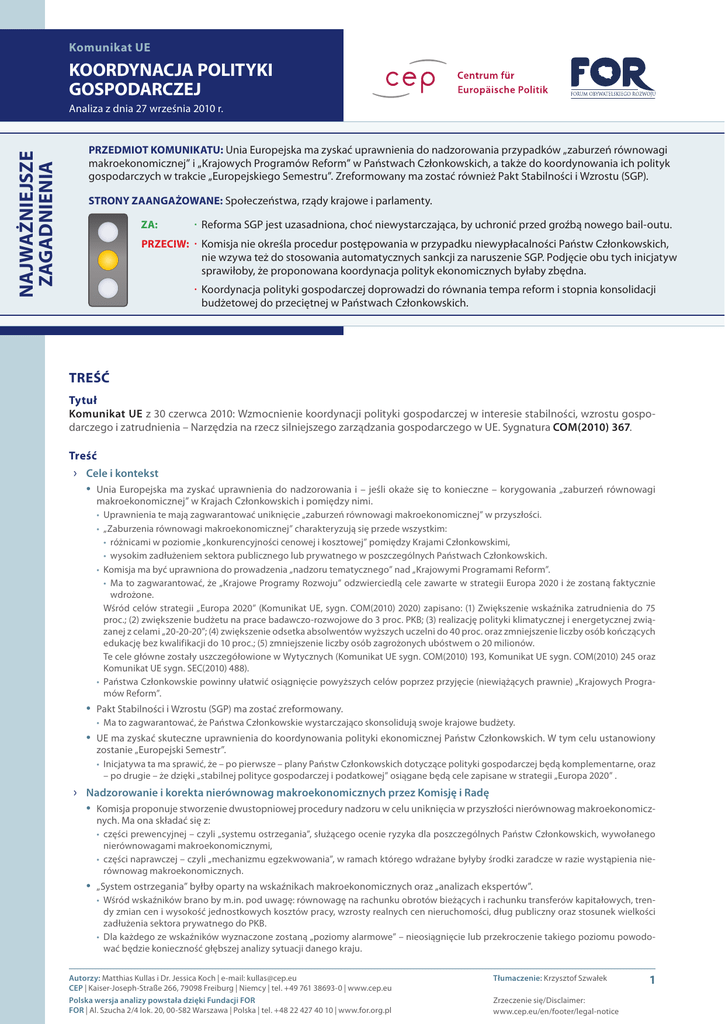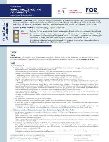 Komunikat UE KOORDYNACJA POLITYKI GOSPODARCZEJ NAJWAŻNIEJSZE ZAGADNIENIA Analiza z dnia 27 września 2010 r. PRZEDMIOT KOMUNIKATU: Unia Europejska ma zyskać uprawnienia do nadzorowania przypadków „zaburzeń równowagi makroekonomicznej” i „Krajowych Programów Reform” w Państwach Członkowskich, a także do koordynowania ich polityk gospodarczych w trakcie „Europejskiego Semestru”. Zreformowany ma zostać również Pakt Stabilności i Wzrostu (SGP). STRONY ZAANGAŻOWANE: Społeczeństwa, rządy krajowe i parlamenty. ∙ Reforma SGP jest uzasadniona, choć niewystarczająca, by uchronić przed groźbą nowego bail-outu. PRZECIW: ∙ Komisja nie określa procedur postępowania w przypadku niewypłacalności Państw Członkowskich, ZA: nie wzywa też do stosowania automatycznych sankcji za naruszenie SGP. Podjęcie obu tych inicjatyw sprawiłoby, że proponowana koordynacja polityk ekonomicznych byłaby zbędna. ∙ Koordynacja polityki gospodarczej doprowadzi do równania tempa reform i stopnia konsolidacji budżetowej do przeciętnej w Państwach Członkowskich. TREŚĆ Tytuł Komunikat UE z 30 czerwca 2010: Wzmocnienie koordynacji polityki gospodarczej w interesie stabilności, wzrostu gospodarczego i zatrudnienia – Narzędzia na rzecz silniejszego zarządzania gospodarczego w UE. Sygnatura COM(2010) 367. Treść ›› Cele i kontekst • Unia Europejska ma zyskać uprawnienia do nadzorowania i – jeśli okaże się to konieczne – korygowania „zaburzeń równowagi makroekonomicznej” w Krajach Członkowskich i pomiędzy nimi. • Uprawnienia te mają zagwarantować uniknięcie „zaburzeń równowagi makroekonomicznej” w przyszłości. • „Zaburzenia równowagi makroekonomicznej” charakteryzują się przede wszystkim: • różnicami w poziomie „konkurencyjności cenowej i kosztowej” pomiędzy Krajami Członkowskimi, • wysokim zadłużeniem sektora publicznego lub prywatnego w poszczególnych Państwach Członkowskich. • Komisja ma być uprawniona do prowadzenia „nadzoru tematycznego” nad „Krajowymi Programami Reform”. • Ma to zagwarantować, że „Krajowe Programy Rozwoju” odzwierciedlą cele zawarte w strategii Europa 2020 i że zostaną faktycznie wdrożone. Wśród celów strategii „Europa 2020” (Komunikat UE, sygn. COM(2010) 2020) zapisano: (1) Zwiększenie wskaźnika zatrudnienia do 75 proc.; (2) zwiększenie budżetu na prace badawczo-rozwojowe do 3 proc. PKB; (3) realizację polityki klimatycznej i energetycznej związanej z celami „20-20-20”; (4) zwiększenie odsetka absolwentów wyższych uczelni do 40 proc. oraz zmniejszenie liczby osób kończących edukację bez kwalifikacji do 10 proc.; (5) zmniejszenie liczby osób zagrożonych ubóstwem o 20 milionów. Te cele główne zostały uszczegółowione w Wytycznych (Komunikat UE sygn. COM(2010) 193, Komunikat UE sygn. COM(2010) 245 oraz Komunikat UE sygn. SEC(2010) 488). • Państwa Członkowskie powinny ułatwić osiągnięcie powyższych celów poprzez przyjęcie (niewiążących prawnie) „Krajowych Programów Reform”. • Pakt Stabilności i Wzrostu (SGP) ma zostać zreformowany. • Ma to zagwarantować, że Państwa Członkowskie wystarczająco skonsolidują swoje krajowe budżety. • UE ma zyskać skuteczne uprawnienia do koordynowania polityki ekonomicznej Państw Członkowskich. W tym celu ustanowiony zostanie „Europejski Semestr”. • Inicjatywa ta ma sprawić, że – po pierwsze – plany Państw Członkowskich dotyczące polityki gospodarczej będą komplementarne, oraz – po drugie – że dzięki „stabilnej polityce gospodarczej i podatkowej” osiągane będą cele zapisane w strategii „Europa 2020” . ›› Nadzorowanie i korekta nierównowag makroekonomicznych przez Komisję i Radę • Komisja proponuje stworzenie dwustopniowej procedury nadzoru w celu uniknięcia w przyszłości nierównowag makroekonomicznych. Ma ona składać się z: • części prewencyjnej – czyli „systemu ostrzegania”, służącego ocenie ryzyka dla poszczególnych Państw Członkowskich, wywołanego nierównowagami makroekonomicznymi, • części naprawczej – czyli „mechanizmu egzekwowania”, w ramach którego wdrażane byłyby środki zaradcze w razie wystąpienia nierównowag makroekonomicznych. • „System ostrzegania” byłby oparty na wskaźnikach makroekonomicznych oraz „analizach ekspertów”. • Wśród wskaźników brano by m.in. pod uwagę: równowagę na rachunku obrotów bieżących i rachunku transferów kapitałowych, trendy zmian cen i wysokość jednostkowych kosztów pracy, wzrosty realnych cen nieruchomości, dług publiczny oraz stosunek wielkości zadłużenia sektora prywatnego do PKB. • Dla każdego ze wskaźników wyznaczone zostaną „poziomy alarmowe” – nieosiągnięcie lub przekroczenie takiego poziomu powodować będzie konieczność głębszej analizy sytuacji danego kraju. Autorzy: Matthias Kullas i Dr. Jessica Koch | e-mail: [email protected] CEP | Kaiser-Joseph-Straße 266, 79098 Freiburg | Niemcy | tel. +49 761 38693-0 | www.cep.eu Polska wersja analizy powstała dzięki Fundacji FOR FOR | Al. Szucha 2/4 lok. 20, 00-582 Warszawa | Polska | tel. +48 22 427 40 10 | www.for.org.pl Tłumaczenie: Krzysztof Szwałek Zrzeczenie się/Disclaimer: www.cep.eu/en/footer/legal-notice 1 Komunikat UE KOORDYNACJA POLITYKI GOSPODARCZEJ Analiza z dnia 27 września 2010 r. • Jeśli Państwo Członkowskie wykaże „ryzyka makroekonomiczne”, Komisja zaproponuje Radzie przyjęcie rekomendacji dostosowanych do sytuacji w danym kraju. Składać się na nie będą głównie działania dotyczące płac i polityki wobec rynku pracy, działania na rzecz poprawy funkcjonowania rynków towarów i usług oraz działania związane z ograniczaniem dostępności kredytów. • „Mechanizm wdrażania” będzie uruchamiany, gdy w którymś z Państw Członkowskich zaistnieje „znaczące ryzyko”, a Rada stwierdzi – na podstawie
