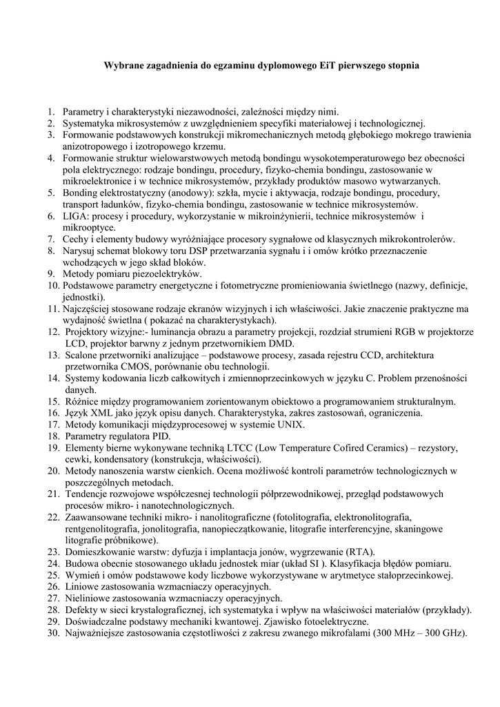 Wybrane zagadnienia do egzaminu dyplomowego EiT pierwszego stopnia 1. Parametry i charakterystyki niezawodności, zależności między nimi. 2. Systematyka mikrosystemów z uwzględnieniem specyfiki materiałowej i technologicznej. 3. Formowanie podstawowych konstrukcji mikromechanicznych metodą głębokiego mokrego trawienia anizotropowego i izotropowego krzemu. 4. Formowanie struktur wielowarstwowych metodą bondingu wysokotemperaturowego bez obecności pola elektrycznego: rodzaje bondingu, procedury, fizyko-chemia bondingu, zastosowanie w mikroelektronice i w technice mikrosystemów, przykłady produktów masowo wytwarzanych. 5. Bonding elektrostatyczny (anodowy): szkła, mycie i aktywacja, rodzaje bondingu, procedury, transport ładunków, fizyko-chemia bondingu, zastosowanie w technice mikrosystemów. 6. LIGA: procesy i procedury, wykorzystanie w mikroinżynierii, technice mikrosystemów i mikrooptyce. 7. Cechy i elementy budowy wyróżniające procesory sygnałowe od klasycznych mikrokontrolerów. 8. Narysuj schemat blokowy toru DSP przetwarzania sygnału i i omów krótko przeznaczenie wchodzących w jego skład bloków. 9. Metody pomiaru piezoelektryków. 10. Podstawowe parametry energetyczne i fotometryczne promieniowania świetlnego (nazwy, definicje, jednostki). 11. Najczęściej stosowane rodzaje ekranów wizyjnych i ich właściwości. Jakie znaczenie praktyczne ma wydajność świetlna ( pokazać na charakterystykach). 12. Projektory wizyjne:- luminancja obrazu a parametry projekcji, rozdział strumieni RGB w projektorze LCD, projektor barwny z jednym przetwornikiem DMD. 13. Scalone przetworniki analizujące – podstawowe procesy, zasada rejestru CCD, architektura przetwornika CMOS, porównanie obu technologii. 14. Systemy kodowania liczb całkowitych i zmiennoprzecinkowych w języku C. Problem przenośności danych. 15. Różnice między programowaniem zorientowanym obiektowo a programowaniem strukturalnym. 16. Język XML jako język opisu danych. Charakterystyka, zakres zastosowań, ograniczenia. 17. Metody komunikacji międzyprocesowej w systemie UNIX. 18. Parametry regulatora PID. 19. Elementy bierne wykonywane techniką LTCC (Low Temperature Cofired Ceramics) – rezystory, cewki, kondensatory (konstrukcja, właściwości). 20. Metody nanoszenia warstw cienkich. Ocena możliwość kontroli parametrów technologicznych w poszczególnych metodach. 21. Tendencje rozwojowe współczesnej technologii półprzewodnikowej, przegląd podstawowych procesów mikro- i nanotechnologicznych. 22. Zaawansowane techniki mikro- i nanolitograficzne (fotolitografia, elektronolitografia, rentgenolitografia, jonolitografia, nanopieczątkowanie, litografie interferencyjne, skaningowe litografie próbnikowe). 23. Domieszkowanie warstw: dyfuzja i implantacja jonów, wygrzewanie (RTA). 24. Budowa obecnie stosowanego układu jednostek miar (układ SI ). Klasyfikacja błędów pomiaru. 25. Wymień i omów podstawowe kody liczbowe wykorzystywane w arytmetyce stałoprzecinkowej. 26. Liniowe zastosowania wzmacniaczy operacyjnych. 27. Nieliniowe zastosowania wzmacniaczy operacyjnych. 28. Defekty w sieci krystalograficznej, ich systematyka i wpływ na właściwości materiałów (przykłady). 29. Doświadczalne podstawy mechaniki kwantowej. Zjawisko fotoelektryczne. 30. Najważniejsze zastosowania częstotliwości z zakresu zwanego mikrofalami (300 MHz – 300 GHz). 31. Wykorzystanie właściwości złącza p-n; omówić na przykładzie różnych typów diod półprzewodnikowych. 32. Tranzystory polowe - systematyka, budowa i zastosowania. 33. Porównanie właściwości i parametrów tranzystorów bipolarnych i polowych. 34. Układy scalone - cele i zalety integracji układów, rodzaje technologii układów scalonych. 35. Krzemowe monolityczne układy scalone - podstawy konstrukcji, stosowane elementy czynne i bierne. 36. Piezorezystywna detekcja sil i wychyleń w układach MEMS. 37. Zasada działania kamertonu piezoelektrycznego. 38. Optoelektronika: definicja, dziedziny optoelektroniki, podstawowe właściwości optoelektroniki. 39. Podstawowe zjawiska optyczne w półprzewodnikach. 40. Definicja epitaksji, klasyfikacja metod epitaksji wytwarzania struktur optoelektronicznych. 41. Klasyfikacja półprzewodnikowych detektorów promieniowania, mechanizmy detekcji. 42. Klasyfikacja źródeł promieniowania, właściwości, podstawowe parametry. 43. Klasyfikacja laserów, właściwości, podstawowe parametry, zastosowanie. 44. Zagadnienie aproksymacji i związane z tym pojęcie szeregu Fouriera. 45. Struktura pasmowa Si i GaAs. 46. Defekty punktowe i dyslokacje w półprzewodnikach. 47. Typy sieci neuronowych i ich zastosowania. 48. Metody uczenia sieci neuronowych. 49. Klasyfikacja światłowodów – omówić i podać przykłady. 50. Klasyfikacja detektorów światła. Podać przykłady konstrukcji i porównać parametry. 51. Parametry światłowodów – klasyfikacja i przykłady. 52. Dyspersja światłowodów – definicje, klasyfikacja, przykładowe wartości, wpływ na jakość transmisji światłowodowej. 53. Sposoby łączenia włókien światłowodowych – klasyfikacja, porównanie, parametry łączy. 54. Zalety montażu powierzchniowego w porównaniu z montażem przewlekanym. 55. Elementy elektroniczne do montażu powierzchniowego – rodzaje, zalety i wady. 56. Metody wytwarzania połączeń elektrycznych lutowanych i klejonych. 57. Obwód szeregowy RLC; rezonans napięć. Obwód równoległy RLC, rezonans prądów. 58. Źródło napięciowe i prądowe. Warunki równoważności źródeł. 59. Moc czynna i bierna w obwodzie elektrycznym. 60. Transformator prądu zmiennego idealny i rzeczywisty.