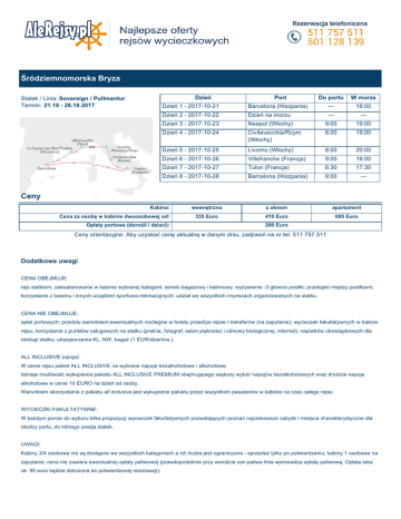 Śródziemnomorska Bryza Dzień Statek / Linia: Sovereign / Pullmantur Termin: 21.10 - 28.10.2017 Port Do portu W morze --- 18:00 Dzień 1 - 2017-10-21 Barcelona (Hiszpania) Dzień 2 - 2017-10-22 Dzień na morzu --- --- Dzień 3 - 2017-10-23 Neapol (Włochy) 9:00 19:00 Dzień 4 - 2017-10-24 Civitavecchia/Rzym (Włochy) 8:00 19:00 Dzień 5 - 2017-10-25 Livorno (Włochy) 8:00 20:00 Dzień 6 - 2017-10-26 Villefranche (Francja) 9:00 18:00 Dzień 7 - 2017-10-27 Tulon (Francja) 6:30 17:30 Dzień 8 - 2017-10-28 Barcelona (Hiszpania) 9:00 --- Ceny Kabina: Cena za osobę w kabinie dwuosobowej od: wewnętrzna z oknem apartament 335 Euro 410 Euro 695 Euro Opłaty portowe (dorośli i dzieci): 200 Euro Ceny orientacyjne. Aby uzyskać cenę aktualną w danym dniu, zadzwoń na nr tel. 511 757 511 Dodatkowe uwagi CENA OBEJMUJE: rejs statkiem; zakwaterowanie w kabinie wybranej kategorii; serwis bagażowy i kabinowy; wyżywienie -3 główne posiłki; przekąski między posiłkami; korzystanie z basenu i innych urządzeń sportowo-rekreacyjnych; udział we wszystkich imprezach organizowanych na statku. CENA NIE OBEJMUJE: opłat portowych; przelotu samolotem;ewentualnych noclegów w hotelu przed/po rejsie i transferów (na zapytanie); wycieczek fakultatywnych w trakcie rejsu; korzystania z punktów usługowych na statku (pralnia, fotograf, salon piękności i odnowy biologicznej, internet); napiwków obowiązkowych dla obsługi statku; ubezpieczenia KL, NW, bagaż (1 EUR/dzień/os.). ALL INCLUSIVE (opcja): W cenie rejsu pakiet ALL INCLUSIVE na wybrane napoje bezalkoholowe i alkoholowe. Istnieje możliwość wykupienia pakietu ALL INCLUSIVE PREMIUM obejmującego większy wybór napojów bezalkoholowych oraz droższe napoje alkoholowe w cenie 10 EURO na dzień od osoby. Warunkiem skorzystania z pakietu all inclusive jest wykupienie pakietu przez wszystkich pasażerów w kabinie na czas całego rejsu. WYCIECZKI FAKULTATYWNE: W każdym porcie do wyboru kilka propozycji wycieczek fakultatywnych pozwalających poznać najciekawsze zabytki i miejsca charakterystyczne dla okolicy portu, do którego zawija statek. UWAGI: Kabiny 3/4 osobowe nie są dostępne we wszystkich kategoriach a ich liczba jest ograniczona - sprzedaż tylko po potwierdzeniu; kabiny 1 osobowe na zapytanie; cena nie zawiera ewentualnej opłaty paliwowej (prawdopodobnie przy wzroście cen paliwa linia wprowadza opłatę paliwową. Opłata taka ok. 90 euro będzie doliczona do potwierdzonej rezerwacji). Sovereign Sovereign - Niezwykle elegancki i komfortowy statek wycieczkowy należący do hiszpańskiego armatora "Pullmantur Cruises". Statek przeszedł gruntowny remont w 2005r. Posiada niezwykle imponujące wyposażenie, a wygodne kabiny z wyśmienitą obsługą na pokładzie są gwarancją na to, że podczas całego rejsu poczujesz się niezwykle wyjątkowo. Na pokładzie zawsze znajdziesz wiele atrakcji, takich, jak interesujące wycieczki fakultatywne, imprezy towarzyskie, kulturalne, kawiarnie, itp.