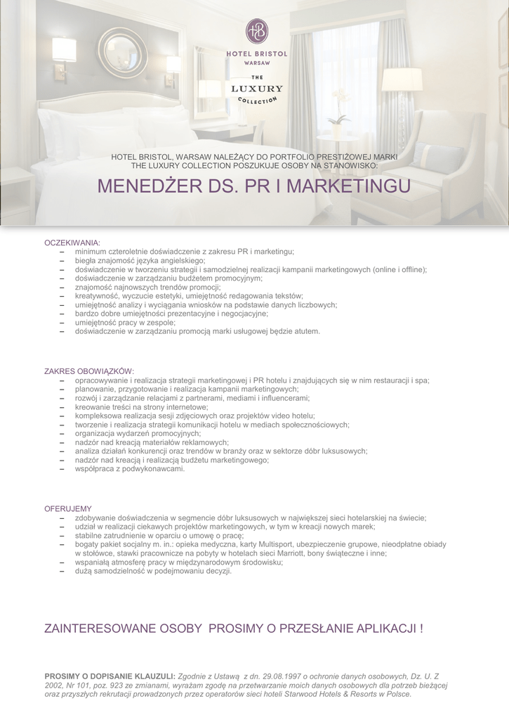 HOTEL BRISTOL, WARSAW NALEŻĄCY DO PORTFOLIO PRESTIŻOWEJ MARKI THE LUXURY COLLECTION POSZUKUJE OSOBY NA STANOWISKO: MENEDŻER DS. PR I MARKETINGU OCZEKIWANIA: ‒ minimum czteroletnie doświadczenie z zakresu PR i marketingu; ‒ biegła znajomość języka angielskiego; ‒ doświadczenie w tworzeniu strategii i samodzielnej realizacji kampanii marketingowych (online i offline); ‒ doświadczenie w zarządzaniu budżetem promocyjnym; ‒ znajomość najnowszych trendów promocji; ‒ kreatywność, wyczucie estetyki, umiejętność redagowania tekstów; ‒ umiejętność analizy i wyciągania wniosków na podstawie danych liczbowych; ‒ bardzo dobre umiejętności prezentacyjne i negocjacyjne; ‒ umiejętność pracy w zespole; ‒ doświadczenie w zarządzaniu promocją marki usługowej będzie atutem. ZAKRES OBOWIĄZKÓW: ‒ opracowywanie i realizacja strategii marketingowej i PR hotelu i znajdujących się w nim restauracji i spa; ‒ planowanie, przygotowanie i realizacja kampanii marketingowych; ‒ rozwój i zarządzanie relacjami z partnerami, mediami i influencerami; ‒ kreowanie treści na strony internetowe; ‒ kompleksowa realizacja sesji zdjęciowych oraz projektów video hotelu; ‒ tworzenie i realizacja strategii komunikacji hotelu w mediach społecznościowych; ‒ organizacja wydarzeń promocyjnych; ‒ nadzór nad kreacją materiałów reklamowych; ‒ analiza działań konkurencji oraz trendów w branży oraz w sektorze dóbr luksusowych; ‒ nadzór nad kreacją i realizacją budżetu marketingowego; ‒ współpraca z podwykonawcami. OFERUJEMY ‒ zdobywanie doświadczenia w segmencie dóbr luksusowych w największej sieci hotelarskiej na świecie; ‒ udział w realizacji ciekawych projektów marketingowych, w tym w kreacji nowych marek; ‒ stabilne zatrudnienie w oparciu o umowę o pracę; ‒ bogaty pakiet socjalny m. in.: opieka medyczna, karty Multisport, ubezpieczenie grupowe, nieodpłatne obiady w stołówce, stawki pracownicze na pobyty w hotelach sieci Marriott, bony świąteczne i inne; ‒ wspaniałą atmosferę pracy w międzynarodowym środowisku; ‒ dużą samodzielność w podejmowaniu decyzji. ZAINTERESOWANE OSOBY PROSIMY O PRZESŁANIE APLIKACJI ! PROSIMY O DOPISANIE KLAUZULI: Zgodnie z Ustawą z dn. 29.08.1997 o ochronie danych osobowych, Dz. U. Z 2002, Nr 101, poz. 923 ze zmianami, wyrażam zgodę na przetwarzanie moich danych osobowych dla potrzeb bieżącej oraz przyszłych rekrutacji prowadzonych przez operatorów sieci hoteli Starwood Hotels & Resorts w Polsce.