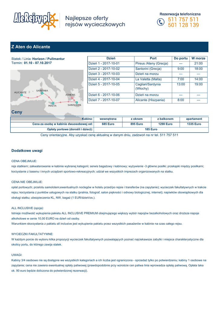 Z Aten do Alicante Dzień Statek / Linia: Horizon / Pullmantur Termin: 01.10 - 07.10.2017 Port Do portu W morze --- 21:00 9:00 18:00 --- --- La Valetta (Malta) 7:00 14:00 Dzień 5 - 2017-10-05 Cagliari/Sardynia (Włochy) 13:00 19:00 Dzień 6 - 2017-10-06 Dzień na morzu --- --- Dzień 7 - 2017-10-07 Alicante (Hiszpania) 8:00 --- Dzień 1 - 2017-10-01 Pireus /Ateny (Grecja) Dzień 2 - 2017-10-02 Santorini (Grecja) Dzień 3 - 2017-10-03 Dzień na morzu Dzień 4 - 2017-10-04 Ceny Kabina: Cena za osobę w kabinie dwuosobowej od: Opłaty portowe (dorośli i dzieci): wewnętrzna z oknem z balkonem apartament 685 Euro 895 Euro 1290 Euro 1335 Euro 185 Euro Ceny orientacyjne. Aby uzyskać cenę aktualną w danym dniu, zadzwoń na nr tel. 511 757 511 Dodatkowe uwagi CENA OBEJMUJE: rejs statkiem; zakwaterowanie w kabinie wybranej kategorii; serwis bagażowy i kabinowy; wyżywienie -3 główne posiłki; przekąski między posiłkami; korzystanie z basenu i innych urządzeń sportowo-rekreacyjnych; udział we wszystkich imprezach organizowanych na statku. CENA NIE OBEJMUJE: opłat portowych; przelotu samolotem;ewentualnych noclegów w hotelu przed/po rejsie i transferów (na zapytanie); wycieczek fakultatywnych w trakcie rejsu; korzystania z punktów usługowych na statku (pralnia, fotograf, salon piękności i odnowy biologicznej, internet); napiwków obowiązkowych dla obsługi statku; ubezpieczenia KL, NW, bagaż (1 EUR/dzień/os.). ALL INCLUSIVE (opcja): Istnieje możliwość wykupienia pakietu ALL INCLUSIVE PREMIUM obejmującego większy wybór napojów bezalkoholowych oraz droższe napoje alkoholowe w cenie 10,00 EURO na dzień od osoby. Warunkiem skorzystania z pakietu all inclusive jest wykupienie pakietu przez wszystkich pasażerów w kabinie na czas całego rejsu. WYCIECZKI FAKULTATYWNE: W każdym porcie do wyboru kilka propozycji wycieczek fakultatywnych pozwalających poznać najciekawsze zabytki i miejsca charakterystyczne dla okolicy portu, do którego zawija statek. UWAGI: Kabiny 3/4 osobowe nie są dostępne we wszystkich kategoriach a ich liczba jest ograniczona - sprzedaż tylko po potwierdzeniu; kabiny 1 osobowe na zapytanie; cena nie zawiera ewentualnej opłaty paliwowej (prawdopodobnie przy wzroście cen paliwa linia wprowadza opłatę paliwową. Opłata taka ok. 90 euro będzie doliczona do potwierdzonej rezerwacji). Horizon Horizon Linia: PULLMANTUR CRUISES pasażerskie: 10 Załoga: 620 Długość: 208 m Pasażerowie: 1,444 Elektryczność: 110/220 V Szerokość: 29 m Szybkość: 21,4 węzłów Pokłady Basen: 3 (jacuzzi) Waluta: Euro Rok budowy: 1990 r. (renowacja 2012) Do dyspozycji:restauracje, bary kawiarnie, kasyno, sala do gry w karty, dyskoteka, jacuzzi, sauna, salon piękności, salon odnowy biologicznej, fitness, biblioteka, klub dla dzieci, kafejka internetowa, sala konferencyjna, galeria zdjęć, butiki, centrum medyczne.Kabiny:721 kabiny wyposażonych jest w łazienkę (prysznic, wc, suszarka; w kabinach typu suite wannaz prysznicem), telewizor, sejf, lodówka (minibar), odtwarzacz CD (w kabinach typu siute). W kabinach posiadających 2 pojedyncze łóżka, istnieje możliwość połączenia ich w 1 podwójne. Kabiny typu suite i prestige podzielone są na część sypialną i dzienną. Room Service dostępny 24h na dobę.