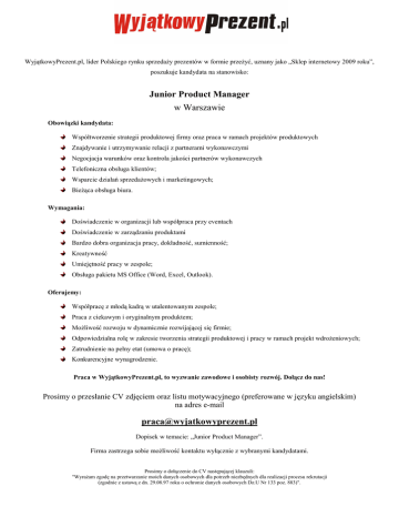 WyjątkowyPrezent.pl, lider Polskiego rynku sprzedaŜy prezentów w formie przeŜyć, uznany jako „Sklep internetowy 2009 roku”, poszukuje kandydata na stanowisko: Junior Product Manager w Warszawie Obowiązki kandydata: Współtworzenie strategii produktowej firmy oraz praca w ramach projektów produktowych Znajdywanie i utrzymywanie relacji z partnerami wykonawczymi Negocjacja warunków oraz kontrola jakości partnerów wykonawczych Telefoniczna obsługa klientów; Wsparcie działań sprzedaŜowych i marketingowych; BieŜąca obsługa biura. Wymagania: Doświadczenie w organizacji lub współpraca przy eventach Doświadczenie w zarządzaniu produktami Bardzo dobra organizacja pracy, dokładność, sumienność; Kreatywność Umiejętność pracy w zespole; Obsługa pakietu MS Office (Word, Excel, Outlook). Oferujemy: Współpracę z młodą kadrą w utalentowanym zespole; Praca z ciekawym i oryginalnym produktem; MoŜliwość rozwoju w dynamicznie rozwijającej się firmie; Odpowiedzialna rolę w zakresie tworzenia strategii produktowej i pracy w ramach projekt wdroŜeniowych; Zatrudnienie na pełny etat (umowa o pracę); Konkurencyjne wynagrodzenie. Praca w WyjątkowyPrezent.pl, to wyzwanie zawodowe i osobisty rozwój. Dołącz do nas! Prosimy o przesłanie CV zdjęciem oraz listu motywacyjnego (preferowane w języku angielskim) na adres e-mail [email protected] Dopisek w temacie: „Junior Product Manager”. Firma zastrzega sobie moŜliwość kontaktu wyłącznie z wybranymi kandydatami. Prosimy o dołączenie do CV następującej klauzuli: "WyraŜam zgodę na przetwarzanie moich danych osobowych dla potrzeb niezbędnych dla realizacji procesu rekrutacji (zgodnie z ustawą z dn. 29.08.97 roku o ochronie danych osobowych Dz.U Nr 133 poz. 883)".
