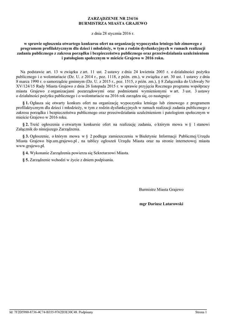 ZARZĄDZENIE NR 234/16 BURMISTRZA MIASTA GRAJEWO z dnia 28 stycznia 2016 r. w sprawie ogłoszenia otwartego konkursu ofert na organizację wypoczynku letniego lub zimowego z programem profilaktycznym dla dzieci i młodzieży, w tym z rodzin dysfunkcyjnych w ramach realizacji zadania publicznego z zakresu porządku i bezpieczeństwa publicznego oraz przeciwdziałania uzależnieniom i patologiom społecznym w mieście Grajewo w 2016 roku. Na podstawie art. 13 w związku z art. 11 ust. 2 ustawy z dnia 24 kwietnia 2003 r. o działalności pożytku publicznego i o wolontariacie (Dz. U. z 2014 r., poz. 1118, z późn. zm.), w związku z art. 30 ust. 1 ustawy z dnia 8 marca 1990 r. o samorządzie gminnym (Dz. U. z 2015 r., poz. 1515, z późn. zm.), § 8 Załącznika do Uchwały Nr XV/124/15 Rady Miasta Grajewo z dnia 26 listopada 2015 r. w sprawie przyjęcia Rocznego programu współpracy miasta Grajewo z organizacjami pozarządowymi oraz podmiotami wymienionymi w art. 3 ust. 3 ustawy o działalności pożytku publicznego i o wolontariacie na 2016 rok zarządza się, co następuje: § 1. Ogłasza się otwarty konkurs ofert na organizację wypoczynku letniego lub zimowego z programem profilaktycznym dla dzieci i młodzieży, w tym z rodzin dysfunkcyjnych w ramach realizacji zadania publicznego z zakresu porządku i bezpieczeństwa publicznego oraz przeciwdziałania uzależnieniom i patologiom społecznym w mieście Grajewo w 2016 roku. § 2. Treść ogłoszenia o otwartym konkursie ofert na realizację zadania, o którym mowa w § 1 stanowi Załącznik do niniejszego Zarządzenia. § 3. Ogłoszenie, o którym mowa w § 2 podlega zamieszczeniu w Biuletynie Informacji Publicznej Urzędu Miasta Grajewo bip.um.grajewo.pl , na tablicy ogłoszeń Urzędu Miasta oraz na stronie internetowej miasta www.grajewo.pl. § 4. Wykonanie Zarządzenia powierza się Sekretarzowi Miasta. § 5. Zarządzenie wchodzi w życie z dniem podpisania. Burmistrz Miasta Grajewo mgr Dariusz Latarowski Id: 7F2D5980-8736-4C74-B355-9762D3E30C48. Podpisany Strona 1 Załącznik do Zarządzenia Nr 234/16 Burmistrza Miasta Grajewo z dnia 28 stycznia 2016 r. OGŁOSZENIE Na podstawie art. 13 ustawy z dnia 24 kwietnia 2003 r. o działalności pożytku publicznego i o wolontariacie (Dz. U. z 2014 r., poz.1118, z późn. zm.), zwanej dalej „ustawą”, Burmistrz Miasta ogłasza otwarty konkurs ofert na realizację zadań publicznych w mieście Grajewo w 2016 roku. I. Rodzaj zadania publicznego oraz wysokość środków publicznych przeznaczonych na dofinansowanie jego realizacji. Wnioskowane kwoty dotacji nie mogą przekroczyć 80 % kosztów realizacji zadania. Każdy wydatek ze środków otrzymanej dotacji musi być udokumentowany. Zadanie publiczne. Organizacja wypoczynku letniego lub zimowego z programem profilaktycznym dla dzieci i młodzieży, w tym z rodzin dysfunkcyjnych w ramach realizacji zadania publicznego z zakresu porządku i bezpieczeństwa publicznego oraz przeciwdziałania uzależnieniom i patologiom społecznym w mieście Grajewo w 2016 roku. Na realizację ww zadania w 2016 r. przeznacza się kwotę do 17.500,00 zł. (słownie: siedemnaście tysięcy pięćśet złotych). Koszty, które wykonawca zadania, może sfinansować ze środków otrzymanej dotacji: koszty bezpośrednie realizacji zadania – 90 % i więcej wnioskowanej dotacji, w tym odpowiednio do rodzaju zadania koszty: a) transportu uczestników wypoczynku letniego lub zimowego środkami komunikacji publicznej lub równoważne, b) wyżywienia, c) zakwaterowania, d) biletów wstępu do zwiedzanych w czasie wycieczek obiektów, e) opieki medycznej, f) ubezpieczenia uczestników wypoczynku, g) innych usług zewnętrznych związanych bezpośrednio z realizowanym zadaniem. Wykonawca ma obowiązek sfinansować ze środków otrzymanej dotacji koszty obsługi informacyjnej zadania – od 1 do 10 % wnioskowanej dotacji , w tym reklama, promocja, informacja. II. Zasady przyznawania i przekazywania dotacji. Przyznanie dotacji nastąpi na zasadzie wsparcia realizacji zadania publicznego zgodnie z art. 5 ust. 4 pkt 2 ustawy, na podstawie umowy, której ramowy wzór stanowi Załącznik Nr 2 do Rozporządzenia Ministra Pracy i Polityki Społecznej z dnia 15 grudnia 2010 r. w sprawie wzoru oferty i ramowego wzoru umowy dotyczących realizacji zadania publicznego oraz wzoru sprawozdania z wykonania tego zadania (Dz. U. z 2011 r. Nr 6, poz. 25), zwanego dalej „rozporządzeniem”. Po wyborze najkorzystniejszej oferty na realizację zadania i podpisaniu umowy z wybranym Oferentem, dotacja – zgodnie z ustaleniami umowy - będzie przekazana na specjalnie w tym celu wyodrębniony rachunek bankowy Oferenta przeznaczony wyłącznie do operacji związanych z realizacją zadania. III. Termin realizacji zadania 1. Zadanie publiczne dofinansowywane przez miasto Grajewo powinno byc zrealizowane w okresie od 1 lipca 2016 r. do 31 grudnia 2016 r. Id: 7F2D5980-8736-4C74-B355-9762D3E30C48. Podpisany Strona 1 2. Okres realizacji zadania powinien obejmować czas przygotowania, przeprowadzenia oraz rozliczenia wykonania zadania. Wszystkie dokumenty finansowe muszą być zgodne z terminami realizacji zadania określonymi w umowie zawartej z Oferentem. IV. Warunki realizacji zadania 1. Warunkiem realizacji zadania przez Oferenta jest przystąpienie do konkursu i złożenie w terminie ważnej oferty. 2. Każdy Oferent zapewnia niezbędne zasoby ludzkie i rzeczowe do realizacji proponowanego zadania. 3. Zakres realizacji zadania publicznego, szczegółowe warunki wydatkowania środków dotacji i zasady jej rozliczenia, zostaną określone w umowie zawartej pomiędzy miastem Grajewo a Oferentem. Ramowy wzór umowy stanowi Załącznik Nr 2 do rozporządzenia, wzór sprawozdania z realizacji zadania stanowi Załącznik Nr 3 do rozporządzenia. 4. Przyznana dotacja nie może być wykorzystana na zobowiązania powstałe przed datą podpisania umowy. Środki przyznane w ramach dotacji muszą być 
