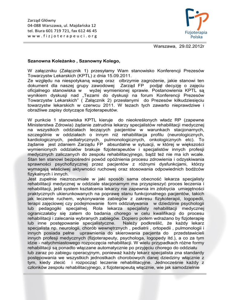 Zarząd Główny 04-088 Warszawa, ul. Majdańska 12 tel. Biura 601 719 721, fax 612 46 45 www.fizjoterapeuci.org Warszawa, 29.02.2012r Szanowna Koleżanko , Szanowny Kolego, W załączniku (Załącznik 1) przesyłamy Wam stanowisko Konferencji Prezesów Towarzystw Lekarskich (KPTL) z dnia 15.09.2011. Ze względu na niespotykaną wagę oraz olbrzymie zagrożenie, jakie stanowi ten dokument dla naszej grupy zawodowej Zarząd FP podjął decyzję o zajęciu oficjalnego stanowiska w wyżej wymienionej sprawie. Postanowienia KPTL są wynikiem dyskusji nad „Tezami do dyskusji na forum Konferencji Prezesów Towarzystw Lekarskich” ( Załącznik 2) przesłanymi do Prezesów kilkudziesięciu towarzystw lekarskich w czerwcu 2011. W tezach tych zawarto nieprawdziwe i obraźliwe zapisy dotyczące fizjoterapeutów. W punkcie 1 stanowiska KPTL kieruje do nieokreślonych władz RP (zapewne Ministerstwa Zdrowia) żądanie zatrudnia lekarzy specjalistów rehabilitacji medycznej na wszystkich oddziałach leczących pacjentów w warunkach stacjonarnych, szczególnie w oddziałach o innym niż rehabilitacja profilu (neurologicznych, kardiologicznych, pediatrycznych, pulmonologicznych, onkologicznych etc). To żądanie jest zdaniem Zarządu FP absurdalne w sytuacji, w której w większości wymienionych oddziałów brakuje fizjoterapeutów i specjalistów innych profesji medycznych zaliczanych do zespołu rehabilitacyjnego, bądź też nie ma ich wcale. Stan ten stanowi bezpośredni powód opóźnienia procesu zdrowienia i odzyskiwania sprawności psychofizycznej przez pacjentów z różnymi dysfunkcjami, którzy wymagają właściwej aktywności ruchowej oraz stosowania odpowiednich bodźców fizykalnych i innych. Jest zupełnie niezrozumiałe w jaki sposób sama obecność lekarza specjalisty rehabilitacji medycznej w oddziale stacjonarnym ma przyspieszyć proces leczenia i rehabilitacji, jeśli system kształcenia lekarzy nie zapewnia im zdobycia umiejętności praktycznych ukierunkowanych na poprawę stanu funkcjonalnego pacjentów, takich jak leczenie ruchem, wykonywanie zabiegów z zakresu fizykoterapii, logopedii, terapii zajęciowej czy podejmowanie form oddziaływania w dziedzinie psychologii lub pedagogiki specjalnej. Rola lekarza specjalisty rehabilitacji medycznej ograniczałaby się zatem do badania chorego w celu kwalifikacji do procesu rehabilitacji i zalecania wybranych zabiegów. Dopiero potem wdrażano by fizjoterapię lub inne postępowanie specjalistyczne. Należy podkreślić, że każdy lekarz specjalista np. neurologii, chorób wewnętrznych , pediatrii , ortopedii , pulmonologii i innych posiada pełne uprawnienia do skierowania pacjenta do przedstawicieli innych profesji medycznych (fizjoterapeuty, psychologa, logopedy itd.), a co za tym idzie - natychmiastowego rozpoczęcia rehabilitacji. W wielu przypadkach różne formy rehabilitacji są ponadto włączane automatycznie po przyjęciu chorego do oddziału lub zaraz po zabiegu operacyjnym, ponieważ każdy lekarz specjalista zna standardy postępowania we wszystkich jednostkach chorobowych danej dziedziny włącznie z tym, kiedy zlecić i rozpocząć leczenie rehabilitacyjne. Jednocześnie każdy z członków zespołu rehabilitacyjnego, z fizjoterapeutą włącznie, wie jak samodzielnie badać w celu podjęcia właściwego postępowania oraz wykonywać zabiegi rehabilitacyjne u pacjenta zdiagnozowanego przez lekarza specjalistę, gdyż zawarte jest to w programach studiów fizjoterapeutów i innych studiów specjalistycznych. Zarząd FP uważa, że zatrudnianie lekarzy rehabilitacji w warunkach stacjonarnych w oddziałach o innym niż rehabilitacja profilu wręcz opóźni i utrudni szybkie rozpoczęcie procesu rehabilitacji pacjentów i zwiększy koszt leczenia przez tworzenie nowego ogniwa . Odnosząc się do punktu 2 stanowiska KPTL Zarząd FP zadaje pytanie na jakiej podstawie lekarze specjaliści rehabilitacji medycznej obligatoryjnie mieliby być kierownikami zespołów rehabilitacyjnych. Specjalizacja rehabilitacji medycznej swoim programem w niewielkim stopniu uwzględnia metody specjalne stosowane w fizjoterapii , psychoterapii , logopedii itd. Wiele tematów nie jest nawet pobieżnie poruszanych na kursach atestacyjnych do specjalizacji z rehabilitacji medycznej, gdzie z reguły nie są zapraszani wykładowcy reprezentujący inne zawody medyczne. Powstaje zatem wątpliwość czy lekarz specjalista rehabilitacji medycznej wie jakimi metodami, środkami , zabiegami dysponuje współczesny zespół rehabilitacyjny? Fizjoterapia, jako jedna z podstawowych dziedzin rehabilitacji, rozwija się bardzo dynamicznie. Program kształcenia fizjoterapeutów w szkolnictwie wyższym uwzględnia kształcenie na poziomie studiów licencjackich, magisterskich i doktoranckich. Europejski system kształcenia fizjoterapeutów w ramach studiów licencjackich i magisterskich obejmuje w ciągu 5 lat 6120 godzin, w tym 1545 godzin teoretycznych i 1520 godzin zajęć praktycznych przeznaczonych na nauczanie badania strukturalnego i czynnościowego pacjentów niezbędnego do planowania procesu fizjoterapii, analizę i biomechanikę ruchu czy podstawy poszczególnych metod fizjoterapeutycznych. Program ten różni się zasadniczo od programu kształcenia lekarzy obejmującego jedynie 30 godzin zajęć poświęconych na ogólne zapoznanie się z pojęciem rehabilitacji. Fizjoterapeuci, podobnie jak lekarze, podejmują dalsze kształcenie w ramach specjalizacji w dziedzinie fizjoterapii lub dziedzinach pokrewnych poszerzając wiedzę zdobytą w czasie studiów i uzyskując tytuły specjalistów. Wiele tysięcy polskich fizjoterapeutów ukończyło studia podyplomowe oraz kursy metod fizjoterapeutycznych uznawane i cenione na całym świecie, uprawniające, po zdaniu egzaminu, do stosowania tych metod w leczeniu pacjentów z różnymi dysfunkcjami. Fizjoterapeuci uczestniczą w planowaniu i realizacji wielu projektów naukowych w ramach szkolnictwa wy