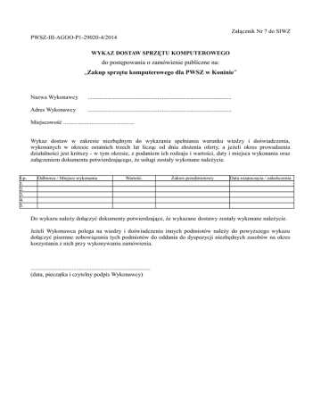 Załącznik Nr 7 do SIWZ PWSZ-III-AGOO-P1-29020-4/2014 WYKAZ DOSTAW SPRZĘTU KOMPUTEROWEGO do postępowania o zamówienie publiczne na: „Zakup sprzętu komputerowego dla PWSZ w Koninie” Nazwa Wykonawcy ................................................................................................. Adres Wykonawcy ................................................................................................. Miejscowość ................................................ Wykaz dostaw w zakresie niezbędnym do wykazania spełniania warunku wiedzy i doświadczenia, wykonanych w okresie ostatnich trzech lat licząc od dnia złożenia oferty, a jeżeli okres prowadzenia działalności jest krótszy - w tym okresie, z podaniem ich rodzaju i wartości, daty i miejsca wykonania oraz załączeniem dokumentu potwierdzającego, że usługi zostały wykonane należycie. Lp. 1. 2. 3. 4. 5. Odbiorca / Miejsce wykonania Wartość. Zakres przedmiotowy Data rozpoczęcia / zakończenia Do wykazu należy dołączyć dokumenty potwierdzające, że wykazane dostawy zostały wykonane należycie. Jeżeli Wykonawca polega na wiedzy i doświadczeniu innych podmiotów należy do powyższego wykazu dołączyć pisemne zobowiązania tych podmiotów do oddania do dyspozycji niezbędnych zasobów na okres korzystania z nich przy wykonywaniu zamówienia. ................................................................................. (data, pieczątka i czytelny podpis Wykonawcy)