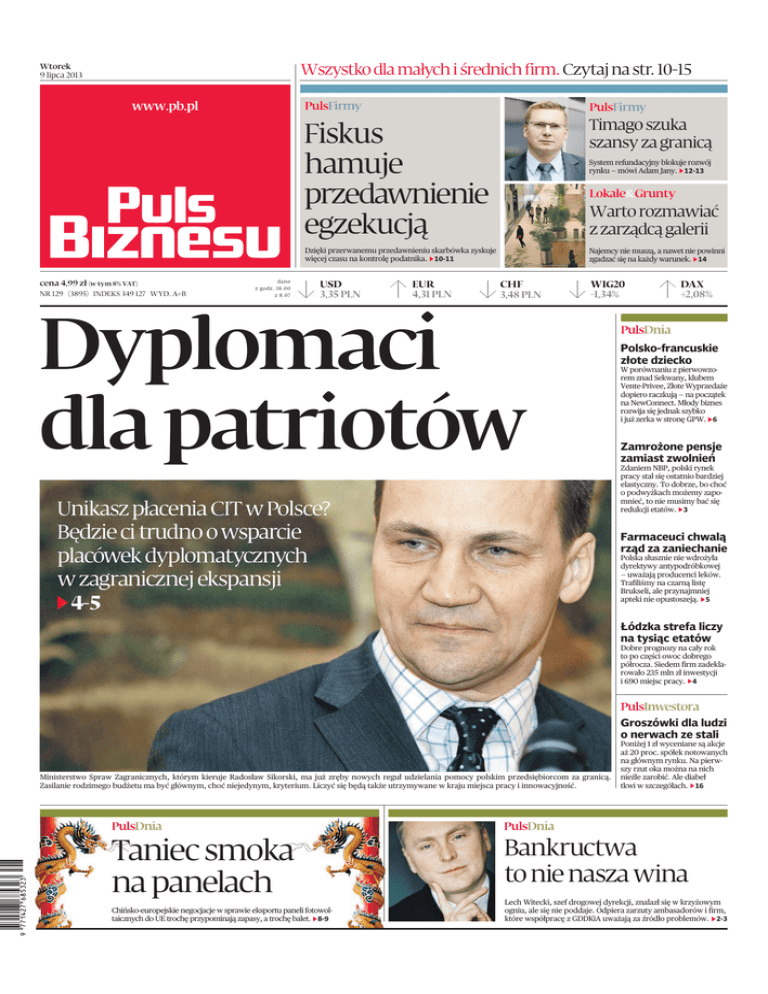 Wszystko dla małych i średnich firm. Czytaj na str. 10-15 Wtorek 9 lipca 2013 www.pb.pl cena 4,99 zł (w tym 8% VAT) NR 129 (3895) INDEKS 349 127 WYD. A+B dane z godz. 18.00 z 8.07 PulsFirmy PulsFirmy Fiskus hamuje przedawnienie egzekucją Timago szuka szansy za granicą Dzięki przerwanemu przedawnieniu skarbówka zyskuje więcej czasu na kontrolę podatnika. 10-11 Najemcy nie muszą, a nawet nie powinni zgadzać się na każdy warunek. 14 USD 3,35 PLN EUR 4,31 PLN System refundacyjny blokuje rozwój rynku — mówi Adam Jany. 12-13 Lokale&Grunty Warto rozmawiać z zarządcą galerii CHF 3,48 PLN WIG20 -1,34% Dyplomaci dla patriotów Unikasz płacenia CIT w Polsce? Będzie ci trudno o wsparcie placówek dyplomatycznych w zagranicznej ekspansji 4-5 DAX +2,08% PulsDnia Polsko-francuskie złote dziecko W porównaniu z pierwowzorem znad Sekwany, klubem Vente-Privee, Złote Wyprzedaże dopiero raczkują — na początek na NewConnect. Młody biznes rozwija się jednak szybko i już zerka w stronę GPW. 6 Zamrożone pensje zamiast zwolnień Zdaniem NBP, polski rynek pracy stał się ostatnio bardziej elastyczny. To dobrze, bo choć o podwyżkach możemy zapomnieć, to nie musimy bać się redukcji etatów. 3 Farmaceuci chwalą rząd za zaniechanie Polska słusznie nie wdrożyła dyrektywy antypodróbkowej — uważają producenci leków. Trafiliśmy na czarną listę Brukseli, ale przynajmniej apteki nie opustoszeją. 5 Łódzka strefa liczy na tysiąc etatów Dobre prognozy na cały rok to po części owoc dobrego półrocza. Siedem firm zadeklarowało 235 mln zł inwestycji i 690 miejsc pracy. 4 PulsInwestora Groszówki dla ludzi o nerwach ze stali Ministerstwo Spraw Zagranicznych, którym kieruje Radosław Sikorski, ma już zręby nowych reguł udzielania pomocy polskim przedsiębiorcom za granicą. Zasilanie rodzimego budżetu ma być głównym, choć niejedynym, kryterium. Liczyć się będą także utrzymywane w kraju miejsca pracy i innowacyjność. Poniżej 1 zł wyceniane są akcje aż 20 proc. spółek notowanych na głównym rynku. Na pierwszy rzut oka można na nich nieźle zarobić. Ale diabeł tkwi w szczegółach. 16 PulsDnia PulsDnia Taniec smoka na panelach Bankructwa to nie nasza wina Chińsko-europejskie negocjacje w sprawie eksportu paneli fotowoltaicznych do UE trochę przypominają zapasy, a trochę balet. 8-9 Lech Witecki, szef drogowej dyrekcji, znalazł się w krzyżowym ogniu, ale się nie poddaje. Odpiera zarzuty ambasadorów i firm, które współpracę z GDDKiA uważają za źródło problemów. 2-3 2 PULS BIZNESU, 9 LIPCA 2013 PulsDnia FINANSE PUBLICZNE Mazowsze rzuca rządowi rękawicę JACEK ZALEWSKI [email protected] O czywista już nowelizacja budżetu państwa jest hiobową wieścią dla jednostek samorządu terytorialnego. Zmniejszenie dochodów wywoła reakcję łańcuchową, czyli serię cięć budżetów wojewódzkich, powiatowych i miejskich/ gminnych. Wypada przypomnieć zapisy ustawy o dochodach jednostek samorządu terytorialnego. Gmina otrzymuje 39,34 proc. z PIT wpłaconego przez podatników zamieszkujących na jej obszarze, a także 6,71 proc. CIT wpłaconego przez firmy mające siedziby. Budżet powiatu analogicznie zasilany jest następującymi odpisami: 10,25 proc. PIT i 1,40 proc. CIT. Województwa otrzymują: 1,60 proc. PIT oraz 14,75 proc. CIT. Oczywiście nie są to jedyne źródła dochodów, ale bardzo istotne. Struktura tych odpisów od razu wskazuje, które cięcia są najważniejsze dla poszczególnego poziomu samorządu. I nic dziwnego, że w sprawie wyraźnie już dostrzegalnego spadku wpływow z CIT jako pierwsze wypowiadają się zaniepokojone województwa. Wczoraj publicznie podniosło alarm Mazowsze, szacujące odpis od podatków korporacyjnych jako najniższy od dziewięciu lat. Paradoksalnie jednak kolejne transze tzw. janosikowego się nie zmniejszają, bo taki jest ustawowy mechanizm tych wpłat do budżetu państwa. Na dwie raty wakacyjne największe województwo jeszcze wygospodaruje 110 mln zł. Ale kolejne stają pod znakiem zapytania, marszałek Adam Struzik zapowiedział po prostu… zaniechanie wpłacania mazowieckiego haraczu przez cztery ostatnie miesiące roku. Zapowiada się zatem ciekawa próba sił największego samorządu z rządem, a konkretnie z resortem finansów. Jak wiadomo, wszelkie podejmowane przez Mazowsze, wspierane przez Warszawę, próby zmiany ustawowego mechanizmu janosikowego okazują się nieskuteczne, ponieważ parlamentarzyści ze wszystkich pozostałych województw nie chcą o tym słyszeć. TRANSPORT Uwolnijmy samorządy KRZYSZTOF KRÓL społeczny doradca prezydenta RP S amorząd terytorialny w Polsce niepostrzeżenie staje się liderem cyfryzacji. W wielu miastach można już płacić przez internet za parking, posługiwać się elektronicznym biletem komunikacji miejskiej, a nawet dysponować kartami będącymi jednocześnie biletami, elektronicznymi portmonetkami i przepustkami do bibliotek czy muzeów. Logicznym krokiem następnym powinno być oddanie jednostkom samorządu pełnej władzy nad ruchem miejskim. Polskie prawo uwzględnia inteligentne systemy transportowe (ITS), ale nie daje narzędzi do ich wprowadzania. Jednym z najważniejszych jest ograniczanie ruchu w wybranych strefach lub wprowadzanie zróżnicowanych opłat za poruszanie się na danym obszarze. Pozwala to realnie wpływać na bezpieczeństwo ruchu, zmniejszać skażenia powietrza oraz motywować do korzystania z komunikacji publicznej. Bez oddania władzom samorządowym prawa do ustalania i pobierania m.in. opłat za wjazd do centrów — polskie miasta nie dogonią europejskich standardów. Drogowa dyrekcja To nie my doprowadziliśmy wykonawców do bankructwa, a ambasadorowie zostali wprowadzeni w błąd — twierdzi szef GDDKiA Emil Górecki [email protected] 22-333-98-19 Lech Witecki, p.o. szefa Generalnej Dyrekcji Dróg Krajowych i Autostrad (GDDKiA), nie ma ostatnio łatwego życia. Wczoraj pisaliśmy o liście
