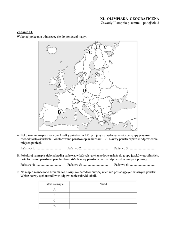 -3/1- XL OLIMPIADA GEOGRAFICZNA Zawody II stopnia pisemne – podejście 3 Zadanie 14. Wykonaj polecenia odnoszące się do poniższej mapy. A. Pokoloruj na mapie czerwoną kredką państwa, w których język urzędowy należy do grupy języków zachodniosłowiańskich. Pokolorowane państwa opisz liczbami 1-3. Nazwy państw wpisz w odpowiednie miejsca poniżej. Państwo 1: ............................... Państwo 2: ............................... Państwo 3: ............................... B. Pokoloruj na mapie zieloną kredką państwa, w których język urzędowy należy do grupy języków ugrofińskich. Pokolorowane państwa opisz liczbami 4-6. Nazwy państw wpisz w odpowiednie miejsca poniżej. Państwo 4: ............................... Państwo 5: ............................... Państwo 6: ............................... C. Na mapie zaznaczono literami A-D skupiska narodów europejskich nie posiadających własnych państw. Wpisz nazwy tych narodów w odpowiednie rubryki tabeli. Litera na mapie A B C D Naród -3/2- Zadanie 15. A. Podaj nazwy państw, które są stronami konfliktów terytorialnych o obszary wymienione w tabeli. Państwo 1 Obszar Państwo 2 Falklandy Górski Karabach Kaszmir Kuryle Południowe Wyspy Senkaku Wzgórza Golan B. Przy każdym z wymienionych obszarów podkreśl dominującą przyczynę (tylko jedną) występujących tam konfliktów terytorialnych. a) Górski Karabach: ekonomiczny (przemysł przetwórczy) / ekonomiczny (surowce mineralne) / etniczno-religijny b) Kaszmir: ekonomiczny / religijny / zapewnienie dostępu do morza c) Kuryle Południowe: ekonomiczny / etniczny / religijny d) Wyspy Senkaku: ekonomiczny / etniczny / religijny Zadanie 16. Podaj nazwy mniejszości narodowych lub etnicznych związanych z wymienionymi w tabeli miejscowościami w Polsce oraz dominujące wyznanie wśród członków tej mniejszości. Uwaga! W przypadku chrześcijaństwa należy rozróżnić: grekokatolicyzm, katolicyzm, prawosławie, protestantyzm. Miejscowość Hajnówka Krapkowice Kruszyniany Przemyśl Puńsk Zelów Mniejszość narodowa lub etniczna Dominujące wyznanie wśród mniejszości -3/3- Zadanie 17. Poniżej podano nazwy wielkich sanktuariów bądź też miejscowości, w których się one znajdują. Wpisz w odpowiednie rubryki tabeli nazwy religii, których wyznawcy uznają te miejsca za święte oraz nazwy państw, w których się one znajdują. Uwaga! W przypadku chrześcijaństwa należy rozróżnić: katolicyzm, prawosławie, protestantyzm. Sanktuarium lub miejscowość Państwo Religia An-Nadżaf Amritsar Guadalupe Grabarka Lhasa Ławra Peczerska Medziugorje Wambierzyce Waranasi (Benares) Zadanie 18. Podaj nazwy państw, do których należą wymienione w tabeli wyspy. Wyspa / Wyspy Anguilla Bouveta Gwadelupa Kergulena Niedźwiedzia Państwo