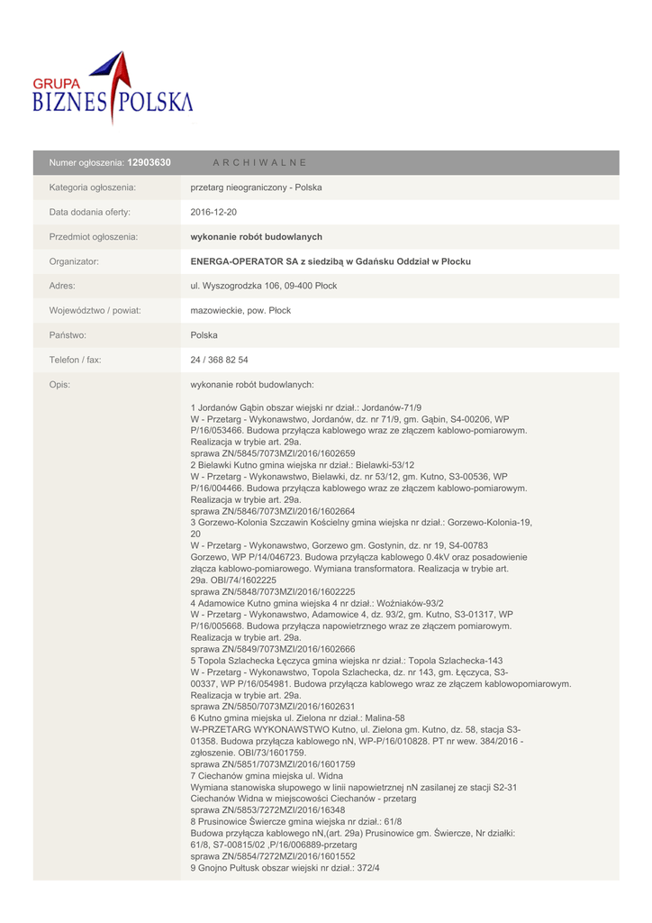 Numer ogłoszenia: 12903630 A RCHI WA L N E Kategoria ogłoszenia: przetarg nieograniczony - Polska Data dodania oferty: 2016-12-20 Przedmiot ogłoszenia: wykonanie robót budowlanych Organizator: ENERGA-OPERATOR SA z siedzibą w Gdańsku Oddział w Płocku Adres: ul. Wyszogrodzka 106, 09-400 Płock Województwo / powiat: mazowieckie, pow. Płock Państwo: Polska Telefon / fax: 24 / 368 82 54 Opis: wykonanie robót budowlanych: 1 Jordanów Gąbin obszar wiejski nr dział.: Jordanów-71/9 W - Przetarg - Wykonawstwo, Jordanów, dz. nr 71/9, gm. Gąbin, S4-00206, WP P/16/053466. Budowa przyłącza kablowego wraz ze złączem kablowo-pomiarowym. Realizacja w trybie art. 29a. sprawa ZN/5845/7073MZI/2016/1602659 2 Bielawki Kutno gmina wiejska nr dział.: Bielawki-53/12 W - Przetarg - Wykonawstwo, Bielawki, dz. nr 53/12, gm. Kutno, S3-00536, WP P/16/004466. Budowa przyłącza kablowego wraz ze złączem kablowo-pomiarowym. Realizacja w trybie art. 29a. sprawa ZN/5846/7073MZI/2016/1602664 3 Gorzewo-Kolonia Szczawin Kościelny gmina wiejska nr dział.: Gorzewo-Kolonia-19, 20 W - Przetarg - Wykonawstwo, Gorzewo gm. Gostynin, dz. nr 19, S4-00783 Gorzewo, WP P/14/046723. Budowa przyłącza kablowego 0.4kV oraz posadowienie złącza kablowo-pomiarowego. Wymiana transformatora. Realizacja w trybie art. 29a. OBI/74/1602225 sprawa ZN/5848/7073MZI/2016/1602225 4 Adamowice Kutno gmina wiejska 4 nr dział.: Woźniaków-93/2 W - Przetarg - Wykonawstwo, Adamowice 4, dz. 93/2, gm. Kutno, S3-01317, WP P/16/005668. Budowa przyłącza napowietrznego wraz ze złączem pomiarowym. Realizacja w trybie art. 29a. sprawa ZN/5849/7073MZI/2016/1602666 5 Topola Szlachecka Łęczyca gmina wiejska nr dział.: Topola Szlachecka-143 W - Przetarg - Wykonawstwo, Topola Szlachecka, dz. nr 143, gm. Łęczyca, S300337, WP P/16/054981. Budowa przyłącza kablowego wraz ze złączem kablowopomiarowym. Realizacja w trybie art. 29a. sprawa ZN/5850/7073MZI/2016/1602631 6 Kutno gmina miejska ul. Zielona nr dział.: Malina-58 W-PRZETARG WYKONAWSTWO Kutno, ul. Zielona gm. Kutno, dz. 58, stacja S301358. Budowa przyłącza kablowego nN, WP-P/16/010828. PT nr wew. 384/2016 zgłoszenie. OBI/73/1601759. sprawa ZN/5851/7073MZI/2016/1601759 7 Ciechanów gmina miejska ul. Widna Wymiana stanowiska słupowego w linii napowietrznej nN zasilanej ze stacji S2-31 Ciechanów Widna w miejscowości Ciechanów - przetarg sprawa ZN/5853/7272MZI/2016/16348 8 Prusinowice Świercze gmina wiejska nr dział.: 61/8 Budowa przyłącza kablowego nN,(art. 29a) Prusinowice gm. Świercze, Nr działki: 61/8, S7-00815/02 ,P/16/006889-przetarg sprawa ZN/5854/7272MZI/2016/1601552 9 Gnojno Pułtusk obszar wiejski nr dział.: 372/4 Budowa przyłącza kablowego nN- wcinka, Przyłącze do: Gnojno, Nr działki: 372/4, S2-1061, WP P/16/043376 - przetarg sprawa ZN/5855/7272MZI/2016/1602103 10 Pułtusk miasto ul. 3 Maja nr dział.: 93 Budowa przyłącza kablowego nN, Pułtusk, ul. 3 Maja, dz. nr 93, S2-1046, WP P/15/005834 - przetarg sprawa ZN/5856/7272MZI/2016/1600123 11 Lubomin Nasielsk obszar wiejski nr dział.: 32/4 Budowa przyłącza kablowego nN, Lubomin, dz. nr 32/4, S7-737, P/16/034151 przetarg sprawa ZN/5857/7272MZI/2016/1500187 Specyfikacja: Warunki Zamówienia wraz z załącznikami dla poszczególnych przetargów można pobrać ze strony internetowej Zamawiającego pod adresem: http://bip.energa-operator.pl/centrala/lokalne/przetargi.xml?group=centrala Ogólne Warunki Umów dostępne są na stronie internetowej Zamawiającego pod adresem: http://www.energaoperator. pl/dostawcy_i_przetargi/regulaminy.xml Miejsce i termin składania ofert: Miejsce i termin składania ofert: siedziba Zamawiającego, pok. 65 do 29-12-2016 godz. 10:00 Otwarcie ofert: Miejsce i termin publicznego otwarcia ofert: siedziba Zamawiającego, Salka konferencyjna na II piętrze data 29-12-2016 godz. 11:00 Termin składania: 2016-12-29 Miejsce i termin realizacji: Okres realizacji zamówienia bezwzględnie wymagany: Przetarg nr 1 - 15-02-2017 Przetarg nr 2 - 15-02-2017 Przetarg nr 3 - 10-02-2017 Przetarg nr 4 - 24-02-2017 Przetarg nr 5 - 24-02-2017 Przetarg nr 6 - 10-03-2017 Przetarg nr 7 - 15-04-2017 Przetarg nr 8 - 25-03-2017 Przetarg nr 9 - 05-04-2017 ENERGA - OPERATOR SA. Oddział w Płocku Ogłoszenie nr 767/W/16/Kutno o przetargach nieograniczonych na wykonanie robót budowlanych Przetarg nr 10 - 10-04-2017 Przetarg nr 11 - 15-04-2017 Wymagania: Do przetargu mogą przystąpić Wykonawcy zakwalifikowani do prac na rzecz ENERGA - OPERATOR SA i znajdujący się w Rejestrze Kwalifikowanych Wykonawców oraz spełniają pozostałe wymagania określone w WZ. Wniosek o umieszczenie w RKW wraz z Procedurą można pobrać ze strony: http://www.energa-operator.pl/dostawcy_i_przetargi/regulaminy.xml Uwagi: Kryteria wyboru oferty i ich znaczenie (w %): Przetarg nr 1 Zadanie: 1 Cena brutto [100%] Przetarg nr 2 Zadanie: 1 Cena brutto [100%] Przetarg nr 3 Zadanie: 1 Cena brutto [100%] Przetarg nr 4 Zadanie: 1 Cena brutto [100%] Przetarg nr 5 Zadanie: 1 Cena brutto [100%] Przetarg nr 6 Zadanie: 1 Cena brutto [100%] Przetarg nr 7 Zadanie: 1 Cena brutto [100%] Przetarg nr 8 Zadanie: 1 Cena brutto [100%] Przetarg nr 9 Zadanie: 1 Cena brutto [100%] Przetarg nr 10 Zadanie: 1 Cena brutto [100%] Przetarg nr 11 Zadanie: 1 Cena brutto [100%] Termin związania z ofertą: 90 dni od daty upływu terminu składania ofert Kontakt: 2) Pracownikiem uprawnionym do kontaktów z Wykonawcami jest: Małgorzata Pietrzak, w godz. 8:00-14:00, tel. 24 / 368 82 54 adres email: [email protected] Numer dokumentu: 767/W/16/Kutno Źródło: Internet i własne Załączniki: ZIP załącznik