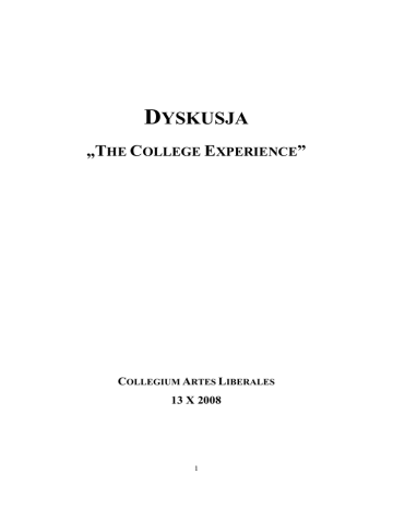 DYSKUSJA „THE COLLEGE EXPERIENCE” COLLEGIUM ARTES LIBERALES 13 X 2008 1 SPIS RZECZY I. WPROWADZENIE. O COLLEGE’U I O PRACACH STUDENTÓW II. ESEJE STUDENTÓW śYCIE W COLLEGE’U LEŚNIAK TOMASZ RADOŃ BARBARA SMOLEŃ RAFAŁ CIACH MACIEJ ZATOŃSKI MARCEL BARAŃSKI MARCIN BANASIAK SABINA PONIKIEWSKI ŁUKASZ PROGRAM STUDIÓW W COLLEGE’U CIEŚLAR JAN KOEHLER OLGA GODZISZEWSKI MICHAŁ GILEWSKI WAWRZYNIEC RADOŃ BARBARA PIONNIER ALEKSANDER ŁEŁYK MATEUSZ NIEMKIEWICZ KLAUDIA KONTOWSKI DANIEL III. REFLEKSJE STUDENTÓW NA TEMAT ZAJĘĆ SZTUKI PRACY NAUKOWEJ 2 WPROWADZENIE O COLLEGE’U I O PRACACH STUDENTÓW Broszura ta powstała w ramach zajęć w Collegium Artes Liberales pod nazwą Sztuka Pracy Naukowej. Studenci wraz z prowadzącymi najpierw przeczytali i omówili ksiąŜkę Ernesta Boyera College: The undergraduate experience in America. Następnie kaŜdy student wybrał fragment z ksiąŜki, na podstawie którego napisał kilka esejów, kaŜdy inną techniką konstruowania tekstu. Wybraliśmy College do lektury, poniewaŜ autor przedstawia doświadczenie studenckie w college’u. Jest to więc temat w centrum zainteresowania studentów nowoprzybyłych na MISH i rozwaŜających przystąpienie do Collegium Artes Liberales. Choć Collegium na UW to nie amerykański college, obie instytucje głoszą jednak podobne idee i odwołują się do podobnych rozwiązań programowych (np. core curriculum). W swoich esejach studenci korzystali z kluczowych pojęć i spostrzeŜeń stosowanych przez Boyera zaczerpniętych z badań sondaŜowych oraz wizytacji w kampusach wielu amerykańskich college’y. Tytuły rozdziałów dobrze oddają tematykę, którą Boyer porusza. Orientation: Affirming the traditions „Wprowadzenie do Ŝycia w nowym środowisku”. Ale jak umoŜliwić przysposobienie do nowych warunków? Jak przekazać cele i tradycje, przedstawić przywileje i obowiązki „nowego Ŝycia”? Jak pogodzić dąŜenie do indywidualnych osiągnięć z odpowiedzialnością wobec całej społeczności? General education: The integrated core Pierwsze zadanie amerykańskiego college’u, to oferowanie studentom tak zwanego ogólnego kształcenia. Ale co to oznacza? Zajęcia remedialne (wyrównawcze)? Dodatkowe lekcje języków 3 obcych? Boyer kładzie nacisk na writing across the curriculum. Studenci powinni uczyć się pisać na kaŜdych zajęciach, włączając w to zajęcia przyrodnicze, a prowadzący powinni zwracać uwagę zarówno na treść, jak i na jakość wypowiedzi. Wiele college’y korzysta ze strategii core curriculum, czyli zestawu podstawowych przedmiotów, obowiązkowych dla wszystkich studentów pierwszego i drugiego roku. W ramach tych zajęć studenci gromadzą ogólną wiedzę z róŜnych dziedzin (humanistycznych, społecznych i matematyczno-przyrodniczych). Boyer zauwaŜa jednak, Ŝe studenci nie zawsze rozumieją cel tych zajęć „trzonowych”. Proponuje integrated core. Ale stawia pytanie: jak zintegrować zajęcia, aby rzeczywiście stworzyć pomosty między dziedzinami? Specialization: The enriched major Drugim zadaniem amerykańskiego college’u jest przygotowanie studentów do rozpoczęcia pracy w wybranej dziedzinie (major). Specjalizacja jest oczywiście związana z przyszłym zawodem. Czy taki cel nie kłóci się jednak z załoŜeniami liberal education? W odpowiedzi Boyer proponuje major „wzbogacony” przez konteksty historyczne, społeczno-ekonomiczne oraz etyczne. Jak konkretnie wyglądałyby zajęcie w tak wzbogaconej specjalizacji? Life outside the classroom oraz Service: Getting involved śycie w college’u to według Boyera więcej niŜ wykłady i seminaria. Poza salami wykładowymi studenci uczestniczą w zajęciach sportowych, teatralnych, wydają gazety college’owe oraz podejmują pracę jako wolontariusze. Jaki stosunek mają takie zajęcia do programu studiów? Eseje studentów zebrane w tej broszurze słuŜą rozwaŜeniu róŜnych elementów wywodu i wniosków Boyera. Są tekstami niedługimi, pisanymi jako ćwiczenia warsztatowe. Stanowią ciekawy zaczyn do dyskusji, ale czytelnicy powinni pamiętać, Ŝe przedstawiają wiedzę na temat college’u zaczerpniętą z lektury jednej ksiąŜki i wstępnych omówień na naszych zajęciach. Na koniec kilka uwag na temat ćwiczeń Sztuki Pracy Naukowej. Konkretnym zadaniem studentów było konstruowanie tekstów według struktury: • temat – zawarty w tytule; 4 • teza – pytanie, na które autor w tekście odpowiada, zagadnienie, które rozwaŜa bądź myśl, którą rozwija; • akapit – podstawowa zasada organizacji wywodu; • w kaŜdym akapicie musi być zdanie główne (topic sentence), które zapowiada bądź streszcza, o czym mowa w akapicie. MoŜna konstruować tekst według takiej struktury na dwa sposoby (przećwiczone na zajęciach): • metodą swobodnego wypisywania (freewriting). Tak „wypisany” tekst moŜna następnie uporządkować, aby struktura stała się jasna; • metodą organicznego planu tekstu (organic outlining), która składa się z ułoŜenia szeregu myśli na dany temat w zdania oraz organizację tych zdań w plan, w którym te zdania słuŜą jako topic sentences akapitów. Tekst wyprodukowany jedną lub drugą metodą stanowi wstępną wersję, którą autor poddaje kolejnej reorganizacji merytorycznej i strukturalnej, a na samym końcu doszlifowuje stylistycznie. dr GraŜyna Czetwertyńska prof. Andrzej Tymowski (prowadzący zajęcia SzPN) 5