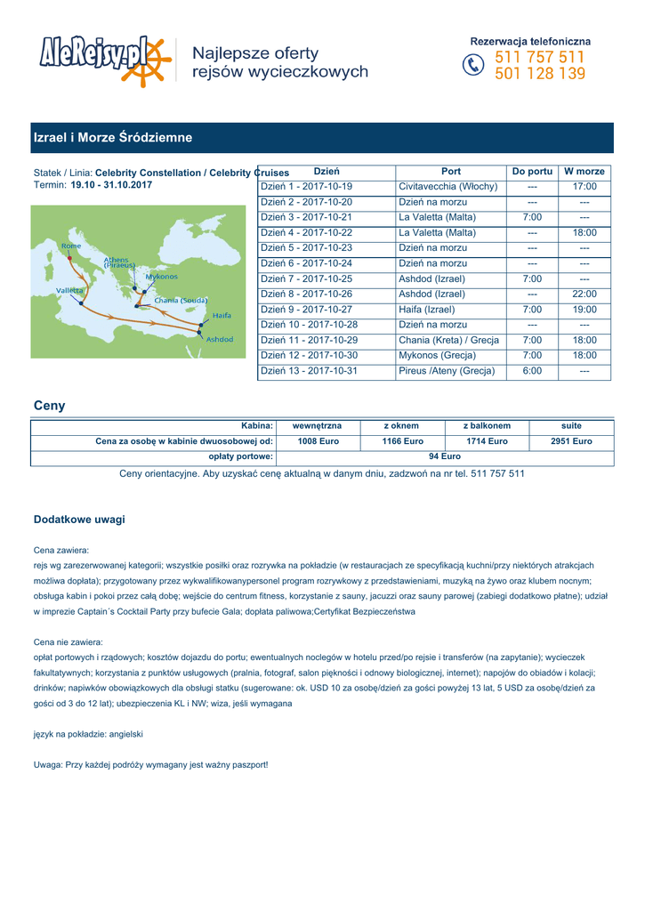 Izrael i Morze Śródziemne Dzień Statek / Linia: Celebrity Constellation / Celebrity Cruises Termin: 19.10 - 31.10.2017 Dzień 1 - 2017-10-19 Port Do portu W morze Civitavecchia (Włochy) --- 17:00 Dzień 2 - 2017-10-20 Dzień na morzu --- --- Dzień 3 - 2017-10-21 La Valetta (Malta) 7:00 --- Dzień 4 - 2017-10-22 La Valetta (Malta) --- 18:00 Dzień 5 - 2017-10-23 Dzień na morzu --- --- Dzień 6 - 2017-10-24 Dzień na morzu --- --- Dzień 7 - 2017-10-25 Ashdod (Izrael) 7:00 --- Dzień 8 - 2017-10-26 Ashdod (Izrael) --- 22:00 Dzień 9 - 2017-10-27 Haifa (Izrael) 7:00 19:00 Dzień 10 - 2017-10-28 Dzień na morzu --- --- Dzień 11 - 2017-10-29 Chania (Kreta) / Grecja 7:00 18:00 Dzień 12 - 2017-10-30 Mykonos (Grecja) 7:00 18:00 Dzień 13 - 2017-10-31 Pireus /Ateny (Grecja) 6:00 --- Ceny Kabina: Cena za osobę w kabinie dwuosobowej od: wewnętrzna z oknem z balkonem suite 1008 Euro 1166 Euro 1714 Euro 2951 Euro opłaty portowe: 94 Euro Ceny orientacyjne. Aby uzyskać cenę aktualną w danym dniu, zadzwoń na nr tel. 511 757 511 Dodatkowe uwagi Cena zawiera: rejs wg zarezerwowanej kategorii; wszystkie posiłki oraz rozrywka na pokładzie (w restauracjach ze specyfikacją kuchni/przy niektórych atrakcjach możliwa dopłata); przygotowany przez wykwalifikowanypersonel program rozrywkowy z przedstawieniami, muzyką na żywo oraz klubem nocnym; obsługa kabin i pokoi przez całą dobę; wejście do centrum fitness, korzystanie z sauny, jacuzzi oraz sauny parowej (zabiegi dodatkowo płatne); udział w imprezie Captain´s Cocktail Party przy bufecie Gala; dopłata paliwowa;Certyfikat Bezpieczeństwa Cena nie zawiera: opłat portowych i rządowych; kosztów dojazdu do portu; ewentualnych noclegów w hotelu przed/po rejsie i transferów (na zapytanie); wycieczek fakultatywnych; korzystania z punktów usługowych (pralnia, fotograf, salon piękności i odnowy biologicznej, internet); napojów do obiadów i kolacji; drinków; napiwków obowiązkowych dla obsługi statku (sugerowane: ok. USD 10 za osobę/dzień za gości powyżej 13 lat, 5 USD za osobę/dzień za gości od 3 do 12 lat); ubezpieczenia KL i NW; wiza, jeśli wymagana język na pokładzie: angielski Uwaga: Przy każdej podróży wymagany jest ważny paszport! Celebrity Constellation Celebrity Constellation Tonaż: 91000 ton Rok budowy: 2002 Długość: 294 m Szerokość: 32,20 m Szybkość: 24 węzły Pokłady pasażerskie: 11 Załoga: 999 Pasażerowie: 2034 Celebrity Constellation należy do pełnych elegancji statków klasy Millenium. Ich wyznaczniki to między innymi światowej klasy Aqua Spa, oraz nowoczesne centrum fitness z panoramicznymi oknami sięgającymi od podłogi do sufitu. Centralny holl pnie się przez jedenaście pokładów, po bokach statku widać szklane platformy wind. Na każdym z 11 pokładów można znaleźć styl i klimat rodem z bardzo dobrego hotelu. Na pokładzie: Online@Celebrity – pokładowa kawiarenka internetowa, by móc się dzielić na bieżąco wrażeniami z rejsu z rodziną i przyjaciółmi; The Conservatory – umieszczone wysoko nad poziomem morza Conservatory jest kwitnącym, zachwycającym ogrodem z kompozycjami m.in. znanego na całym świecie Emilio Robby; biblioteka, Night Club Reflections, ścieżka do joggingu, klub Shipmates Fun Factory – dla dzieci w wieku od 3 do 17 lat, zapewnia opiekę wykwalifikowanego personelu do tego bogaty wybór gier i zajęć; Fitness Center – gdzie można wykupić zajęcia z prywatnym instruktorem, uczestniczyć w zajęciach grupowych, sprawdzić formę w basenie bądź na jednej z nowoczesnych maszyn; Persian Garden – można tutaj cieszyć się ciepłem relaksującej pary, skorzystać z prywatnej sauny, a wszystko przy dźwiękach muzyki new age; AquaSpa® by Elemis – w relaksującym otoczeniu tego światowej klasy SPA można skorzystać z bogatej oferty zabiegów jak Thalassoterapia, kąpiele, ceremonia Rasul, błota lecznicze, czy ziołowa łaźnia parowa; salon fryzjerski, solarium, basen Seaside Pool, 4 jacuzzi, Teatr "Celebrity Theater" – scena tego nowoczesnego teatru jest pełna życia, na widzów czekają efekty specjalne, oraz produkcje w stylu broadway; galeria sklepów Emporium, kasyno "Fortune's", Rendez-Vous Lounge – idealne miejsce na spotkanie ze spokojnymi zakątkami, kino i centrum konferencyjne, boisko sportowe.