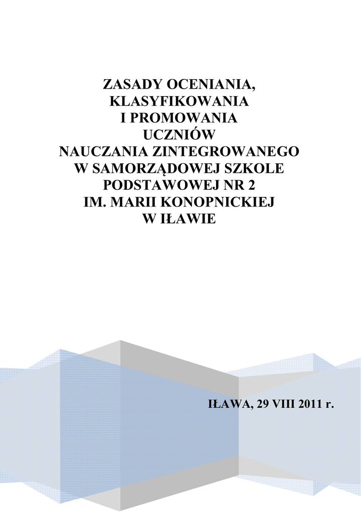 ZASADY OCENIANIA, KLASYFIKOWANIA I PROMOWANIA UCZNIÓW NAUCZANIA ZINTEGROWANEGO W SAMORZĄDOWEJ SZKOLE PODSTAWOWEJ NR 2 IM. MARII KONOPNICKIEJ W IŁAWIE IŁAWA, 29 VIII 2011 r. ZASADY OCENIANIA, KLASYFIKOWANIA I PROMOWANIA UCZNIÓW NAUCZANIA ZINTEGROWANEGO W SAMORZĄDOWEJ SZKOLE PODSTAWOWEJ NR 2 IM. MARII KONOPNICKIEJ W IŁAWIE ZASADY OCENIANIA, KLASYFIKOWANIA I PROMOWANIA UCZNIÓW NAUCZANIA ZINTEGROWANEGO W SAMORZĄDOWEJ SZKOLE PODSTAWOWEJ NR 2 IM. MARII KONOPNICKIEJ W IŁAWIE I. PODSTAWA PRAWNA Zasady oceniania, klasyfikowania i promowania uczniów opracowano na podstawie Dz. U. Nr 156, poz. 1046 Rozporządzenie Ministra Edukacji Narodowej z dnia 20 sierpnia 2010 r. zmieniające rozporządzenie w sprawie warunków i sposobu oceniania, klasyfikowania i promowania uczniów, słuchaczy oraz przeprowadzania sprawdzianów i egzaminów w szkołach publicznych na podstawie art. 22 ust. 2 pkt 4 ustawy z dnia 7 września 1991 r. o systemie oświaty (Dz. U. z 2004 r. Nr 256 poz. 2572, z późn. zm.) w rozporządzeniu Ministra Edukacji Narodowej z dnia 30 kwietnia 2007 r. w sprawie warunków i sposobu oceniania, klasyfikowania i promowania uczniów i słuchaczy oraz przeprowadzaniu sprawdzianów i egzaminów w szkołach publicznych (Dz. U. Nr 83, poz. 562, z późn. zm.) Strona 2 z 9 ZASADY OCENIANIA, KLASYFIKOWANIA I PROMOWANIA UCZNIÓW NAUCZANIA ZINTEGROWANEGO W SAMORZĄDOWEJ SZKOLE PODSTAWOWEJ NR 2 IM. MARII KONOPNICKIEJ W IŁAWIE II.POSTANOWIENIA SZCZEGÓŁOWE 1. W procesie oceniania nauczyciele biorą pod uwagę: a. Indywidualne zdolności i możliwości dziecka w opanowywaniu materiału edukacyjnego b. Poziom opanowanego materiału edukacyjnego c. Stopień zaangażowanie uczniów i wkład pracy w procesie zdobywania wiadomości i umiejętności d. Umiejętność wykorzystania zdobytej wiedzy w samodzielnej pracy e. Postępy dziecka w rozwoju społeczno – emocjonalnym f. Diagnozę i zalecenia poradni psychologiczno-pedagogicznych lub specjalistycznych w przypadku uczniów posiadających orzeczenie o potrzebie kształcenia specjalnego lub opinie stwierdzające deficyty rozwojowe 2. Sprawdzanie osiągnięć i postępów dziecka w zakresie zachowania, edukacji polonistycznej, języka obcego nowożytnego, edukacji muzycznej, edukacji plastycznej, edukacji społecznej, edukacji przyrodniczej, edukacji matematycznej, zajęć komputerowych, zajęć technicznych i wychowania fizycznego będzie odbywało się na podstawie: a. Prowadzonych przez nauczyciela obserwacji w różnych sytuacjach dydaktyczno – wychowawczych b. Prac pisemnych sprawdzających znajomość zasad ortograficznych, gramatycznych, umiejętności konstruowania różnych form wypowiedzi pisemnych; sprawność rachunkową; wiedzę społeczno – przyrodniczą c. Wypowiedzi ustnych samorzutnych, swobodnych i ukierunkowanych d. Czytania - technika czytania głośnego, czytania ze zrozumieniem, czytania z podziałem na role e. Prac plastycznych i technicznych f. Obserwacji posługiwania się myszką i klawiaturą podczas korzystania komputera, Internetu i multimediów Strona 3 z 9 ZASADY OCENIANIA, KLASYFIKOWANIA I PROMOWANIA UCZNIÓW NAUCZANIA ZINTEGROWANEGO W SAMORZĄDOWEJ SZKOLE PODSTAWOWEJ NR 2 IM. MARII KONOPNICKIEJ W IŁAWIE Szczegółowe kryteria na poszczególne poziomy stanowią załączniki: • Załącznik 1 (zgodny z NPP) – klasa pierwsza • Załącznik 2 a, 2b (zgodny z NPP i realizowanym programem nauczania) – klasa druga • Załącznik 3 (zgodny z NPP) – klasa trzecia Szczegółowe kryteria dla uczniów z orzeczeniami o potrzebie kształcenia specjalnego lub indywidualnego nauczania opracowuje nauczyciel prowadzący we współpracy z nauczycielem wspierającym a zatwierdza „Zespół ds. integracji klas I -III”. Szczegółowe kryteria oceniania w zakresie nauczanego języka obcego opracowują nauczyciele uczący tego języka. Zestaw tych kryteriów stanowi część WSO. Szczegółowe kryteria oceniania w zakresie nauczanego wychowania fizycznego opracowują nauczyciele uczący wychowania fizycznego. Zestaw tych kryteriów stanowi część WSO. 3. Bieżąca ocena będzie odnotowywana w dziennikach lekcyjnych oraz w dzienniczkach ucznia punktacją cyfrową, która oznacza osiągnięty przez ucznia poziom wymagań objęty podstawą programową. Zgodnie z wyznaczonymi kryteriami (Załącznik 1 – klasa pierwsza, Załącznik 2 – klasa druga, Załącznik 3 – klasa trzecia) przyjęto następujące kryteria: 6 – poziom wykraczający 5 – poziom pełny 4 – poziom rozszerzony 3 - poziom podstawowy 2 - poziom konieczny 11- poziom niższy niż konieczny 1 W przypadku, gdy uczeń mimo zorganizowanej ze strony nauczyciela pomocy (indywidualizacja nauczania, zajęcia dodatkowe) nie opanował minimalnej wiedzy i umiejętności objętej podstawą programową z zakresu poziomu koniecznego, otrzymuje punktację cyfrową 1. Strona 4 z 9 ZASADY OCENIANIA, KLASYFIKOWANIA I PROMOWANIA UCZNIÓW NAUCZANIA ZINTEGROWANEGO W SAMORZĄDOWEJ SZKOLE PODSTAWOWEJ NR 2 IM. MARII KONOPNICKIEJ W IŁAWIE a. Oceniając zachowanie ucznia nauczyciel uwzględnia wszystkie obszary funkcjonowania dziecka w szkole, wyróżniając następujące aspekty oceny zachowania ucznia: 1) wywiązywanie się z obowiązków ucznia; 2) postępowanie zgodne z dobrem społeczności szkolnej; 3) dbałość o honor i tradycje szkoły; 4) dbałość o piękno mowy ojczystej; 5) dbałość o bezpieczeństwo i zdrowie własne oraz innych osób; 6) godne, kulturalne zachowanie się w szkole i poza nią; 7) okazywanie szacunku innym osobom. Bieżąca ocena zachowania jest przekazywana uczniom i rodzicom w formie ustnej lub pisemnej. b. Przy ustalaniu oceny klasyfikacyjnej zachowania ucznia, u którego stwierdzono zaburzenia lub odchylenia rozwojowe, należy uwzględnić wpływ stwierdzonych zaburzeń lub odchyleń na jego zachowanie na podstawie orzeczenia o potrzebie kształcenia specjalnego albo indywidualnego nauczania lub opinii publicznej poradni psychologicz