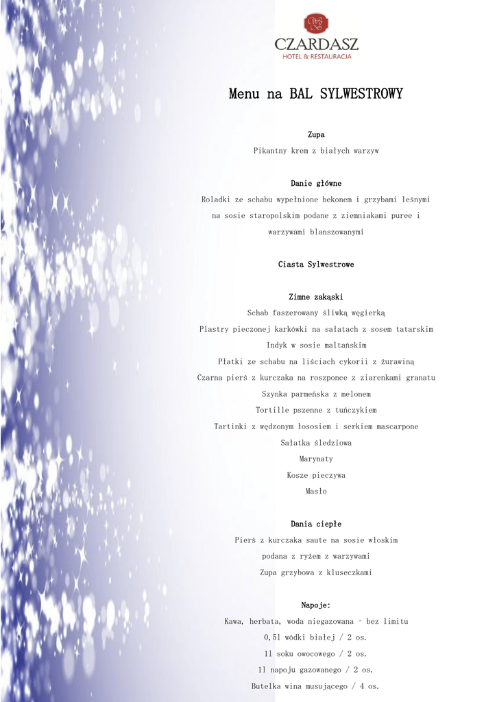 Menu na BAL SYLWESTROWY Zupa Pikantny krem z białych warzyw Danie główne Roladki ze schabu wypełnione bekonem i grzybami leśnymi na sosie staropolskim podane z ziemniakami puree i warzywami blanszowanymi Ciasta Sylwestrowe Zimne zakąski Schab faszerowany śliwką węgierką Plastry pieczonej karkówki na sałatach z sosem tatarskim Indyk w sosie maltańskim Płatki ze schabu na liściach cykorii z żurawiną Czarna pierś z kurczaka na roszponce z ziarenkami granatu Szynka parmeńska z melonem Tortille pszenne z tuńczykiem Tartinki z wędzonym łososiem i serkiem mascarpone Sałatka śledziowa Marynaty Kosze pieczywa Masło Dania ciepłe Pierś z kurczaka saute na sosie włoskim podana z ryżem z warzywami Zupa grzybowa z kluseczkami Napoje: Kawa, herbata, woda niegazowana – bez limitu 0,5l wódki białej / 2 os. 1l soku owocowego / 2 os. 1l napoju gazowanego / 2 os. Butelka wina musującego / 4 os.