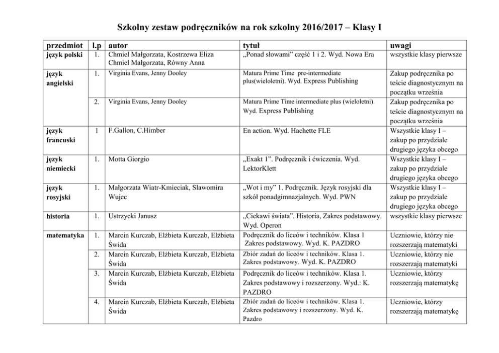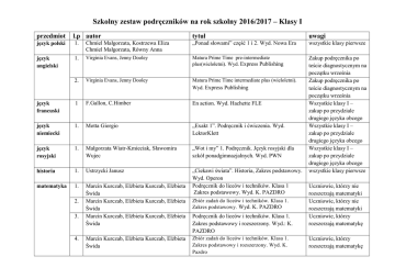 Szkolny zestaw podręczników na rok szkolny 2016/2017 – Klasy I przedmiot l.p autor tytuł uwagi język polski 1. Chmiel Małgorzata, Kostrzewa Eliza Chmiel Małgorzata, Równy Anna „Ponad słowami” część 1 i 2. Wyd. Nowa Era wszystkie klasy pierwsze język angielski 1. Virginia Evans, Jenny Dooley Matura Prime Time pre-intermediate plus(wieloletni). Wyd. Express Publishing 2. Virginia Evans, Jenny Dooley Matura Prime Time intermediate plus (wieloletni). Wyd. Express Publishing język francuski 1 F.Gallon, C.Himber En action. Wyd. Hachette FLE język niemiecki 1. Motta Giorgio „Exakt 1”. Podręcznik i ćwiczenia. Wyd. LektorKlett język rosyjski 1. Małgorzata Wiatr-Kmieciak, Sławomira Wujec „Wot i my” 1. Podręcznik. Język rosyjski dla szkół ponadgimnazjalnych. Wyd. PWN historia 1. Ustrzycki Janusz matematyka 1. Marcin Kurczab, Elżbieta Kurczab, Elżbieta Świda Marcin Kurczab, Elżbieta Kurczab, Elżbieta Świda Marcin Kurczab, Elżbieta Kurczab, Elżbieta Świda „Ciekawi świata”. Historia, Zakres podstawowy. Wyd. Operon Podręcznik do liceów i techników. Klasa 1 Zakres podstawowy. Wyd. K. PAZDRO Zakup podręcznika po teście diagnostycznym na początku września Zakup podręcznika po teście diagnostycznym na początku września Wszystkie klasy I – zakup po przydziale drugiego języka obcego Wszystkie klasy I – zakup po przydziale drugiego języka obcego Wszystkie klasy I – zakup po przydziale drugiego języka obcego wszystkie klasy pierwsze 2. 3. 4. Marcin Kurczab, Elżbieta Kurczab, Elżbieta Świda Zbiór zadań do liceów i techników. Klasa 1. Zakres podstawowy. Wyd. K. PAZDRO Podręcznik do liceów i techników. Klasa 1. Zakres podstawowy i rozszerzony. Wyd.: K. PAZDRO Zbiór zadań do liceów i techników. Klasa 1. Zakres podstawowy i rozszerzony. Wyd. K. Pazdro Uczniowie, którzy nie rozszerzają matematyki Uczniowie, którzy nie rozszerzają matematyki Uczniowie, którzy rozszerzają matematykę Uczniowie, którzy rozszerzają matematykę Biologia na czasie – podręcznik dla szkół ponadgimnazjalnych - zakres podstawowy + karty pracy – zakres podstawowy. Wyd. Nowa Era To jest chemia. Podręcznik dla szkół ponadgimnazjalnych. Zakres podstawowy. Wyd. Nowa Era wszystkie klasy pierwsze Fiakowska Maria Podręcznik do szkół ponadgimnazjalnych zakres podstawowy „Świat fizyki”. Wyd. ZamKor wszystkie klasy pierwsze 1. Sławomir Kurek wszystkie klasy pierwsze religia 1. ks. Strus Robert, ks. Galant Wiesław Geografia. Odkrywamy na nowo. Zakres podstawowy. Wyd. Operon Świadczę o Jezusie w Kościele. Wyd. Gaudian informatyka 1. Krawczyński E., Talaga Z., Wilk M. wszystkie klasy pierwsze wiedza o kulturze edukacja dla bezpiecz. WOS 1. Forysiewicz Barbara, Świętochowska Grażyna, Sacha Magdalena „Informatyka nie tylko dla uczniów”. Wyd. PWN Spotkanie z kulturą. Podręcznik do wiedzy o kulturze dla liceum i technikum. Wyd. Nowa Era 1. Bogusława Breitkopf, Mariusz Cieśla wszystkie klasy pierwsze 1. Batorski Maciej podstawy przedsięb. 1. Katarzyna Garbacik, Magdalena Żmiejko Edukacja dla bezpieczeństwa. Po prostu. Wydawnictwa Szkolne i Pedagogiczne „Ciekawi świata”. Wiedza o społeczeństwie. Zakres podstawowy. Wyd. Operon Przedsiębiorczość na czasie. Podręcznik. Zakres podstawowy. Wyd. Nowa Era biologia 1. E. Bonar, W. Krzeszowiec – Jeleń, S. Czachorowski chemia 1. Romuald Hass, Aleksandra Mrzigod, Janusz Mrzigod fizyka 1. geografia wszystkie klasy pierwsze wszystkie klasy pierwsze wszystkie klasy pierwsze wszystkie klasy pierwsze wszystkie klasy pierwsze