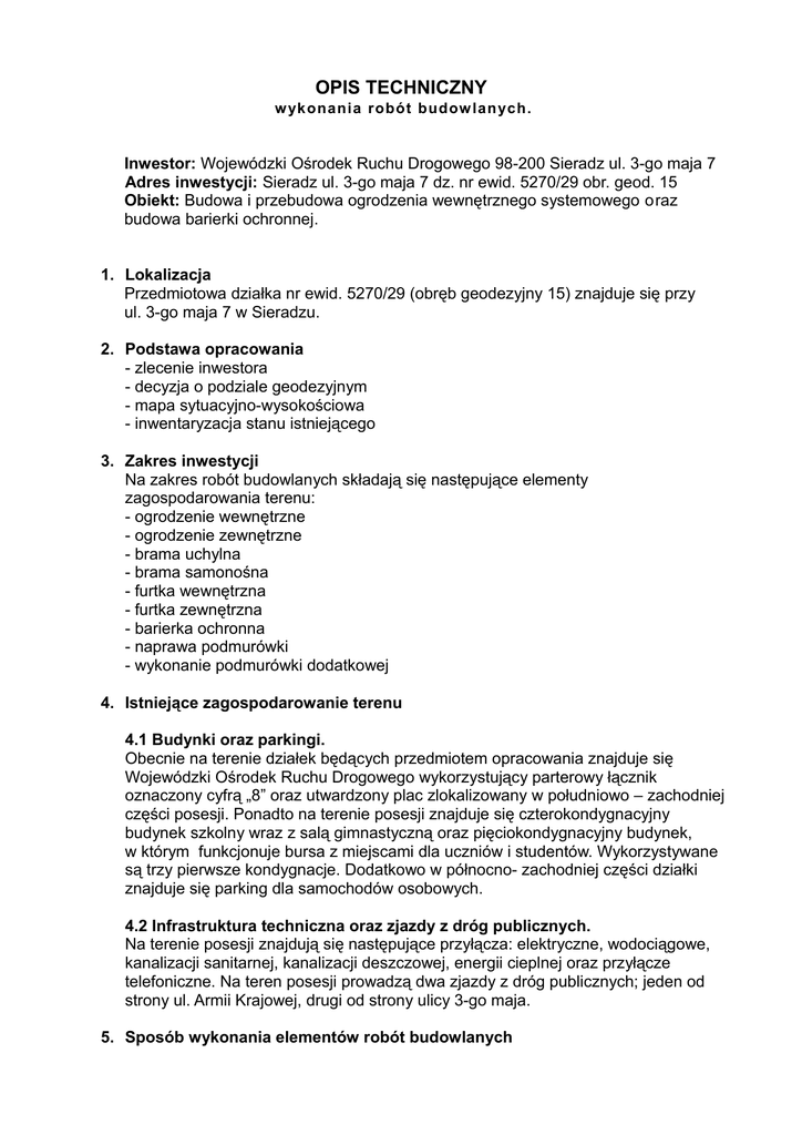 OPIS TECHNICZNY w ykonania robót budow lanych. Inwestor: Wojewódzki Ośrodek Ruchu Drogowego 98-200 Sieradz ul. 3-go maja 7 Adres inwestycji: Sieradz ul. 3-go maja 7 dz. nr ewid. 5270/29 obr. geod. 15 Obiekt: Budowa i przebudowa ogrodzenia wewnętrznego systemowego oraz budowa barierki ochronnej. 1. Lokalizacja Przedmiotowa działka nr ewid. 5270/29 (obręb geodezyjny 15) znajduje się przy ul. 3-go maja 7 w Sieradzu. 2. Podstawa opracowania - zlecenie inwestora - decyzja o podziale geodezyjnym - mapa sytuacyjno-wysokościowa - inwentaryzacja stanu istniejącego 3. Zakres inwestycji Na zakres robót budowlanych składają się następujące elementy zagospodarowania terenu: - ogrodzenie wewnętrzne - ogrodzenie zewnętrzne - brama uchylna - brama samonośna - furtka wewnętrzna - furtka zewnętrzna - barierka ochronna - naprawa podmurówki - wykonanie podmurówki dodatkowej 4. Istniejące zagospodarowanie terenu 4.1 Budynki oraz parkingi. Obecnie na terenie działek będących przedmiotem opracowania znajduje się Wojewódzki Ośrodek Ruchu Drogowego wykorzystujący parterowy łącznik oznaczony cyfrą „8” oraz utwardzony plac zlokalizowany w południowo – zachodniej części posesji. Ponadto na terenie posesji znajduje się czterokondygnacyjny budynek szkolny wraz z salą gimnastyczną oraz pięciokondygnacyjny budynek, w którym funkcjonuje bursa z miejscami dla uczniów i studentów. Wykorzystywane są trzy pierwsze kondygnacje. Dodatkowo w północno- zachodniej części działki znajduje się parking dla samochodów osobowych. 4.2 Infrastruktura techniczna oraz zjazdy z dróg publicznych. Na terenie posesji znajdują się następujące przyłącza: elektryczne, wodociągowe, kanalizacji sanitarnej, kanalizacji deszczowej, energii cieplnej oraz przyłącze telefoniczne. Na teren posesji prowadzą dwa zjazdy z dróg publicznych; jeden od strony ul. Armii Krajowej, drugi od strony ulicy 3-go maja. 5. Sposób wykonania elementów robót budowlanych 5.1 Ogrodzenie wewnętrzne – długość192 mb na mapie oznaczone kolorem zielonym. Projektuje się systemowe ogrodzenie np. firmy Germaplan – System Fox lub inne o tych samych lub lepszych parametrach. Słupki mocowane w monolitycznym fundamencie wykonanym z betonu C 20/25. Ogrodzenie wewnętrzne : systemowe – panelowe, ocynkowane ogniowo i malowane proszkowo – kolor RAL7030 ściśle według norm: EN-ISO 1491 PANELE : przęsła wykonane ze zgrzewanych prętów (poziomych i pionowych) o średnicy (z warstwą ocynku i powłoki lakierniczej) min.5,0mm, z przetłoczeniami poziomymi. Wymiar oczek dużych: 50 x 200 mm Wymiar oczek małych : 50 x 50 mm Długość przęsła panelowego : 2450 ± 2500 mm Wysokość przęsła panelowego : 1500 ± 1530 mm SŁUPKI : profil stalowy 60 x 40 x 2 mm H-2300 mm ocynkowane ogniowo i malowane proszkowo – RAL7030 wykończone kapturkiem z tworzywa. OBEJMY : pośrednie, końcowe, narożne – montowane na słupkach max co 500 mm, stalowe, ocynkowane ogniowo, malowane proszkowo jw, montowane za pomocą śrub zamkowych, podkładek i nakrętek samozrywalnych – nierdzewnych. 5.2 Ogrodzenie zewnętrzne: długość 152 mb oznaczone na mapie kolorem pomarańczowym. Demontaż starego ogrodzenia. Ogrodzenie zewnętrzne : systemowe – panelowe, ocynkowane ogniowo i malowane proszkowo – kolor RAL 7030, montowane na istniejącej podmurówce (wymaga odnowienia) na słupach ze stopą montażową (wg projektu) Panele : wysokość przęsła jw Słupy : jw (H-1600 mm) ze stopą montażową, montowane do podmurówki za pomocą kołków chemicznych Obejmy – jw. 5.3 Brama uchylna: oznaczona kolorem żółtym (od ulicy 3 Maja) Brama uchylna : systemowa – panelowa, ocynkowana ogniowo i malowana proszkowo – kolor RAL7030 Materiały : - słupy : profil stalowy 100 x 100 x 4 mm, wykończone kapturami stalowymi - rama : profil stalowy 60 x 40 x 2 mm - wypełnienie : panele jw - zawiasy nierdzewne lub ocynkowane ogniowo i malowane proszkowo (kolor jak całość), regulowane - zamek z wkładką typu Yale - ograniczniki dolne, umożliwiające zablokowanie skrzydeł bramy w pozycji – otwarte jak i zamknięte. Górna krawędź bramy w jednej płaszczyźnie z ogrodzeniem. Wykonać ławy fundamentowe zbrojone pomiędzy słupami bramy. 5.4 Brama samonośna: oznaczona kolorem żółtym (od ulicy Armii Krajowej) Brama samonośna (wymiana istniejącej) systemowa – panelowa jw, ocynkowana ogniowo i malowana proszkowo – kolor RAL7030, Materiały : - słupy : profil stalowy 80 x 80 x 3 mm, wykończone kapturami stalowymi - rama : profil stalowy 60 x 40 x 2 mm - przeciwwaga : jw - szyna jezdna : profil 80 x 80 (opcjonalnie 100 x 100 – zależnie od światła wjazdu : do 6 mb i powyżej 6 mb) - komplet wózków pięciokółkowych - pozostałe wyposażenie : zamek, pochwyt / kieszeń zamka, kółko najazdowe, stopa najazdowa, rolki prowadzące wypełnienie : panel jw Górna krawędź bramy w jednej płaszczyźnie z ogrodzeniem. Demontaż istniejącej bramy. 5.5 Furtka wewnętrzna: oznaczona kolorem różowym Furtka wewnętrzna : systemowa – panelowa, ocynkowana ogniowo i malowana proszkowo – kolor RAL7030 Materiały : - słupy : profil stalowy 60 x 60 x 3 mm, wykończone kapturami stalowymi - rama : profil stalowy 40 x 40 x 2 mm - wypełnienie : panel jw - zawiasy jw - zamek z wkładką typu Yale Górna krawędź furtki w jednej płaszczyźnie z ogrodzeniem, szerokość w świetle min. 1200 mm. 5.6 Furtka zewnętrzna: oznaczona kolorem różowym Furtka zewnętrzna : systemowa – panelowa (montowana w linii ogrodzenia zewnętrznego, w bezpośrednim sąsiedztwie bramy samonośnej; materiały – jak do bramy samonośnej Otwierana do wewnątrz. Górna krawędź furtki w jednej płaszczyźnie z ogrodzeniem, szerokość w świetle min. 1200 mm. 5.7 Barierka ochronna: wg projektu i rysunku Długość – 45 m. Na mapie oznaczona kolorem czerwonym. Wysokość barierki od poziomu zerowego - 1100mm Słupki mocowane w monolityc