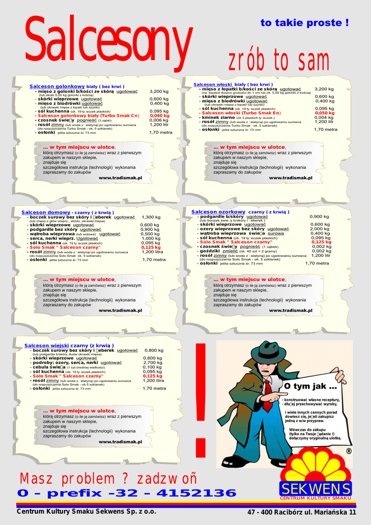 Salcesony Salceson golonkowy biały ( bez krwi ) - mięso z golonki b/kości ze skórą ugotować 3,200 kg to takie proste ! zrób to sam Salceson włoski biały ( bez krwi ) - mięso z łopatki b/kości ze skórą ugotować - skórki wieprzowe ugotować - mięso z biodrówki ugotować - skórki wieprzowe ugotować - mięso z biodrówki ugotować 0,600 kg 0,400 kg sól kuchenna (ok. 19 łyżeczek płaskich) Salceson golonkowy biały (Turbo Smak Cn) czosnek świeży pognieść (3 ząbki) rosół zimny (lub woda z żelatyną) po ugotowaniu surowca 0,095 kg 0,040 kg 0,006 kg 1,200 litr (do rozpuszczenia Turbo Smak - ok. 5 szklanek) jelita sztuczne śr. 73 mm 1,70 metra - osłonki - Salceson włoski (Turbo Smak En) - kminek ziarno (ok 3 płaskich łyżeczek ) - rosół zimny (lub woda z żelatyną) po ugotowaniu surowca (do rozpuszczenia Turbo Smak - ok. 5 szklanek) jelita sztuczne śr. 73 mm - osłonki 1,70 metra ... w tym miejscu w ulotce, którą otrzymasz (o ile ją zamówisz) wraz z pierwszym zakupem w naszym sklepie, znajduje się szczegółowa instrukcja (technologii) wykonania zapraszamy do zakupów www.tradismak.pl którą otrzymasz (o ile ją zamówisz) wraz z pierwszym zakupem w naszym sklepie, znajduje się szczegółowa instrukcja (technologii) wykonania zapraszamy do zakupów www.tradismak.pl - boczek surowy bez skóry i żeberek ugotować Salceson ozorkowy czarny ( z krwią ) 1,300 kg - podgardle b/skóry ugotować skórki wieprzowe ugotować podgardle bez skóry ugotować wątroba wieprzowa (lub wołowa) ugotować serca, nerki wieprz. Ugotować sól kuchenna (ok. 19 łyżeczek płaskich) Solo Smak " Salceson czarny" rosół zimny (lub woda z żelatyną) po ugotowaniu surowca 0,600 kg 0,900 kg 0,500 kg 1,000 kg 0,095 kg 0,125 kg 1,200 litra (do rozpuszczenia Solo Smak ok. 5 szklanek) jelita sztuczne śr. 73 mm - osłonki 1,70 metra 0,900 kg (lub boczek świeży b/skóry i żeberek ) (lub mięso z głów wieprz., skórki, okrawki mięsa) - skórki wieprzowe ugotować 0,600 kg ozory wieprzowe bez skóry ugotować 2,000 kg wątroba wieprzowa świeża surowa 0,400 kg sól kuchenna (ok. 19 łyżeczek płaskich) 0,095 kg Solo Smak " Salceson czarny" 0,125 kg 0,002 kg czosnek świeży pognieść (1 ząbek) goździki zmielić (ok. 40 szt = 2 gramy) 0,002 kg rosół zimny (lub woda z żelatyną) po ugotowaniu surowca 1,200 litr (do rozpuszczenia Solo Smak - ok. 5 szklanek) jelita sztuczne śr. 73 mm - osłonki 1,70 metra ... w tym miejscu w ulotce, ... w tym miejscu w ulotce, którą otrzymasz (o ile ją zamówisz) wraz z pierwszym zakupem w naszym sklepie, znajduje się szczegółowa instrukcja (technologii) wykonania zapraszamy do zakupów www.tradismak.pl którą otrzymasz (o ile ją zamówisz) wraz z pierwszym zakupem w naszym sklepie, znajduje się szczegółowa instrukcja (technologii) wykonania zapraszamy do zakupów www.tradismak.pl Salceson wiejski czarny (z krwią ) - boczek surowy bez skóry i żeberek ugotować 0,800 kg (lub podgardle b/skóry, tłuste okrawki mięsa) - 0,095 kg 0,050 kg 0,004 kg 1,200 litr ... w tym miejscu w ulotce, Salceson domowy - czarny ( z krwią ) - 0,600 kg 0,400 kg (lub okrawki mięsa z łopaki lub szynki) sól kuchenna (ok. 19 łyżeczek płaskich) (lub okrawki mięsa z łopaki lub szynki) - 3,200 kg (na łopatce tłuszcz grubości do 1 cm lub ok. 5,50 kg golonki z kością) (lub około 5,50 kg golonki z kością) skórki wieprzowe ugotować podroby: ozory, serca, nerki ugotować cebula świeża (1 szt średniej wielkości) sól kuchenna (ok. 19 łyżeczek płaskich) Solo Smak " Salceson czarny" rosół zimny (lub woda z żelatyną) po ugotowaniu surowca 0,600 kg 2,700 kg 0,100 kg 0,095 kg 0,125 kg 1,200 litra (do rozpuszczenia Solo Smak - ok.5 szklanek) jelita sztuczne śr. 73 mm 1,70 metra - osłonki ... w tym miejscu w ulotce, którą otrzymasz (o ile ją zamówisz) wraz z pierwszym zakupem w naszym sklepie, znajduje się szczegółowa instrukcja (technologii) wykonania zapraszamy do zakupów www.tradismak.pl ! Masz problem ? zadzwoñ 0 - prefix -32 - 4152136 Centrum Kultury Smaku Sekwens Sp. z o.o. O tym jak ... - konstruować własne receptury, - dłużej przechowywać wyroby, i wiele innych cennych porad dowiesz się, jeżeli zakupisz jedną z w/w przypraw. Wówczas do zakupu (tylko na Twoje żądanie !) dołączymy oryginalną ulotkę. ® SEKWENS CENTRUM KULTURY SMAKU 47 - 400 Racibórz ul. Mariańska 11