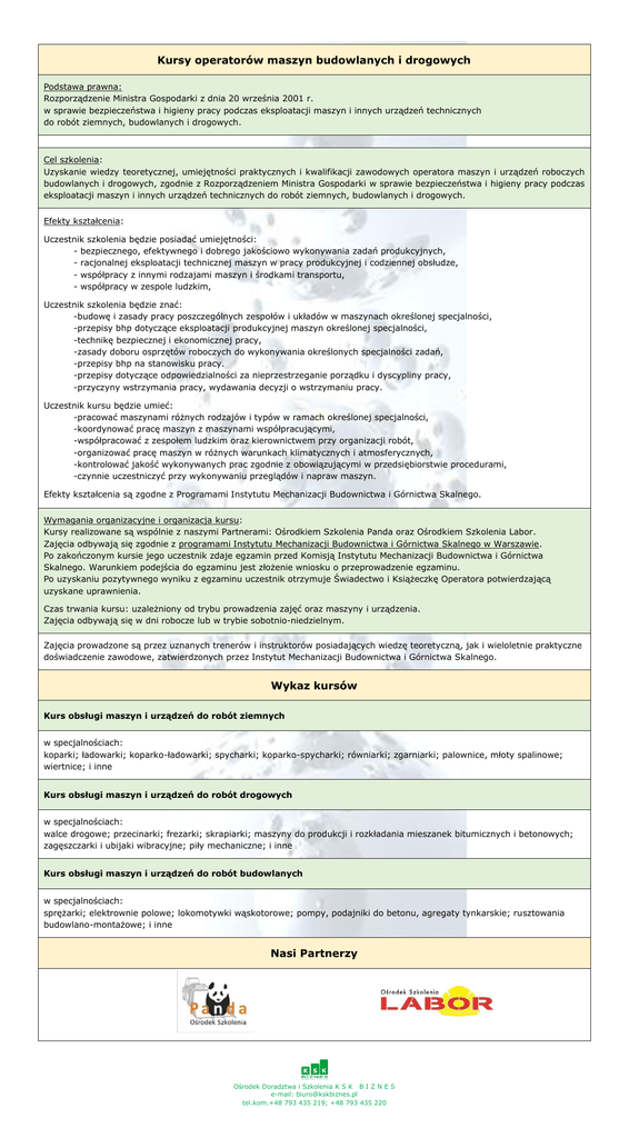 Kursy operatorów maszyn budowlanych i drogowych Podstawa prawna: Rozporządzenie Ministra Gospodarki z dnia 20 września 2001 r. w sprawie bezpieczeństwa i higieny pracy podczas eksploatacji maszyn i innych urządzeń technicznych do robót ziemnych, budowlanych i drogowych. Przepisy branżowe: Cel szkolenia: Uzyskanie wiedzy teoretycznej, umiejętności praktycznych i kwalifikacji zawodowych operatora maszyn i urządzeń roboczych budowlanych i drogowych, zgodnie z Rozporządzeniem Ministra Gospodarki w sprawie bezpieczeństwa i higieny pracy podczas eksploatacji maszyn i innych urządzeń technicznych do robót ziemnych, budowlanych i drogowych. Efekty kształcenia: Uczestnik szkolenia będzie posiadać umiejętności: - bezpiecznego, efektywnego i dobrego jakościowo wykonywania zadań produkcyjnych, - racjonalnej eksploatacji technicznej maszyn w pracy produkcyjnej i codziennej obsłudze, - współpracy z innymi rodzajami maszyn i środkami transportu, - współpracy w zespole ludzkim, Uczestnik szkolenia będzie znać: -budowę i zasady pracy poszczególnych zespołów i układów w maszynach określonej specjalności, -przepisy bhp dotyczące eksploatacji produkcyjnej maszyn określonej specjalności, -technikę bezpiecznej i ekonomicznej pracy, -zasady doboru osprzętów roboczych do wykonywania określonych specjalności zadań, -przepisy bhp na stanowisku pracy. -przepisy dotyczące odpowiedzialności za nieprzestrzeganie porządku i dyscypliny pracy, -przyczyny wstrzymania pracy, wydawania decyzji o wstrzymaniu pracy. Uczestnik kursu będzie umieć: -pracować maszynami różnych rodzajów i typów w ramach określonej specjalności, -koordynować pracę maszyn z maszynami współpracującymi, -współpracować z zespołem ludzkim oraz kierownictwem przy organizacji robót, -organizować pracę maszyn w różnych warunkach klimatycznych i atmosferycznych, -kontrolować jakość wykonywanych prac zgodnie z obowiązującymi w przedsiębiorstwie procedurami, -czynnie uczestniczyć przy wykonywaniu przeglądów i napraw maszyn. Efekty kształcenia są zgodne z Programami Instytutu Mechanizacji Budownictwa i Górnictwa Skalnego. Wymagania organizacyjne i organizacja kursu: Kursy realizowane są wspólnie z naszymi Partnerami: Ośrodkiem Szkolenia Panda oraz Ośrodkiem Szkolenia Labor. Zajęcia odbywają się zgodnie z programami Instytutu Mechanizacji Budownictwa i Górnictwa Skalnego w Warszawie. Po zakończonym kursie jego uczestnik zdaje egzamin przed Komisją Instytutu Mechanizacji Budownictwa i Górnictwa Skalnego. Warunkiem podejścia do egzaminu jest złożenie wniosku o przeprowadzenie egzaminu. Po uzyskaniu pozytywnego wyniku z egzaminu uczestnik otrzymuje Świadectwo i Książeczkę Operatora potwierdzającą uzyskane uprawnienia. Czas trwania kursu: uzależniony od trybu prowadzenia zajęć oraz maszyny i urządzenia. Zajęcia odbywają się w dni robocze lub w trybie sobotnio-niedzielnym. Zajęcia prowadzone są przez uznanych trenerów i instruktorów posiadających wiedzę teoretyczną, jak i wieloletnie praktyczne doświadczenie zawodowe, zatwierdzonych przez Instytut Mechanizacji Budownictwa i Górnictwa Skalnego. Wykaz kursów Kurs obsługi maszyn i urządzeń do robót ziemnych w specjalnościach: koparki; ładowarki; koparko-ładowarki; spycharki; koparko-spycharki; równiarki; zgarniarki; palownice, młoty spalinowe; wiertnice; i inne Kurs obsługi maszyn i urządzeń do robót drogowych w specjalnościach: walce drogowe; przecinarki; frezarki; skrapiarki; maszyny do produkcji i rozkładania mieszanek bitumicznych i betonowych; zagęszczarki i ubijaki wibracyjne; piły mechaniczne; i inne Kurs obsługi maszyn i urządzeń do robót budowlanych w specjalnościach: sprężarki; elektrownie polowe; lokomotywki wąskotorowe; pompy, podajniki do betonu, agregaty tynkarskie; rusztowania budowlano-montażowe; i inne Nasi Partnerzy Ośrodek Doradztwa i Szkolenia K S K B I Z N E S e-mail: [email protected] tel.kom.+48 793 435 219; +48 793 435 220
