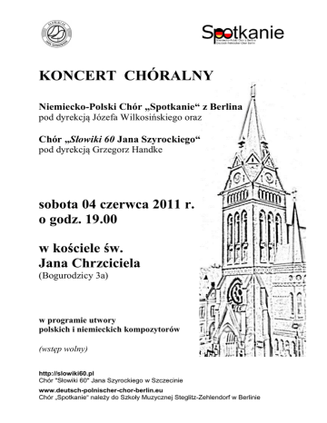 KONCERT CHÓRALNY Niemiecko-Polski Chór „Spotkanie“ z Berlina pod dyrekcją Józefa Wilkosińskiego oraz Chór „Słowiki 60 Jana Szyrockiego“ pod dyrekcją Grzegorz Handke sobota 04 czerwca 2011 r. o godz. 19.00 w kościele św. Jana Chrzciciela (Bogurodzicy 3a) w programie utwory polskich i niemieckich kompozytorów (wstęp wolny) http://slowiki60.pl Chór "Słowiki 60" Jana Szyrockiego w Szczecinie www.deutsch-polnischer-chor-berlin.eu Chór „Spotkanie“ należy do Szkoły Muzycznej Steglitz-Zehlendorf w Berlinie