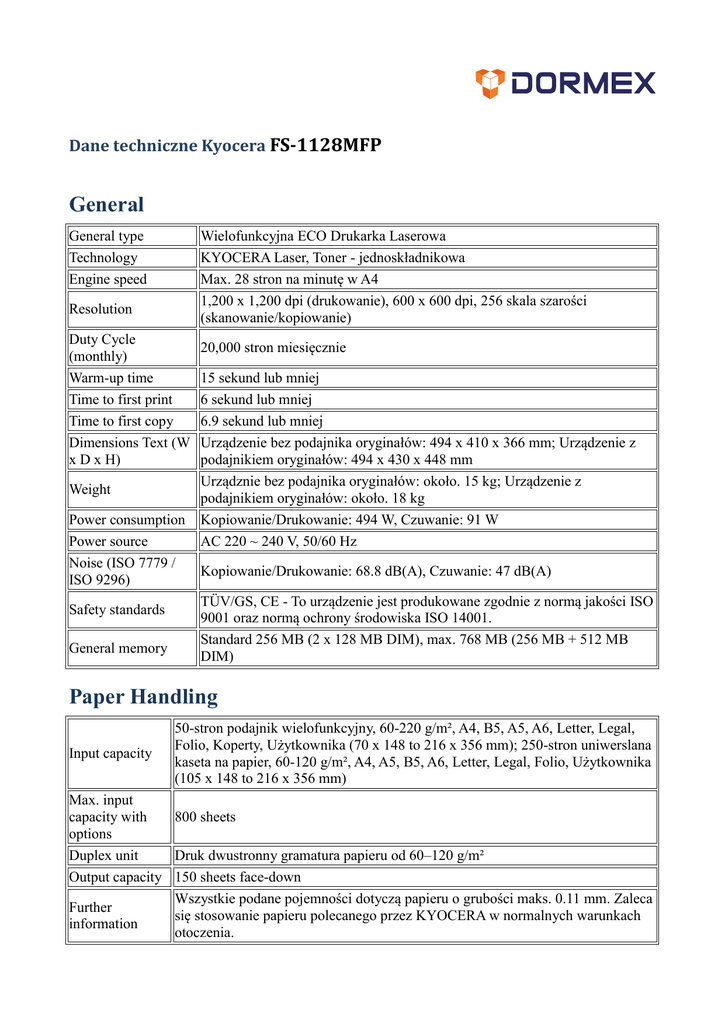 Dane techniczne Kyocera FS-1128MFP General General type Technology Engine speed Wielofunkcyjna ECO Drukarka Laserowa KYOCERA Laser, Toner - jednoskładnikowa Max. 28 stron na minutę w A4 1,200 x 1,200 dpi (drukowanie), 600 x 600 dpi, 256 skala szarości (skanowanie/kopiowanie) Resolution Duty Cycle (monthly) Warm-up time Time to first print Time to first copy Dimensions Text (W x D x H) Weight Power consumption Power source Noise (ISO 7779 / ISO 9296) Safety standards General memory 20,000 stron miesięcznie 15 sekund lub mniej 6 sekund lub mniej 6.9 sekund lub mniej Urządzenie bez podajnika oryginałów: 494 x 410 x 366 mm; Urządzenie z podajnikiem oryginałów: 494 x 430 x 448 mm Urządznie bez podajnika oryginałów: około. 15 kg; Urządzenie z podajnikiem oryginałów: około. 18 kg Kopiowanie/Drukowanie: 494 W, Czuwanie: 91 W AC 220 ~ 240 V, 50/60 Hz Kopiowanie/Drukowanie: 68.8 dB(A), Czuwanie: 47 dB(A) TÜV/GS, CE - To urządzenie jest produkowane zgodnie z normą jakości ISO 9001 oraz normą ochrony środowiska ISO 14001. Standard 256 MB (2 x 128 MB DIM), max. 768 MB (256 MB + 512 MB DIM) Paper Handling Input capacity 50-stron podajnik wielofunkcyjny, 60-220 g/m², A4, B5, A5, A6, Letter, Legal, Folio, Koperty, Użytkownika (70 x 148 to 216 x 356 mm); 250-stron uniwerslana kaseta na papier, 60-120 g/m², A4, A5, B5, A6, Letter, Legal, Folio, Użytkownika (105 x 148 to 216 x 356 mm) Max. input capacity with 800 sheets options Duplex unit Druk dwustronny gramatura papieru od 60–120 g/m² Output capacity 150 sheets face-down Wszystkie podane pojemności dotyczą papieru o grubości maks. 0.11 mm. Zaleca Further się stosowanie papieru polecanego przez KYOCERA w normalnych warunkach information otoczenia. Print Processor Controller language Emulations Fonts Integrated Accounting PowerPC 440 / 667 MHz PRESCRIBE IIe PCL 6, PCL 5e, Postscript® 3™ ( KPDL3), Lineprinter, IBM Proprinter X24, EPSON LQ 850, DIABLO630, PRESCRIBE®, PDF Direct print, XPS Direct print 93 czcionki konturowe PCL6(zgodne z HP) + 8 czcionek Windows Vista, 101 czcionek (KPDL3), 1 czcionka bitmapowa, 45 typów jednowymiarowych i 1 dwuwymiarowy kod kreskowy (PDF-417) 20 department codes Drukowanie bezpośrednio PDF-ów, Bezpieczne Drukowanie poprzez Internet SIPP Print features ,Drukowanie poprzez e-mail, Tryb oszczędności Toneru, Funkcje wygładzające, ECO pamięć, Drukowanie przez internet IPP 1.0 Applicable OS Wszystkie bieżące systemy operacyjne Windows, Mac OS X Version 10.2 lub (Print) wyższe, UNIX LINUX , i inne systemy operacyjne na żadanie. Copy Max. original size A4 / Letter Raz zeskanowane wielokrotnie wydrukowane, Rezerwacja zadania, Priorytet wydruku, Program (8), Rozdzielone kopiowanie, 1-do-wielu-kopii, Kontynuacja Copy features skanowania, do -n kopii, Tryb oszczędności Toneru, Elektroniczne sortowanie, Automatyczna zmiana kaset, Auto kopiowanie dwustronne, Kontrola intesywności kopii Exposure modes Auto, Ręczny: 7 stopni Preset magnification 7R/5E ratios Zoom range 25 - 400 % w 1% krokach Continuous 1 - 999 copy Image Text + Photo, Text, Photo adjustments Scan Scan features Compression format Original recognition Max. scan size Scan functionalities 10/100Base-TX, USB 2.0 (tylko TWAIN) MMR/JPEG Text, Photo, Text + Photo OCR A4 / Letter Scan-to-email, Scan-to-FTP (FTP via SSL), Scan-to-SMB FTP, Scan-to-USB, BOX TWAIN, WSD 200, 300, 400, 600 (256 skala szarości) 35 ipm (300 dpi, A4, B/W); 14 ipm (300 dpi, A4, kolor) Scan resolution Scan speed Fax Compatibility Modem speed Scanning speed Transmission speed ITU-T Super G3 Max. 33.6 kbps 2.5 seconds 3 sekundy lub mniej (JBIG) Normal: 8 dot/mm x 3.85 line/mm, Fine: 8 dot/mm x 7.7 line/mm, Superfine: 8 Scanning density dot/mm x 15.4 line/mm, Ultrafine: 16 dot/mm x 15.4 line/mm (with optional memory) Max. original A4 / Letter size Compression JBIG, MMR, MR, MH method Sieciowe faxowanie, Dwustronny odbiór faxów, Poufny, Zdalne wywołanie i Fax features odbiór (Polling), Broadcast (rozsyłanie), Skrzynki dokumentów, Zdalna diagnostyka Interfaces Standard interfaces USB 2.0 (Hi-Speed), Fast FastEthernet (10/100BaseTX, SNMPv3, SSL, IPsec, IPv6, IEEE802.1x), złacze KUIO/W (tylko FS-1028MFP)