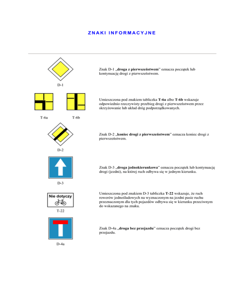 ZNAKI INFORMACYJNE Znak D-1 „droga z pierwszeństwem” oznacza początek lub kontynuację drogi z pierwszeństwem. D-1 Umieszczona pod znakiem tabliczka T-6a albo T-6b wskazuje odpowiednio rzeczywisty przebieg drogi z pierwszeństwem przez skrzyżowanie lub układ dróg podporządkowanych. T-6a T-6b Znak D-2 „koniec drogi z pierwszeństwem” oznacza koniec drogi z pierwszeństwem. D-2 Znak D-3 „droga jednokierunkowa” oznacza początek lub kontynuację drogi (jezdni), na której ruch odbywa się w jednym kierunku. D-3 Umieszczona pod znakiem D-3 tabliczka T-22 wskazuje, że ruch rowerów jednośladowych na wyznaczonym na jezdni pasie ruchu przeznaczonym dla tych pojazdów odbywa się w kierunku przeciwnym do wskazanego na znaku. T-22 Znak D-4a „droga bez przejazdu” oznacza początek drogi bez przejazdu. D-4a Znak D-4b „wjazd na drogę bez przejazdu” oznacza, że droga za skrzyżowaniem po stronie wskazanej na znaku jest drogą bez przejazdu. D-4b Znak D-5 „pierwszeństwo na zwężonym odcinku jezdni” oznacza, że kierujący przejeżdżają (przechodzą) przed kierującymi zbliżającymi się z kierunku przeciwnego. D-5 Znak D-6 „przejście dla pieszych” oznacza miejsce przeznaczone do przechodzenia pieszych w poprzek drogi. D-6 Znak D-6a „przejazd dla rowerzystów” oznacza miejsce przeznaczone do przejeżdżania rowerzystów w poprzek drogi. D-6a Znak D-6b „przejście dla pieszych i przejazd dla rowerzystów” oznacza występujące obok siebie miejsca wskazane znakami D-6 i D-6a. D-6b Kierujący pojazdem zbliżający się do miejsca oznaczonego znakiem D-6, D-6a albo D-6b jest obowiązany zmniejszyć prędkość tak, aby nie narazić na niebezpieczeństwo pieszych lub rowerzystów znajdujących się w tych miejscach lub na nie wchodzących (wjeżdżających). Umieszczona pod znakiem D-6 lub D-6b tabliczka T-27 wskazuje, że przejście dla pieszych jest szczególnie uczęszczane przez dzieci. T-27 Znak D-7 „droga ekspresowa” oznacza początek lub kontynuację drogi ekspresowej; koniec drogi ekspresowej oznaczony jest znakiem D-8 „koniec drogi ekspresowej”. D-7 D-8 Znak D-9 „autostrada” oznacza początek lub kontynuację autostrady; koniec autostrady oznaczony jest znakiem D-10 „koniec autostrady”. D-9 D-10 Umieszczona pod znakiem D-7 lub D-9 tabliczka T-28 wskazuje, że za przejazd drogą ekspresową lub autostradą pobierana jest opłata. T-28 Znaki: D-11 „początek pasa ruchu dla autobusów”, D-12 „pas ruchu dla autobusów” oznaczają odpowiednio początek lub kontynuację pasa ruchu przeznaczonego tylko dla autobusów (trolejbusów) oraz innych pojazdów wykonujących odpłatny przewóz osób na regularnych liniach. D-11 D-12 Znak D-13 „początek pasa ruchu powolnego” oznacza początek pasa ruchu, z którego są obowiązani korzystać kierujący pojazdami nie osiągającymi na wzniesieniu minimalnej prędkości określonej na znaku liczbą kilometrów na godzinę. D-13 Znak D-14 „koniec pasa ruchu” oznacza koniec skrajnego pasa ruchu, znajdującego się po stronie wskazanej na znaku; znak D-14 umieszczony przy pasie ruchu powolnego oznacza koniec tego pasa ruchu. D-14 T-1a Umieszczona pod znakiem D-7, D-8, D-9, D-10, D-13 lub D-14 tabliczka T-1a wskazuje odległość do początku (końca) drogi lub pasa ruchu. Znaki: D-15 „przystanek autobusowy”, D-16 „przystanek trolejbusowy”, D-17 „przystanek tramwajowy” D-15 D-16 D-17 oznaczają miejsce zatrzymywania się wskazanych na znaku pojazdów wykonujących odpłatny przewóz osób na regularnych liniach. Znak D-15 oznacza ponadto miejsce do zatrzymywania się innych niż autobus pojazdów samochodowych wykonujących odpłatny przewóz osób na regularnych liniach i pojazdów przeznaczonych do przewozu dzieci do szkół i przedszkoli. Znak D-18 „parking” oznacza miejsce przeznaczone na postój pojazdów (zespołów pojazdów), z wyjątkiem przyczep kempingowych. D-18 Umieszczona pod znakiem D-18 tabliczka: T-23e T-30 T-23e oznacza, że na parkingu dopuszczony jest także postój przyczep kempingowych, T-30 wskazuje sposób ustawienia pojazdu względem krawędzi jezdni oznaczonej na tabliczce barwą szarą oraz że miejsce przeznaczone jest dla pojazdów samochodowych o dopuszczalnej masie całkowitej nie przekraczającej 2,5 t, T-3a wskazuje koniec miejsca przeznaczonego na postój. T-3a Znak D-18a „parking - miejsce zastrzeżone” oznacza miejsce przeznaczone na postój pojazdu uprawnionej osoby. D-18a Znak D-18b „parking zadaszony” oznacza miejsce przeznaczone do postoju pojazdów znajdujące się w budynku lub pod wiatą. D-18b T-29 Umieszczona pod znakiem D-18 lub D-18b tabliczka T-29 informuje o miejscach przeznaczonych dla pojazdów przewożących lub kierowanych przez osoby niepełnosprawne mające trudności w poruszaniu się. Znak D-19 „postój taksówek” oznacza miejsce przeznaczone na postój taksówek, z wyjątkiem taksówek zajętych. D-19 Znak D-20 „koniec postoju taksówek” oznacza miejsce, w którym kończy się postój taksówek; jeżeli na postoju taksówek nie umieszczono znaku D-20, to kończy się on w odległości nie większej niż 20 m przed znakiem D-19. D-20 Umieszczony dodatkowo na znakach D-19 i D-20 napis „Bagażowe” wskazuje, że znaki te dotyczą taksówek bagażowych. Znaki informujące o wskazanych na znakach obiektach znajdujących się przy drodze D-21 „szpital”, D-21a „policja”, D-22 „punkt opatrunkowy”, D-23 „stacja paliwowa”, (umieszczony w dolnej części znaku napis "LPG GAZ" informuje, że stacja prowadzi także sprzedaż gazu do napędu pojazdów) D-23a „stacja paliwowa tylko z gazem do napędu pojazdów”, D-24 „telefon”, D-25 „poczta”, D-26 „stacja obsługi technicznej”, D-26a „wulkanizacja”, D-26b „myjnia”, D-26c „toaleta publiczna”, (umieszczony w dolnej części znaku napis "BUS" informuje o możliwości opróżniania toalet zainstalowanych w pojazdach) D-