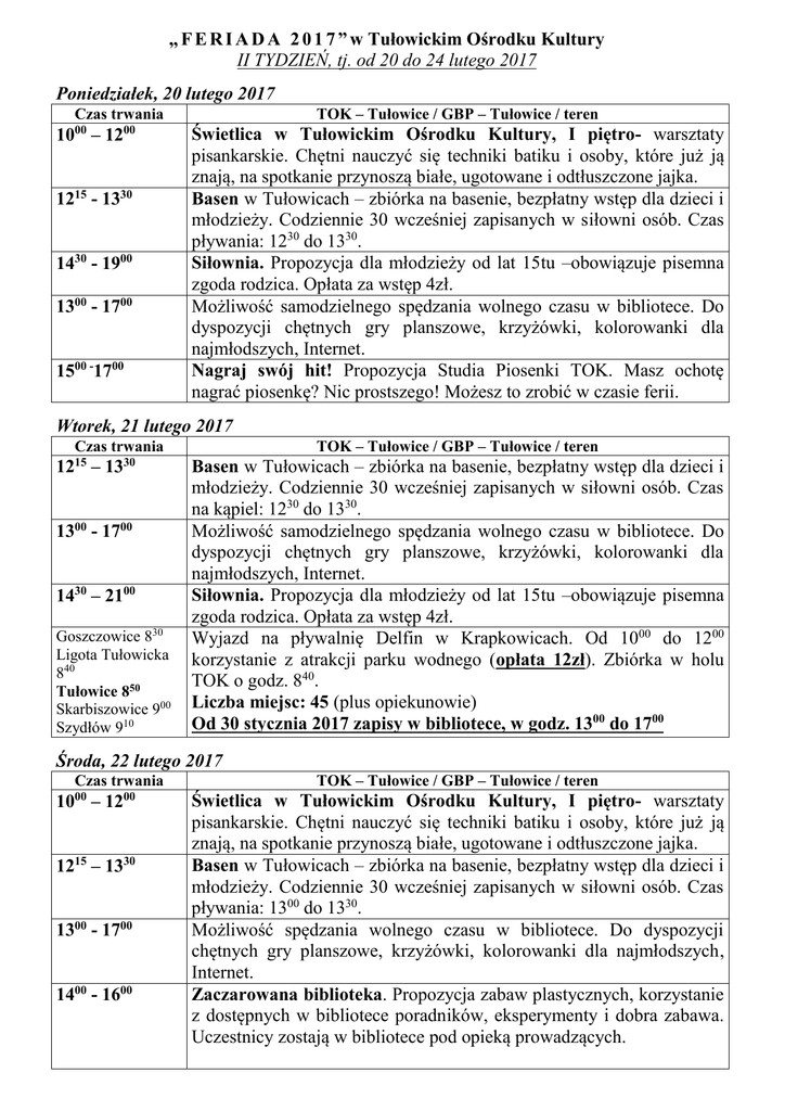 „ F E R I A D A 2 0 1 7 ” w Tułowickim Ośrodku Kultury II TYDZIEŃ, tj. od 20 do 24 lutego 2017 Poniedziałek, 20 lutego 2017 TOK – Tułowice / GBP – Tułowice / teren Czas trwania 10 – 12 00 00 1215 - 1330 1430 - 1900 1300 - 1700 1500 -1700 Świetlica w Tułowickim Ośrodku Kultury, I piętro- warsztaty pisankarskie. Chętni nauczyć się techniki batiku i osoby, które już ją znają, na spotkanie przynoszą białe, ugotowane i odtłuszczone jajka. Basen w Tułowicach – zbiórka na basenie, bezpłatny wstęp dla dzieci i młodzieży. Codziennie 30 wcześniej zapisanych w siłowni osób. Czas pływania: 1230 do 1330. Siłownia. Propozycja dla młodzieży od lat 15tu –obowiązuje pisemna zgoda rodzica. Opłata za wstęp 4zł. Możliwość samodzielnego spędzania wolnego czasu w bibliotece. Do dyspozycji chętnych gry planszowe, krzyżówki, kolorowanki dla najmłodszych, Internet. Nagraj swój hit! Propozycja Studia Piosenki TOK. Masz ochotę nagrać piosenkę? Nic prostszego! Możesz to zrobić w czasie ferii. Wtorek, 21 lutego 2017 TOK – Tułowice / GBP – Tułowice / teren Czas trwania 12 – 13 15 30 1300 - 1700 1430 – 2100 Goszczowice 830 Ligota Tułowicka 840 Tułowice 850 Skarbiszowice 900 Szydłów 910 Basen w Tułowicach – zbiórka na basenie, bezpłatny wstęp dla dzieci i młodzieży. Codziennie 30 wcześniej zapisanych w siłowni osób. Czas na kąpiel: 1230 do 1330. Możliwość samodzielnego spędzania wolnego czasu w bibliotece. Do dyspozycji chętnych gry planszowe, krzyżówki, kolorowanki dla najmłodszych, Internet. Siłownia. Propozycja dla młodzieży od lat 15tu –obowiązuje pisemna zgoda rodzica. Opłata za wstęp 4zł. Wyjazd na pływalnię Delfin w Krapkowicach. Od 1000 do 1200 korzystanie z atrakcji parku wodnego (opłata 12zł). Zbiórka w holu TOK o godz. 840. Liczba miejsc: 45 (plus opiekunowie) Od 30 stycznia 2017 zapisy w bibliotece, w godz. 1300 do 1700 Środa, 22 lutego 2017 Czas trwania 10 – 12 00 00 1215 – 1330 1300 - 1700 1400 - 1600 TOK – Tułowice / GBP – Tułowice / teren Świetlica w Tułowickim Ośrodku Kultury, I piętro- warsztaty pisankarskie. Chętni nauczyć się techniki batiku i osoby, które już ją znają, na spotkanie przynoszą białe, ugotowane i odtłuszczone jajka. Basen w Tułowicach – zbiórka na basenie, bezpłatny wstęp dla dzieci i młodzieży. Codziennie 30 wcześniej zapisanych w siłowni osób. Czas pływania: 1300 do 1330. Możliwość spędzania wolnego czasu w bibliotece. Do dyspozycji chętnych gry planszowe, krzyżówki, kolorowanki dla najmłodszych, Internet. Zaczarowana biblioteka. Propozycja zabaw plastycznych, korzystanie z dostępnych w bibliotece poradników, eksperymenty i dobra zabawa. Uczestnicy zostają w bibliotece pod opieką prowadzących. 1430 - 1900 Siłownia. Propozycja dla młodzieży od lat 15tu –obowiązuje pisemna zgoda rodzica. Opłata za wstęp 4zł. Czwartek, 23 lutego 2017 TOK – Tułowice / GBP – Tułowice / teren Czas trwania 30 00 14 - 20 1215 - 1330 Goszczowice 940, Ligota Tułowicka 950, Tułowice 1000, Skarbiszowice 1010, Szydłów 1015 1300 - 1700 Siłownia. Propozycja dla młodzieży od lat 15tu –obowiązuje pisemna zgoda rodzica. Opłata za wstęp 4zł. Basen w Tułowicach – zbiórka na basenie, bezpłatny wstęp dla dzieci i młodzieży. Codziennie 30 wcześniej zapisanych w siłowni osób. Czas pływania: 1230 do 1330. Wyjazd do sali zabaw „Polanka” i na Rollkowisko do Opola. Najmłodsi będą bawili się w sali zabaw, starsi chętni do jazdy na rolkach, na Rolkowisku. Wyjazd do sali zabaw „Polanka”. Korzystanie z atrakcji od 1100 do 1230, bilet 15zł. Liczba miejsc: 20 (plus 2 opiekunów). Godzinna jazda na rolkach (1130-1230) na Rollkowisku w Opolu, domEXPO ul. Kępska. Liczba miejsc: 25 (plus 2 opiekunów) Bilet 4zł, wypożyczenie rolek 5zł/godzinę. Zapisy: Od 30 stycznia 2017 zapisy w bibliotece, w godz. 1300 do 1700 Możliwość samodzielnego spędzania wolnego czasu w bibliotece. Do dyspozycji chętnych gry planszowe, krzyżówki, kolorowanki dla najmłodszych, Internet. Piątek, 24 lutego 2017 Czas trwania 1215 – 1330 1430-1900 1300 - 1700 1200 - 1500 TOK – Tułowice / GBP – Tułowice / teren Basen w Tułowicach – zbiórka na basenie, bezpłatny wstęp dla dzieci i młodzieży. Codziennie 30 wcześniej zapisanych w siłowni osób. Czas pływania: 1230 do 1330. Siłownia. Propozycja dla młodzieży od lat 15tu –obowiązuje pisemna zgoda rodzica. Opłata za wstęp 4zł. Możliwość samodzielnego spędzania wolnego czasu w bibliotece. Do dyspozycji chętnych gry planszowe, krzyżówki, kolorowanki dla najmłodszych, Internet. Zakończenie „Feriady”. Zabawa na orientację w terenie – Jak dobrze znasz zabytki Tułowic? Po powrocie ognisko z pieczeniem kiełbasek, gorąca herbata. W razie niepogody zajęcia na terenie ośrodka. W przypadku nie korzystania z wyjazdu, pieniądze będą zwracane (Państwa wpłaty to depozyt na opłaty wejściówek). Wolne miejsce na liście wycieczki osoba rezygnująca może zaproponować innej. Zmianę taką należy zgłosić w celu przygotowania oświadczenia – zgody rodzica na udział i uaktualnienia listy osobowej wycieczki. Kierowca zabierając dzieci z poszczególnych miejscowości, odjeżdża z miejsca zbiórki o określonej w planie ferii godzinie. Tułowicki Ośrodek Kultury, ul. Świerczewskiego 8 Tel.: 77 4600672, wew. 22 – Dyrektor Helena Wojtasik, wew. 24 – Anna Rup, 25-Dorota Olszewska.