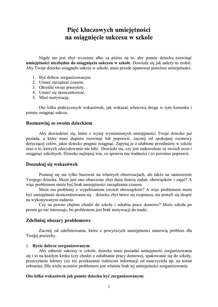 Pięć kluczowych umiejętności na osiągnięcie sukcesu w szkole Nigdy nie jest zbyt wcześnie albo za późno na to, aby pomóc dziecku rozwinąć umiejętności niezbędne do osiągnięcia sukcesu w szkole. Dowiedz się jak należy to zrobić. Aby Twoje dziecko osiągnęło sukces w szkole, musi przede opanować poniższe umiejętności. 1. 2. 3. 4. 5. Być dobrze zorganizowanym. Umieć zarządzać czasem. Określić swoje priorytety. Umieć się skoncentrować. Mieć motywację. Oto kilka praktycznych wskazówek, jak wskazać właściwą drogę w tym kierunku i pomóc osiągnąć sukces. Rozmawiaj ze swoim dzieckiem Aby dowiedzieć się, które z wyżej wymienionych umiejętności Twoje dziecko już posiada, a które musi dopiero rozwinąć lub poprawić, zacznij od spokojnej rozmowy dotyczącej celów, jakie dziecko pragnie osiągnąć. Zapytaj je o ulubione przedmioty w szkole oraz o te, których zdecydowanie nie lubi. Dowiedz się, czy jest zadowolone ze swoich ocen i osiągnięć szkolnych. Dziecko najlepiej wie, co sprawia mu trudności i co powinno poprawić. Doszukuj się wskazówek Postaraj się nie tylko bazować na własnych obserwacjach, ale także na samoocenie Twojego dziecka. Może jest ono obarczone zbyt dużą ilością zadań, obowiązków i zajęć? A więc problemem może być brak umiejętności zarządzania czasem. Może ma problemy z wypełnianiem swoich obowiązków? A więc problemem może być umiejętność skoncentrowania się – dziecko zbyt łatwo się rozprasza, nie potrafi się skupić na wykonywanym zadaniu. Czy na pewno chętnie chodzi do szkoły i odrabia prace domowe? Może szkoła po prostu go nie interesuje, bo problemem jest brak motywacji do nauki. Zdefiniuj obszary problemowe Zacznij od zdefiniowania, które z powyższych umiejętności stanowią problem dla Twojej pociechy. 1. Bycie dobrze zorganizowanym Aby odnosić sukcesy w szkole, dziecko musi posiadać umiejętność zorganizowania się i to na każdym kroku (czy chodzi o odrabianie pracy domowej, spakowanie się do szkoły, przeczytanie lektury czy też przekazanie rodzicom informacji od nauczyciela np. na temat zebrania). Dla wielu uczniów problemem jest właśnie brak tej umiejętności zorganizowania. Oto kilka wskazówek jak pomóc dziecku być zorganizowanym: 1 Sporządź listę rzeczy, które Twoje dziecko musi codziennie spakować do szkoły oraz z niej zabrać. Przyklej jedną kopię na drzwiach wyjściowych w domu, a drugą umieść w plecaku dziecka. Postaraj się sprawdzać wraz z dzieckiem każdego dnia, czy pamięta co znajduje się na liście. Sprawdź, jak i kiedy dziecko odrabia pracę domową i czy ma porządek w zeszytach. Usiądźcie i razem postarajcie się wypracować system w tym zakresie, z którego dziecko będzie chciało korzystać. Np. ustalcie najlepszą porę odrabiania lekcji. Poszukaj razem z dzieckiem prostych narzędzi przydatnych w dobrej organizacji pracy – takich jak okładki, zakładki, karteczki samoprzylepne, teczki, skoroszyty, markery itp. 2. Zarządzanie czasem Wielu uczniów ma problemy z takim zorganizowaniem czasu, aby zdążyć spokojnie wykonać swoje zadania i obowiązki. Powszechna jest wśród uczniów praktyka odkładania obowiązków na ostatnią chwilę. Chyba każdy z nas zna ten problem. Czy będąc jeszcze uczniami nie odkładaliście napisania wypracowania na ostatni dzień nawet jeśli praca była zadana tydzień wcześniej? Nauczenie się zarządzania czasem w taki sposób aby podzielić go na odpowiednie „bloki produkcyjne”, wymaga praktyki i doświadczenia. Ważna jest też systematyczność. Oto kilka wskazówek które powinny pomóc Twojemu dziecku zarządzać czasem: Zobacz, jakie zadania i prace ma dziecko do wykonania w ciągu najbliższego miesiąca oraz jakie czekają go w tym czasie sprawdziany i testy. Rozpisz plan wykonania tych obowiązków zaczynając od daty zakończenia najbardziej czasochłonnych zadań lub daty sprawdzianu. Pamiętaj, aby zadania podzielić na mniejsze partie (np. zadania do wykonania każdego dnia) i planować od daty końcowej wstecz. Co to oznacza - jeśli np. w połowie miesiąca Twoje dziecko czeka jakiś duży sprawdzian, podziel materiał jaki musi powtórzyć na mniejsze partie i rozpisz na poszczególne dni. Zostaw np. dwa ostatnie dni na powtórzenie całego materiału. Uczeń zachęcony do systematyczności sam szybko zauważy, że przyswajanie wiedzy stopniowo i małymi partiami zajmuje stosunkowo niewiele czasu i nie wymaga zbyt dużego wysiłku. Zaobserwuj ile czasu dziecko poświęca w każdym tygodniu na wykonywanie zadawanych do domu lekcji, a następnie pomóż mu opracować plan odrabiania lekcji tak aby nie były one dla niego dużym obciążeniem (np. jeśli dziecko ma we wtorki więcej czasu na odrabianie lekcji może poświęcić go na odrobienie również lekcji które są zadane dopiero na czwartek lub piątek). Razem z dzieckiem określ najlepszą porę w ciągu dnia na odrabianie lekcji i pomóż mu trzymać się wyznaczonego planu. Jeśli wyznaczony czas odrabiania lekcji okaże się niewystarczający , pomóż dziecku wygospodarować dodatkowy czas w ciągu dnia – być może będzie musiało pouczyć się więcej rano albo w ciągu weekendu. 3. Określenie priorytetów Czasami powodem niepowodzeń w szkole jest to, że dziecko nie wie, na czym powinno się skoncentrować i w jaki sposób zabrać się do pracy. Umiejętność określania 2 swoich priorytetów dotyczy w zasadzie każdej dziedziny życia, nie tylko szkoły, więc jest przydatna na co dzień i nigdy nie jest zbyt późno aby zastanowić się co jest dla nas najważniejsze. Oto kilka rad jak pomóc dziecku określać priorytety: Poproś, aby dziecko wypisało na kartce wszystkie rzeczy jakie ma do zrobienia włączając w to również zadania nie związane ze szkołą. Następnie poproś, aby nadało każdemu zadaniu stopień w skali od 1 do 3 przy czym 1 oznacza zadania najważniejsze. Porozma