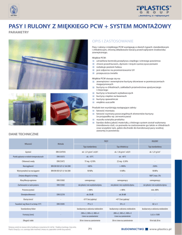 PASY I RULONY Z MIĘKKIEGO PCW + SYSTEM MONTAŻOWY PARAMETRY OPIS I ZASTOSOWANIE Pasy i rulony z miękkiego PCW występują w dwóch typach: standardowym i chłodniczym, chronią składowane towary przed wpływem środowiska zewnętrznego. Miękkie PCW: umożliwia kontrolę przepływu ciepłego i zimnego powietrza chroni przed kurzem, dymem i innymi zanieczyszczeniami redukuje poziom hałasu jest odporne na promieniowanie UV przepuszcza światło Miękkie PCW stosuje się na: zewnętrzne i wewnętrzne kurtyny drzwiowe w pomieszczeniach magazynowych kurtyny w chłodniach, zakładach przetwórstwa spożywczego i mięsnego kurtyny w bramach wyładowczych kurtyny cieplne na basenach kurtyny spawalnicze miękkie uszczelki Produkt ten wyróżniają następujące zalety: łatwość montażu łatwość wymiany poszczególnych elementów kurtyny (w przypadku np. zerwania pasa) wysoka estetyka produktu bardzo dobra jakość materiału, z którego system został wykonany (nierdzewna stal), co pozwala na zastosowanie go także w chłodniach oraz wszędzie tam, gdzie dochodzi do kondensacji pary wodnej zawartej w powietrzu DANE TECHNICZNE PASY Własność RULONY Metoda Typ standardowy Typ chłodniczy Typ standardowy Gęstość DIN 53479/A ok. 1,21 g/cm3 ±0,01 ok. 1,16 g/cm3 ±0,01 ok. 1,21 g/cm3 Punkt pękania w niskich temperaturach DIN 53372 ok. -35°C ok. -45°C - Chłonność wody DIN 53472 17 mg - 0,10% 22 mg - 0,10% - Rozciągliwość DIN EN ISO 527-2/ 5A/200 420% > 490% 250% Wytrzymałość na rozciąganie DIN EN ISO 527-2/ 5A/200 18 MPa 14 MPa 18 MPa Zmiana długości w temp. - - - 100°C max. 5% Klasyfikacja ogniowa DIN 53382 samogasnący samogasnący samogasnący Zachowanie w razie pożaru DIN 53382 nie płonie i nie wydziela dymu nie płonie i nie wydziela dymu nie płonie i nie wydziela dymu Przezroczystość - > 80% > 80% min. 80% Dźwiękochłonność DIN 52210 ok.30 dB ok.30 dB - Elastyczność - -35°C bez pęknięć -45°C bez pęknięć - Twardość wg Shore A w temp 15°C DIN 53505 79 ± 3 59 ± 3 82 ± 3 Standardowy Kolor - bezbarwny o odcieniu niebieskim bezbarwny o odcieniu niebieskim bezbarwny o odcieniu niebieskim Formaty [mm] - 200 x 2, 300 x 3, 400 x 4 i inne na zamówienie 200 x 2, 300 x 3, 400 x 4 i inne na zamówienie 3,4,5 x 1500 Długość rolek - 50 m i inne na zamówienie 50 m i inne na zamówienie 10 m lub 20 m Niniejszy cennik nie stanowi oferty handlowej w rozumieniu Art. 66 Par. 1 Kodeksu Cywilnego. Ceny netto. Plastics Group Sp. z o.o. zastrzega sobie możliwość zmiany cen, poprzednie cenniki tracą ważność. 71 BUDOWNICTWO www.plastics.pl PASY I RULONY Z MIĘKKIEGO PCW CENNIK PASY Z MIĘKKIEGO PCW Typ S (Standard) - zalecana temperatura pracy od -5°C do + 60°C Typ C (Chłodniczy) - zalecana temperatura pracy od -25°C do + 40°C Kolor standardowy: bezbarwny, bezbarwny o odcieniu niebieskim Długość pasa: 50 mb Dostępność magazynowa: Cena Grubość Szerokość [mm] [mm] 2 200 3 300 4 400 70,40 1 Typ C (Chłodniczy)2 Typ S (Standard) [PLN/m2] [PLN/mb] [PLN/m2] 35,20 7,00 40,50 8,10 52,80 15,80 60,70 18,20 28,20 81,00 32,40 [PLN/mb] 1) Punkt pękania -35°C 2) Punkt pękania -45°C Kolory na zamówienie: +15% Na zamówienie za ewentualną dopłatą dostępne są również inne wymiary oraz materiały o specjalnych właściwościach, np.: - na kurtyny spawalnicze - do wyrobu uszczelek CENA ZA RULON 50 MB. PRZY ZAKUPIE 1/2 RULONU - DOPŁATA 15%. PRZY ZAKUPIE ILOŚCI MNIEJSZEJ NIŻ 1/2 RULONU - DOPŁATA 30%. CIĘCIE CO 5 MB. RULONY Z MIĘKKIEGO PCW Grubość Dugość Cena 2 [mm] [mb] [PLN/m ] [PLN/mb] 3* 20 77,20 120,40 4 20 102,90 160,50 5 10 128,60 200,60 * W ciągłej sprzedaży z magazynu centralnego Odporność temperaturowa: od -5°C do +60°C Kolor standardowy: bezbarwny, bezbarwny o odcieniu niebieskim Szerokość rulonu: 1500 mm PRZY ZAKUPIE 1/2 RULONU - DOPŁATA 15%. PRZY ZAKUPIE ILOŚCI MNIEJSZEJ NIŻ 1/2 RULONU - DOPŁATA 30%. CIĘCIE CO 5 MB. PRZYKŁADY KURTYN WSTĘGOWYCH NA ZAWIESIACH www.plastics.pl BUDOWNICTWO 72 Ceny netto. Niniejszy cennik nie stanowi oferty handlowej w rozumieniu Art. 66 Par. 1 Kodeksu Cywilnego. Plastics Group Sp. z o.o. zastrzega sobie możliwość zmiany cen, poprzednie cenniki tracą ważność. SYSTEM MONTAŻOWY KURTYN Z MIĘKKIEGO PCW CENNIK Szkic / Materiał (Stal kwasoodporna 1,5 mm) Opis Długość [mm) Cena [PLN/szt.] listwa mocująca 1067 60,00 listwa mocująca 1250 70,00 listwa mocująca* 1312 72,00 listwa mocująca 1675 92,00 listwa mocująca 1925 108,00 listwa mocująca* 2500 144,00 komplet mocujący* (2 płytki) 200 11,40 komplet mocujący* (2 płytki) 300 14,10 * W ciągłej sprzedaży z magazynu centralnego CENNIK ZESTAWY - LISTWA I KOMPLET MOCUJĄCY Listwa 1312 mm a) plus 10 kompletów mocujących długości 200 mm - 186,00 PLN b) plus 6 kompletów mocujących długości 300 mm - 156,60 PLN Listwa 2500 mm a) plus 20 kompletów mocujących długości 200 mm - 372,00 PLN b) plus 12 kompletów mocujących długości 300 mm - 313,20 PLN Niniejszy cennik nie stanowi oferty handlowej w rozumieniu Art. 66 Par. 1 Kodeksu Cywilnego. Ceny netto. Plastics Group Sp. z o.o. zastrzega sobie możliwość zmiany cen, poprzednie cenniki tracą ważność. 73 BUDOWNICTWO www.plastics.pl