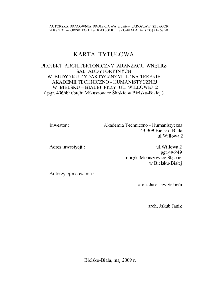 AUTORSKA PRACOWNIA PROJEKTOWA architekt JAROSŁAW SZLAGÓR ul.Ks.STOJAŁOWSKIEGO 18/10 43 300 BIELSKO-BIAŁA tel. (033) 816 58 58 KARTA TYTUŁOWA PROJEKT ARCHITEKTONICZNY ARANŻACJI WNĘTRZ SAL AUDYTORYJNYCH W BUDYNKU DYDAKTYCZNYM „L” NA TERENIE AKADEMII TECHNICZNO - HUMANISTYCZNEJ W BIELSKU – BIAŁEJ PRZY UL. WILLOWEJ 2 ( pgr. 496/49 obręb: Mikuszowice Śląskie w Bielsku-Białej ) Inwestor : Akademia Techniczno - Humanistyczna 43-309 Bielsko-Biała ul.Willowa 2 Adres inwestycji : ul.Willowa 2 pgr.496/49 obręb: Mikuszowice Śląskie w Bielsku-Białej Autorzy opracowania : arch. Jarosław Szlagór arch. Jakub Janik Bielsko-Biała, maj 2009 r. ZAWARTOŚĆ OPRACOWANIA A. OPIS TECHNICZNY 1. Dane ogólne 2. Dane techniczne i zestawienia 3. Załączniki B. CZĘŚĆ RYSUNKOWA A01. Plan sytuacyjny 1:500 A02. Rzut piwnic 1:100 A03. Rzut parteru 1:100 A04. Rzut sufitu 1:100 A05. Przekrój A-A 1:100 A06. Elewacja 1:100 A12. Zestawienie stolarki 1:100 OPIS TECHNICZNY 1. DANE OGÓLNE 1.1. Nazwa inwestycji: Sale audytoryjne w budynku dydaktycznym „L” na terenie Akademii Techniczno-Humanistycznej w Bielsku-Białej 1.2. Lokalizacja : ul.Willowa 2 pgr.496/49 obręb: Mikuszowice Śląskie w Bielsku-Białej 1.3.Inwestor : Akademia Techniczno - Humanistyczna 43-309 Bielsko-Biała ul.Willowa 2 1.4. Przedmiot opracowania : Projekt architektoniczny aranżacji wnętrz sal audytoryjnych w budynku dydaktycznym „L” na terenie ATH w Bielsku-Białej. 1.5. Podstawa opracowania : zlecenie Inwestora ; wizja lokalna i inwentaryzacja architektoniczno-budowlana wykonana na podstawie dostarczonej przez Inwestora dokumentacji ; konsultacje z rzeczoznawcą d/s higieniczno-sanitarnych, bhp i ergonomii oraz d/s zabezpieczeń pożarowych; 2. DANE TECHNICZNE I ZESTAWIENIA - DUŻA SALA AUDYTORYJNA – 473,00 m2 wentylatorownia 19,80 m2 komunikacja 16,40 m2 balkon techniczny sala audytoryjna duża 358,50 m2 scena 71,70 m2 rozdzielnia 6,90 m2 magazynek 6,90 m2 razem : ● 953,20 m2 pomieszczenie wentylatorowni należy wygłuszyć obkładając ściany i stropy płytami ECOPHON MODUS INDUSTRY o grubości 10cm 130,00 m2); (załącznik 1); ● sufity podwieszone dużej sali audytoryjnej wykonać w systemie ECOPHON FOCUS E (160m2) oraz ECOPHON QUADRO 450 E (208m2) (załącznik 2); ● tylna ściana oraz fragmenty ścian bocznych wyłożyć panelami akustycznymi ECOPHON TEXONA C WALL PANEL w kolorze medium grey 920 w poziomym układzie płyt (150m2) (załącznik 2); ● sufity hallu audytoryjnego, pokojów tłumaczy oraz sceny wykonać z płyt odpowiadających parametrom określonym w operacie pożarowym opracowanym na etapie projektu budowlanego; ● wykładzina dywanowa w kolorze bordowym CARUS COMMERCIAL FLOORING kolekcji STYLE@ELEGANCE nr 2111 (384m2). Wykładzina musi spełniać następujące minimalne wymagania: Rodzaj włókna - 100% PA (poliamid) Szerokość wykładziny - 400 cm Wysokość całkowita - 9,5 mm Gramatura runa - 1000 g/m2 Gramatura całkowita - 1900 g/m2 Ilość włókien - powyżej 200.000/m2 Dźwiękochłonność - powyżej 31 dB Wykładzina musi być trudnopalna w klasie m.in. Cfl1, antyelektrostatyczna oraz posiadać powierzchniowe zabezpieczenie przed zabrudzeniem SCOTCHGARD. ● stopnice zakończyć listwą systemową w kolorze szarym POLLKEN TKE40/28/5-146; ● wywinięcia ścienne wykładzin zakończyć systemową listwą przyścienną w kolorze grafitowym POLLKEN TL55-110; ● podest sceny sali, ze względów pożarowych, wykonany musi być w klasie odporności ogniowej REI30 – zastosować systemową podłogę podniesioną KNAUF GIFAFLOOR wykończoną deską barlinecką w kolorze mahoń (86,50m2)(załącznik 3); ● zastosować oprawy oświetleniowe, zgodnie z projektem instalacji elektrycznych, TCS640 2xTL5 54W/840; ● na drogach ewakuacji wszystkie drzwi muszą być wyposażone w urządzenia przeciwpaniczne (zgodnie z rys. nr A03 oraz A012); ● salę wyposażyć w fotele -VISION- NOWY STYL GROUP w kolorystyce: drewno-mahoń nr 1.016, tapicerka grafitowa nr LC046; (308 sztuk) – fotele dostarcza Zamawiający.; Uwaga: Zgodnie z zasadami zamówień publicznych można zastosować materiały i rozwiązania równoważne, to jest w żadnym stopniu nie obniżające standardu i nie zmieniające zasad oraz rozwiązań technicznych przyjętych w projekcie, a tym samym nie powodujące konieczności przeprojektowania jakichkolwiek elementów infrastruktury ani nie pozbawiające Użytkownika żadnych wydajności, funkcjonalności użyteczności opisanych lub wynikających z dokumentacji projektowej. Wszelkie zmiany wynikłe w trakcie realizacji należy uzgodnić z projektantem. Ze względu na charakter budynku wszystkie wymiary powinny zostać sprawdzone na budowie, a szczególną uwagę należy zwrócić na gabaryty otworów drzwiowych na etapie zamówienia inwestorskiego dotyczącego stolarki. Wszystkie materiały wykończeniowe powinny posiadać atest ITB. Podane powierzchnie podłóg i sufitów pomieszczeń uwzględniają stopnie, uskoki i skosy pomieszczeń.