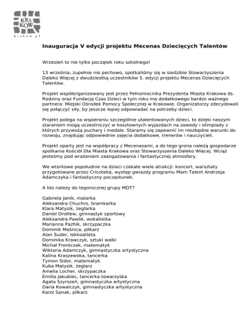 Inauguracja V edycji projektu Mecenas Dziecięcych Talentów Wrzesień to nie tylko początek roku szkolnego! 13 września, zupełnie nie pechowo, spotkaliśmy się w siedzibie Stowarzyszenia Daleko Więcej z dwudziestką uczestników 5. edycji projektu Mecenas Dziecięcych Talentów. Projekt współorganizowany jest przez Pełnomocnika Prezydenta Miasta Krakowa ds. Rodziny oraz Fundację Czas Dzieci w tym roku ma dodatkowego bardzo ważnego partnera: Miejski Ośrodek Pomocy Społecznej w Krakowie. Organizatorzy zdecydowali się połączyć siły, by jeszcze lepiej odpowiadać na potrzeby dzieci. Projekt polega na wspieraniu szczególnie utalentowanych dzieci, to dzięki naszym staraniom mogą uczestniczyć w kosztownych wyjazdach na zawody i olimpiady z których przywożą puchary i medale. Staramy się zapewnić im niezbędne warunki do rozwoju, znajdując odpowiednie zajęcia dodatkowe, trenerów i nauczycieli. Projekt oparty jest na współpracy z Mecenasami, a do tego grona należą gospodarze spotkania Kościół Dla Miasta Krakowa oraz Stowarzyszenia Daleko Więcej. Wciąż jesteśmy pod wrażeniem zaangażowania i fantastycznej atmosfery. We wtorkowe popołudnie na dzieci czekało wiele atrakcji: koncert, warsztaty przygotowane przez Cricotekę, występ gwiazdy programu Mam Talent Andrzeja Adamczyka i fantastyczny poczęstunek. A kto należy do tegorocznej grupy MDT? Gabriela Janik, malarka Aleksandra Chuchro, bramkarka Klara Matysik, żeglarka Daniel Drotlew, gimnastyk sportowy Aleksandra Pawlik, wokalistka Marianna Pazhik, skrzypaczka Dominik Maśnica, piłkarz Alan Suder, lekkoatleta Dominika Krawczyk, sztuki walki Michał Frontczak, matematyk Wiktoria Adamczyk, gimnastyczka artystyczna Kalina Kraszewska, tancerka Tymon Sidor, matematyk Kuba Matysik, żeglarz Amelia Locher, skrzypaczka Emilia Jakubiec, tancerka towarzyska Agata Szyrszeń, gimnastyczka artystyczna Daria Kowalczyk, gimnastyczka artystyczna Karol Sanak, piłkarz Powered by TCPDF (www.tcpdf.org)