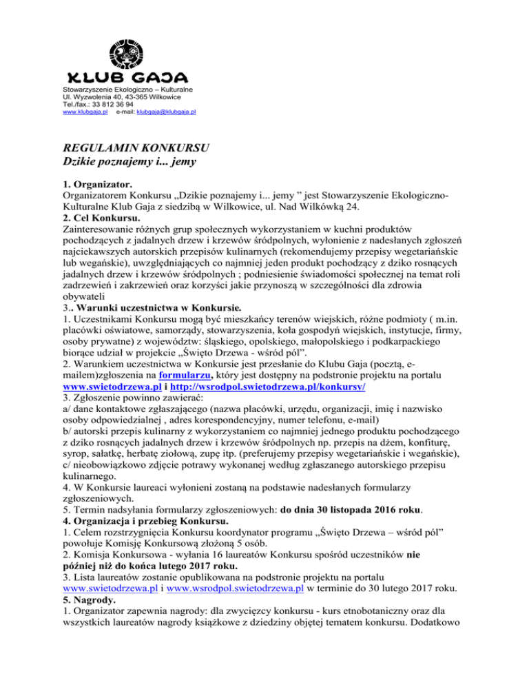 Stowarzyszenie Ekologiczno – Kulturalne Ul. Wyzwolenia 40, 43-365 Wilkowice Tel./fax.: 33 812 36 94 www.klubgaja.pl e-mail: [email protected] REGULAMIN KONKURSU Dzikie poznajemy i... jemy 1. Organizator. Organizatorem Konkursu „Dzikie poznajemy i... jemy ” jest Stowarzyszenie EkologicznoKulturalne Klub Gaja z siedzibą w Wilkowice, ul. Nad Wilkówką 24. 2. Cel Konkursu. Zainteresowanie różnych grup społecznych wykorzystaniem w kuchni produktów pochodzących z jadalnych drzew i krzewów śródpolnych, wyłonienie z nadesłanych zgłoszeń najciekawszych autorskich przepisów kulinarnych (rekomendujemy przepisy wegetariańskie lub wegańskie), uwzględniających co najmniej jeden produkt pochodzący z dziko rosnących jadalnych drzew i krzewów śródpolnych ; podniesienie świadomości społecznej na temat roli zadrzewień i zakrzewień oraz korzyści jakie przynoszą w szczególności dla zdrowia obywateli 3.. Warunki uczestnictwa w Konkursie. 1. Uczestnikami Konkursu mogą być mieszkańcy terenów wiejskich, różne podmioty ( m.in. placówki oświatowe, samorządy, stowarzyszenia, koła gospodyń wiejskich, instytucje, firmy, osoby prywatne) z województw: śląskiego, opolskiego, małopolskiego i podkarpackiego biorące udział w projekcie „Święto Drzewa - wśród pól”. 2. Warunkiem uczestnictwa w Konkursie jest przesłanie do Klubu Gaja (pocztą, emailem)zgłoszenia na formularzu, który jest dostępny na podstronie projektu na portalu www.swietodrzewa.pl i http://wsrodpol.swietodrzewa.pl/konkursy/ 3. Zgłoszenie powinno zawierać: a/ dane kontaktowe zgłaszającego (nazwa placówki, urzędu, organizacji, imię i nazwisko osoby odpowiedzialnej , adres korespondencyjny, numer telefonu, e-mail) b/ autorski przepis kulinarny z wykorzystaniem co najmniej jednego produktu pochodzącego z dziko rosnących jadalnych drzew i krzewów śródpolnych np. przepis na dżem, konfiturę, syrop, sałatkę, herbatę ziołową, zupę itp. (preferujemy przepisy wegetariańskie i wegańskie), c/ nieobowiązkowo zdjęcie potrawy wykonanej według zgłaszanego autorskiego przepisu kulinarnego. 4. W Konkursie laureaci wyłonieni zostaną na podstawie nadesłanych formularzy zgłoszeniowych. 5. Termin nadsyłania formularzy zgłoszeniowych: do dnia 30 listopada 2016 roku. 4. Organizacja i przebieg Konkursu. 1. Celem rozstrzygnięcia Konkursu koordynator programu „Święto Drzewa – wśród pól” powołuje Komisję Konkursową złożoną 5 osób. 2. Komisja Konkursowa - wyłania 16 laureatów Konkursu spośród uczestników nie później niż do końca lutego 2017 roku. 3. Lista laureatów zostanie opublikowana na podstronie projektu na portalu www.swietodrzewa.pl i www.wsrodpol.swietodrzewa.pl w terminie do 30 lutego 2017 roku. 5. Nagrody. 1. Organizator zapewnia nagrody: dla zwycięzcy konkursu - kurs etnobotaniczny oraz dla wszystkich laureatów nagrody książkowe z dziedziny objętej tematem konkursu. Dodatkowo laureaci otrzymają egzemplarze broszury „Dzikie poznajemy i...jemy” z wydrukowanymi przepisami kulinarnymi laureatów. 6. Ochrona własności intelektualnej. Wraz z przesłaniem zgłoszenia, Uczestnik konkursu wyraża zgodę na nieodpłatne wykorzystywanie swoich zdjęć i tekstu przez Organizatora Konkursu na wszelkich polach eksploatacji. Niniejszą zgodę należy rozumieć jako udzielenie przez Uczestnika Organizatorowi licencji nieodpłatnej i niewyłącznej na majątkowe prawa autorskie do dzieła, w rozumieniu ustawy o prawie autorskim i prawach pokrewnych. 7. Prawa do wizerunku i prawa autorskie. Uczestnik przystępujący do projektu zobowiązuje się nie nadsyłać materiałów, które naruszają prawa do wizerunku i prawa autorskie osób trzecich. W przeciwnym razie ponosi pełną i wyłączną odpowiedzialność wobec osób, których prawa naruszył. 8. Dane osobowe. Wszystkie dane osobowe są zbierane, przetwarzane i udostępniane na zasadach zgodnych z obowiązującym w Rzeczpospolitej Polskiej prawem. 9. Zmiany w regulaminie Konkursu. Organizator konkursu zastrzega sobie prawo do wprowadzania zmian w niniejszym regulaminie. Wszelkie zmiany stają się obowiązujące w momencie powiadomienia uczestników projektu poprzez przesłanie informacji o zmianie za pośrednictwem poczty elektronicznej oraz po opublikowaniu zmian w regulaminie na stronie internetowej projektu. 10. Akceptacja regulaminu Konkursu Każdy uczestnik konkursu akceptuje i wyraża zgodę na postanowienia niniejszego regulaminu. 11. Postanowienia końcowe. W sprawach nieuregulowanych niniejszym regulaminem mają zastosowanie odpowiednie przepisy kodeksu cywilnego oraz inne stosowne przepisy prawa polskiego Stowarzyszenie Ekologiczno-Kulturalne Klub Gaja • 43-365 Wilkowice • ul. Nad Wilkówką 24 • BGŻ SA O/Bielsko-Biała nr 90 2030 0045 1110 0000 0067 3120 na ratowanie zwierząt i przyrody • Klub Gaja • KRS: 0000120069