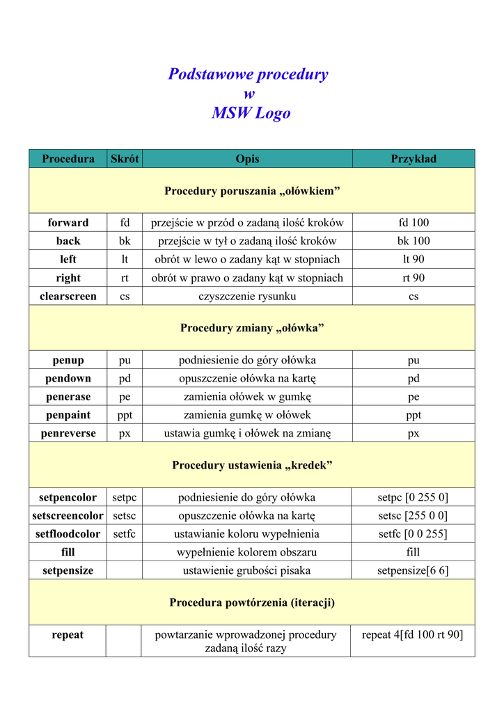 Podstawowe procedury w MSW Logo Procedura Skrót Opis Przykład Procedury poruszania „ołówkiem” forward fd przejście w przód o zadaną ilość kroków fd 100 back bk przejście w tył o zadaną ilość kroków bk 100 left lt obrót w lewo o zadany kąt w stopniach lt 90 right rt obrót w prawo o zadany kąt w stopniach rt 90 clearscreen cs czyszczenie rysunku cs Procedury zmiany „ołówka” penup pu podniesienie do góry ołówka pu pendown pd opuszczenie ołówka na kartę pd penerase pe zamienia ołówek w gumkę pe penpaint ppt zamienia gumkę w ołówek ppt penreverse px ustawia gumkę i ołówek na zmianę px Procedury ustawienia „kredek” setpencolor setpc podniesienie do góry ołówka setpc [0 255 0] setscreencolor setsc opuszczenie ołówka na kartę setsc [255 0 0] ustawianie koloru wypełnienia setfc [0 0 255] fill wypełnienie kolorem obszaru fill setpensize ustawienie grubości pisaka setpensize[6 6] setfloodcolor setfc Procedura powtórzenia (iteracji) repeat powtarzanie wprowadzonej procedury zadaną ilość razy repeat 4[fd 100 rt 90]