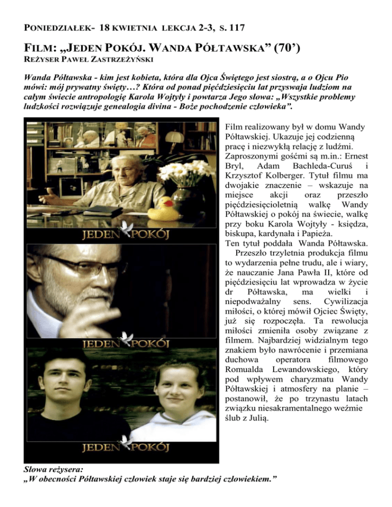 PONIEDZIAŁEK- 18 KWIETNIA LEKCJA 2-3, S. 117 FILM: „JEDEN POKÓJ. WANDA PÓŁTAWSKA” (70’) REŻYSER PAWEŁ ZASTRZEŻYŃSKI Wanda Półtawska - kim jest kobieta, która dla Ojca Świętego jest siostrą, a o Ojcu Pio mówi: mój prywatny święty…? Która od ponad pięćdziesięciu lat przyswaja ludziom na całym świecie antropologię Karola Wojtyły i powtarza Jego słowa: „Wszystkie problemy ludzkości rozwiązuje genealogia divina - Boże pochodzenie człowieka”. Film realizowany był w domu Wandy Półtawskiej. Ukazuje jej codzienną pracę i niezwykłą relację z ludźmi. Zaproszonymi gośćmi są m.in.: Ernest Bryl, Adam Bachleda-Curuś i Krzysztof Kolberger. Tytuł filmu ma dwojakie znaczenie – wskazuje na miejsce akcji oraz przeszło pięćdziesięcioletnią walkę Wandy Półtawskiej o pokój na świecie, walkę przy boku Karola Wojtyły - księdza, biskupa, kardynała i Papieża. Ten tytuł poddała Wanda Półtawska. Przeszło trzyletnia produkcja filmu to wydarzenia pełne trudu, ale i wiary, że nauczanie Jana Pawła II, które od pięćdziesięciu lat wprowadza w życie dr Półtawska, ma wielki i niepodważalny sens. Cywilizacja miłości, o której mówił Ojciec Święty, już się rozpoczęła. Ta rewolucja miłości zmieniła osoby związane z filmem. Najbardziej widzialnym tego znakiem było nawrócenie i przemiana duchowa operatora filmowego Romualda Lewandowskiego, który pod wpływem charyzmatu Wandy Półtawskiej i atmosfery na planie – postanowił, że po trzynastu latach związku niesakramentalnego weźmie ślub z Julią. Słowa reżysera: „W obecności Półtawskiej człowiek staje się bardziej człowiekiem.” WTOREK- 19 KWIETNIA LEKCJA 1-3, S. 117 FILM: „KTO NIGDY NIE ŻYŁ” (105’) REŻ. ANDRZEJ SEWERYN W ROLI GŁÓWNEJ: MICHAŁ ŻEBROWSKI Młody, charyzmatyczny ksiądz Jan na co dzień pomaga uzależnionej młodzieży. Metody jakie stosuje w swojej pracy duszpasterskiej i fakt, że jest bardzo zżyty ze środowiskiem narkomanów, nie odpowiadają jego przełożonym. Dlatego kiedy otrzymuje polecenie podjęcia studiów w Rzymie, jest pewien, że to próba oddzielenia go od wiernych. Przyczyna odsunięcia od pracy okazuje się jednak zupełnie inna... ŚRODA - 20 KWIETNIA LEKCJA 3-4, S. 117 FILM: „SZKOŁA UCZUĆ” (105’) REŻYSERIA ADAM SHANKMAN W ROLACH GŁÓWNYCH: MANDY MOORE I SHANE WEST Landon jest lekkomyślnym nastolatkiem, który razem z przyjaciółmi czerpie przyjemność z upokarzania swoich szkolnych kolegów. Jedna z takich "zabaw" kończy się tragicznie. Za karę London musi opiekować się młodszymi uczniami. W ten sposób poznaje Jamie dziewczynę, która na zawsze odmieni jego życie. "Nasza miłość jest, jak wiatr - nie widzę jej, ale ją czuję." ŚRODA - 20 KWIETNIA LEKCJA 5 (GODZ. 11:40), S. 117 FILM: „MIEJSCE ZWANE DOMEM” (52’) NAJLEPSZY FILM RELIGIJNY W AMERYCE W 1992 ROKU Program Ralphem Martinem Gdy marzenia kończą się rozczarowaniem, rozpaczą, a nawet groźbą śmierci, w co pozostaje ci wierzyć? Na to pytanie próbują znaleźć odpowiedź: muzyk, gitarzysta, który był idolem najtwardszy z wszystkich ludzi prezydenta USA Nixona twardy facet, uczestnik wojny w Wietnamie kobieta zdradzana przez męża dziewczyna porzucona przez ojca, zmagająca się, by być kochaną mężczyzna szukający akceptacji zarażony HIV