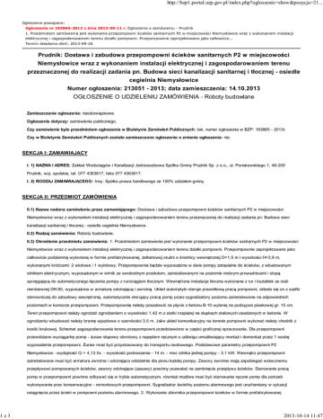 1z3 http://bzp1.portal.uzp.gov.pl/index.php?ogloszenie=show&pozycja=21... Ogłoszenie powiązane: Ogłoszenie nr 183865-2013 z dnia 2013-09-11 r. Ogłoszenie o zamówieniu - Prudnik 1. Przedmiotem zamówienia jest wykonanie przepompowni ścieków sanitarnych P2 w miejscowości Niemysłowice wraz z wykonaniem instalacji elektrycznej i zagospodarowaniem terenu działki pompowni. Przepompownie zaprojektowano jako całkowicie... Termin składania ofert: 2013-09-26 Prudnik: Dostawa i zabudowa przepompowni ścieków sanitarnych P2 w miejscowości Niemysłowice wraz z wykonaniem instalacji elektrycznej i zagospodarowaniem terenu przeznaczonej do realizacji zadania pn. Budowa sieci kanalizacji sanitarnej i tłocznej - osiedle cegielnia Niemysłowice Numer ogłoszenia: 213051 - 2013; data zamieszczenia: 14.10.2013 OGŁOSZENIE O UDZIELENIU ZAMÓWIENIA - Roboty budowlane Zamieszczanie ogłoszenia: nieobowiązkowe. Ogłoszenie dotyczy: zamówienia publicznego. Czy zamówienie było przedmiotem ogłoszenia w Biuletynie Zamówień Publicznych: tak, numer ogłoszenia w BZP: 183865 - 2013r. Czy w Biuletynie Zamówień Publicznych zostało zamieszczone ogłoszenie o zmianie ogłoszenia: nie. SEKCJA I: ZAMAWIAJĄCY I. 1) NAZWA I ADRES: Zakład Wodociągów i Kanalizacji Jednoosobowa Spółka Gminy Prudnik Sp. z o.o., ul. Poniatowskiego 1, 48-200 Prudnik, woj. opolskie, tel. 077 4363617, faks 077 4363617. I. 2) RODZAJ ZAMAWIAJĄCEGO: Inny: Spółka prawa handlowego ze 100% udziałem gminy. SEKCJA II: PRZEDMIOT ZAMÓWIENIA II.1) Nazwa nadana zamówieniu przez zamawiającego: Dostawa i zabudowa przepompowni ścieków sanitarnych P2 w miejscowości Niemysłowice wraz z wykonaniem instalacji elektrycznej i zagospodarowaniem terenu przeznaczonej do realizacji zadania pn. Budowa sieci kanalizacji sanitarnej i tłocznej - osiedle cegielnia Niemysłowice. II.2) Rodzaj zamówienia: Roboty budowlane. II.3) Określenie przedmiotu zamówienia: 1. Przedmiotem zamówienia jest wykonanie przepompowni ścieków sanitarnych P2 w miejscowości Niemysłowice wraz z wykonaniem instalacji elektrycznej i zagospodarowaniem terenu działki pompowni. Przepompownie zaprojektowano jako całkowicie podziemną wykonaną w formie prefabrykowanej, żelbetowej studni o średnicy wewnętrznej D=1,5 m i wysokości H=3,9 m, wykonanymi króćcami: 2 wlotowe i 1 wylotowy. Przepompownia będzie wyposażona w dwie pompy zatapialne do ścieków, z wbudowanym silnikiem elektrycznym, wyposażonym w wirnik ze swobodnym przelotem, zainstalowanymi na poziomie mokrym prowadnicami i stopą sprzęgającą do automatycznego łączenia pompy z rurociągiem tłocznym. Wewnętrzna instalacja tłoczna wykonana z rur i kształtek ze stali nierdzewnej DN 80, wyposażona w armaturę odcinającą i zwrotną. Układ automatyki steruje prawidłową pracą pompowni, składa się on z szafki sterowniczej do zabudowy zewnętrznej, automatycznie sterujący pracą pomp przez sygnalizatory poziomu zainstalowane na odpowiednich poziomach w komorze przepompowni. Przepompownię należy posadowić na płycie z betonu B-10 wylanej na podsypce piaskowej gr. 15 cm. Teren przepompowni należy ogrodzić ogrodzeniem o wysokości 1,42 m z siatki rozpiętej na słupkach stalowych osadzonych w betonie. W ogrodzeniu wbudować należy bramę wjazdowa o szerokości 3,5 m. Jako układ komunikacyjny na terenie pompowni wykonać należy chodnik z kostki brukowej. Schemat zagospodarowania terenu przepompowni przedstawiono w części graficznej opracowania. Dla przepompowni przewidziano wyciągarkę pomp - żuraw słupowy obrotowy z napędem ręcznym o udźwigu umożliwiający montaż i demontaż przez 1 osobę wyposażenia przepompowni. Żuraw musi być przystosowany do transportu osobowego. Podstawowe parametry przepompowni P2 Niemysłowice: -wydajność Q = 4,13 l/s. - wysokość podnoszenia - 14 m. - moc silnika jednej pompy - 3,1 kW. Wewnątrz przepompowni zainstalowana musi być armatura zwrotna i odcinająca oddzielnie dla pionu każdej pompy. Zawory zwrotne mają zapobiegać wstecznemu przepływowi pompowanych ścieków, zawory odcinające (zasuwy) powinny pozwalać na zamknięcie przepływu ścieków. Sterowanie pracą pomp w przepompowni powinno odbywać się w trybie automatycznym, również możliwe musi być sterowanie ręczne pomp dla potrzeb wykonywania prac konserwacyjno - remontowych przepompowni. Sygnalizator świetlny poziomu alarmowego jest uruchamiany w sytuacji osiągnięcia przez ścieki w pompowni poziomu alarmowego. 2. Wykonanie zbiornika przepompowni ścieków w formie prefabrykowanej 2013-10-14 11:47 2z3 http://bzp1.portal.uzp.gov.pl/index.php?ogloszenie=show&pozycja=21... żelbetonowej studni. Wymagania: beton klasy min. B45, elementy wodoszczelne (W8), mało nasiąkliwe (poniżej 4%) i mrozoodporne (F-50). Poszczególne elementy zbiornika powinny zawierać uszczelnienia między sobą za pośrednictwem uszczelek gumowych odpornych w zakresie temperatur od -30 st.Cdo +75 st.C, zaprawy wodoszczelnej lub klejów montażowych. Uszczelki powinny wykazać się odpornością na działanie ścieków kanalizacyjnych w zakresie pH 4-9. Zbiornik przepompowni ścieków: średnica wewnętrzna D=1500 mm, wysokość H=3,90m. Dno zbiornika pompowni powinno być wyprofilowane (forma stożka) uniemożliwiające osadzanie się zanieczyszczeń na bokach (ścianach) zbiornika. Wyposażenie zbiornika: podest obsługowy - stal nierdzewna, drabinka złazowa - stal nierdzewna, belka wsporcza - stal nierdzewna, poręcz stal nierdzewna, prowadnice - stal nierdzewna, kominki wentylacyjne - PVC (wyprowadzenie kominków wentylacyjnych musi być poza obręb studni, w sposób nieutrudniający komunikacje), właz wejściowy - stal nierdzewna, szczelny, zamykany na kłódkę i z wbudowanym zabezpieczeniem przed przypadkowym zamknięciem w czasie prowadzenia prac serwisowych wewnątrz zbiornika. zasuwy z klinem gumowanym DN 80 żeliwne 2 szt., przedłużenie trzpienia (przegubowy) ze stali nierdze
