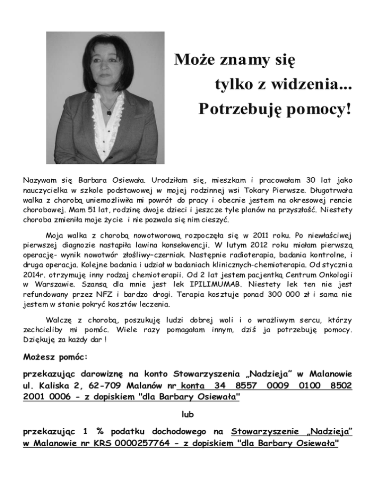 MoŜe znamy się tylko z widzenia... Potrzebuję pomocy! Nazywam się Barbara Osiewała. Urodziłam się, mieszkam i pracowałam 30 lat jako nauczycielka w szkole podstawowej w mojej rodzinnej wsi Tokary Pierwsze. Długotrwał a walka z chorobą uniemoŜliwiła mi powrót do pracy i obecnie jestem na okr esowej rencie chorobowej. Mam 51 lat, rodzinę dwoje dzieci i jeszcze tyle planów na przyszłość. Niestety choroba zmieniła moje Ŝycie i nie pozwala się nim cieszyć. Moja walka z chorobą nowotworową rozpoczęła się w 2011 roku. Po niewłaściwej pierwszej diagnozie nastąpiła lawina konsekwencji. W lutym 2012 roku miałam pierwszą operację- wynik nowotwór złośliwy–czerniak. Następnie radioterapia, badania kontrolne, i druga operacja. Kolejne badania i udział w badaniach klinicznych-chemioterapia. Od styczni a 2014r. otrzymuję inny rodzaj chemiot erapii. Od 2 lat jestem pacjentką Centrum Onkologi i w Warszawie. Szansą dla mnie jest lek IPILIMUMAB. Niestety lek ten nie jest refundowany przez NFZ i bar dzo drogi. Terapia kosztuje ponad 300 000 zł i sama nie jestem w stanie pokryć kosztów leczenia. Walczę z chorobą, poszukuję ludzi dobrej woli i o wraŜliwym sercu, którzy zechcieliby mi pomóc. Wiele razy pomagałam innym, dziś ja potrzebuję pomocy. Dziękuję za kaŜdy dar ! MoŜesz pomóc: przekazując darowiznę na konto Stowarzyszenia „Nadzieja” w Malanowie ul. Kaliska 2, 62-709 Malanów nr konta 34 8557 0009 0100 8502 2001 0006 - z dopiskiem "dla Barbary Osiewała" lub przekazując 1 % podatku dochodowego na Stowarzyszenie „Nadzieja” w Malanowie nr KRS 0000257764 - z dopiskiem "dla Barbary Osiewała"