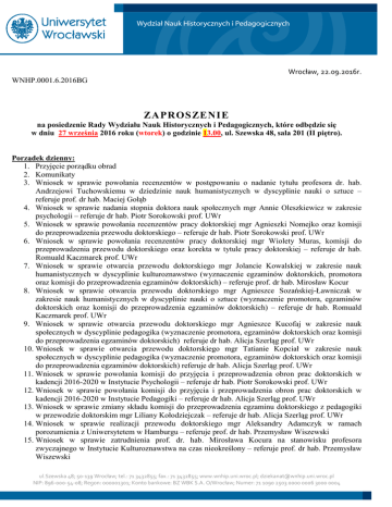Wrocław, 22.09.2016r. WNHP.0001.6.2016BG ZAPROSZENIE na posiedzenie Rady Wydziału Nauk Historycznych i Pedagogicznych, które odbędzie się w dniu 27 września 2016 roku (wtorek) o godzinie 13.00, ul. Szewska 48, sala 201 (II piętro). Porządek dzienny: 1. Przyjęcie porządku obrad 2. Komunikaty 3. Wniosek w sprawie powołania recenzentów w postępowaniu o nadanie tytułu profesora dr. hab. Andrzejowi Tuchowskiemu w dziedzinie nauk humanistycznych w dyscyplinie nauki o sztuce – referuje prof. dr hab. Maciej Gołąb 4. Wniosek w sprawie nadania stopnia doktora nauk społecznych mgr Annie Oleszkiewicz w zakresie psychologii – referuje dr hab. Piotr Sorokowski prof. UWr 5. Wniosek w sprawie powołania recenzentów pracy doktorskiej mgr Agnieszki Nomejko oraz komisji do przeprowadzenia przewodu doktorskiego – referuje dr hab. Piotr Sorokowski prof. UWr 6. Wniosek w sprawie powołania recenzentów pracy doktorskiej mgr Wiolety Muras, komisji do przeprowadzenia przewodu doktorskiego oraz korekta w tytule pracy doktorskiej – referuje dr hab. Romuald Kaczmarek prof. UWr 7. Wniosek w sprawie otwarcia przewodu doktorskiego mgr Jolancie Kowalskiej w zakresie nauk humanistycznych w dyscyplinie kulturoznawstwo (wyznaczenie egzaminów doktorskich, promotora oraz komisji do przeprowadzenia egzaminów doktorskich) – referuje prof. dr hab. Mirosław Kocur 8. Wniosek w sprawie otwarcia przewodu doktorskiego mgr Agnieszce Sozańskiej-Ławniczak w zakresie nauk humanistycznych w dyscyplinie nauki o sztuce (wyznaczenie promotora, egzaminów doktorskich oraz komisji do przeprowadzenia egzaminów doktorskich) – referuje dr hab. Romuald Kaczmarek prof. UWr 9. Wniosek w sprawie otwarcia przewodu doktorskiego mgr Agnieszce Kucofaj w zakresie nauk społecznych w dyscyplinie pedagogika (wyznaczenie promotora, egzaminów doktorskich oraz komisji do przeprowadzenia egzaminów doktorskich) referuje dr hab. Alicja Szerląg prof. UWr 10. Wniosek w sprawie otwarcia przewodu doktorskiego mgr Tatianie Kopciał w zakresie nauk społecznych w dyscyplinie pedagogika (wyznaczenie promotora, egzaminów doktorskich oraz komisji do przeprowadzenia egzaminów doktorskich) referuje dr hab. Alicja Szerląg prof. UWr 11. Wniosek w sprawie powołania komisji do przyjęcia i przeprowadzenia obron prac doktorskich w kadencji 2016-2020 w Instytucie Psychologii – referuje dr hab. Piotr Sorokowski prof. UWr 12. Wniosek w sprawie powołania komisji do przyjęcia i przeprowadzenia obron prac doktorskich w kadencji 2016-2020 w Instytucie Pedagogiki – referuje dr hab. Alicja Szerląg prof. UWr 13. Wniosek w sprawie zmiany składu komisji do przeprowadzenia egzaminu doktorskiego z pedagogiki w przewodzie doktorskim mgr Liliany Kołodziejczak – referuje dr hab. Alicja Szerląg prof. UWr 14. Wniosek w sprawie realizacji przewodu doktorskiego mgr Aleksandry Adamczyk w ramach porozumienia z Uniwersytetem w Hamburgu – referuje prof. dr hab. Przemysław Wiszewski 15. Wniosek w sprawie zatrudnienia prof. dr. hab. Mirosława Kocura na stanowisku profesora zwyczajnego w Instytucie Kulturoznawstwa na czas nieokreślony – referuje prof. dr hab. Przemysław Wiszewski ul.Szewska 48; 50-139 Wrocław; tel.: 71 3432855; fax.: 71 3432855; www.wnhip.uni.wroc.pl; [email protected] NIP: 896-000-54-08; Regon: 000001301; Konto bankowe: BZ WBK S.A. O/Wrocław; Numer: 71 1090 2503 0000 0006 3000 0004 2. 16. Wniosek w sprawie zatrudnienia dr hab. Doroty Wolskiej na stanowisku profesora nadzwyczajnego w Instytucie Kulturoznawstwa na czas nieokreślony– referuje prof. dr hab. Mirosław Kocur 17. Wniosek w sprawie zatrudnienia dr. hab. Grzegorza Pełczyńskiego na stanowisku profesora nadzwyczajnego w Katedrze Etnologii i Antropologii Kulturowej z dniem 1.10.2016 roku na czas nieokreślony – referuje dr hab. Eugeniusz Kłosek prof. UWr 18. Wniosek w sprawie zatrudnienia dr Katarzyny Uzar-Szcześniak na stanowisk starszego wykładowcy adiunkta na dwa lata z dniem 1.10.2016 roku w Instytucie Pedagogiki – referuje dr hab. Alicja Szerląg prof. UWr 19. Wniosek w sprawie zatrudnienia dr Emilii Olejnik-Krupy na stanowisku adiunkta na jeden rok z dniem 1.10.2016 roku w Instytucie Pedagogiki – referuje dr hab. Alicja Szerląg prof. UWr 20. Wniosek w sprawie zatrudnienia dr. Michała Kłosowskiego na stanowisku adiunkta na jeden rok z dn. 1.10.2016 roku w Instytucie Psychologii – referuje dr hab. Piotr Sorokowski prof.. UWr 21. Wniosek w sprawie zatrudnienia mgr Agnieszki Nomejko w wymiarze ½ etatu na stanowisku asystenta w Instytucie Psychologii z dniem 1.10.2016 roku na jeden rok – referuje dr hab. Piotr Sorokowski prof. UWr 22. Wniosek w sprawie zatrudnia mgr Agnieszki Żelwetro na stanowisku asystenta w wymiarze ½ etatu w Instytucie Psychologii z dniem 1.10.2016 roku na jeden rok– referuje dr hab. Piotr Sorokowski prof. UWr 23. Wniosek w sprawie powołania dr hab. Marii Straś – Romanowskiej na kierownika Zakładu Psychologii Osobowości z dniem 1.10.2016 roku do dnia 31 lipca 2017 roku – referuje dr hab. Piotr Sorokowski prof. UWr 24. Wniosek w sprawie powołania dr hab. Doroty Rybczyńskiej Abdel-Kawy na kierownika Zakładu Pedagogiki Resocjalizacji w Instytucie Pedagogiki na dwa lata – referuje dr hab. Alicja Szerląg prof. UWr 25. Wniosek w sprawie powołania dr. Arkadiusza Wojtyły na kierownika Studiów Podyplomowych Wiedza o Sztuce i Kulturze w Instytucie Historii Sztuki – referuje dr hab. Romuald Kaczmarek prof. UWr 26. Wniosek w sprawie powołania dr Elżbiety Jezierskiej-Wiejak na kierownika Studiów Podyplomowych Wychowanie Przedszkolne i Edukacja Wczesnoszkolna na okres od 1.09.2016 do 31.03.2017 – referuje dr hab. Alicja Szerląg prof. UWr 27. Powołanie dr Joanny Malinowskiej na p.o. kierownika Zakładu Pedagogiki Wczesnoszkolnej i Przedszkolnej w Instytucie Pedagogiki na dwa lata – referuje dr ha. Alicja Szerląg prof. UWr 28. Wniosek w sprawie powołania dr Jagody Stompór-Świderskiej na p.o. kierownika Z