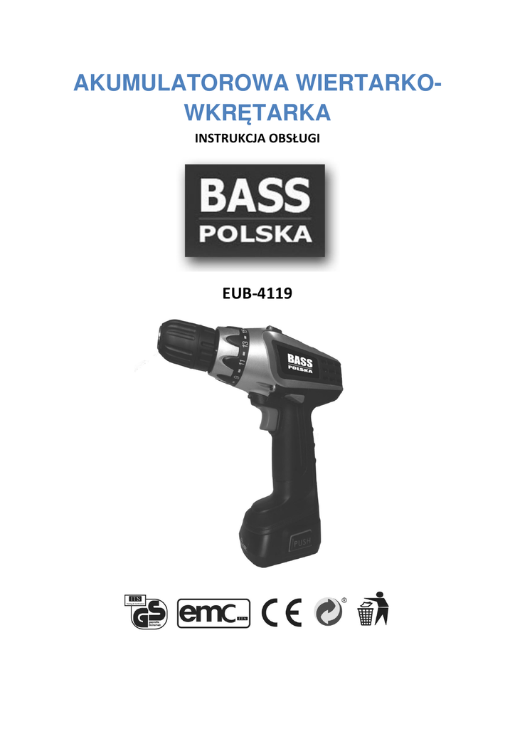 AKUMULATOROWA WIERTARKOWKRĘTARKA INSTRUKCJA OBSŁUGI EUB-4119 NAGRZEWNICA- Instrukcja obsługi Spis treści I. ZASADY BEZPIECZEŃSTWA .......................................................................................................... 2 II. OPIS NARZĘDZIA .......................................................................................................................... 3 III. MOCOWANIE I ZDEJMOWANIE WIERTŁA I BITÓW WKRĘTARKI ................................................. 5 IV. ZMIANA KIERUNKU OBROTÓW ................................................................................................... 5 V. REGULACJA MOMENTU OBROTOWEGO ..................................................................................... 5 VI. ZMIANA BIEGU ............................................................................................................................ 6 VII. WŁĄCZANIE / WYŁĄCZANIE ......................................................................................................... 6 VIII. CZYSZCZENIE I KONSERWACJA .................................................................................................... 6 IX. GWARANCJA I OCHRONA ŚRODOWISKA ..................................................................................... 6 ! UWAGA ! Dla własnego bezpieczeństwa, przed użyciem narzędzia należy dokładnie przeczytać niniejszą instrukcję obsługi. I. ZASADY BEZPIECZEŃSTWA Podczas używania narzędzia zawsze należy przestrzegać wszystkich niezbędnych zasad związanych z bezpieczeństwem pracy, zarówno tych związanych z używaniem urządzenia jak innych, związanych na przykład z użytkowaniem akumulatora. Niektóre informacje w instrukcji są oznaczone następującym symbolem: Ryzyko urazów ciała lub uszkodzenia sprzętu. WSTĘPNE ZASADY BEZPIECZEŃSTWA Należy wyjąć akumulator z narzędzia gdy ma być ono serwisowane, konserwowane oraz magazynowane. Używaj jedynie akumulatora dedykowanego do modelu wkrętarki (zobacz parametry techniczne) INSTRUKCJE ZWIĄZANE Z AKUMULATOREM I ŁADOWANIEM Przed rozpoczęciem ładowania akumulatora przeczytaj wszystkie informacje zawarte w instrukcji. Należy używać jedynie ładowarki przeznaczonej do ładowania danego typu akumulatora. Nie należy używać załączonej ładowarki do ładowania akumulatora innego niż ten w zestawie. 2 NAGRZEWNICA- Instrukcja obsługi Ładowanie odbywać się może w suchym otoczeniu w temperaturze w zakresie 10oC do 40oC Nie ładuj akumulatora przy użyciu uszkodzonej ładowarki. W razie uszkodzenia akumulatora lub ładowarki, powinny one zostać naprawione przez autoryzowany serwis. Chroń akumulator przed spięciem. Upewnij się, że złączki akumulatora się mają kontaktu z metalowymi elementami. Nie przechowuj akumulatora w temperaturze powyżej 50oC np.: w samochodzie stojącym na słońcu. Nie pal akumulatora. Nie próbuj otwierać akumulatora. W razie kontaktu płynu akumulatorowego ze skórą (roztwór 25-30% wodorotlenku potasu), opłucz natychmiastowo narażone miejsce dużą ilością wody. Zneutralizuj słabym kwasem takich jak sok z cytryny lub ocet. W razie dostania się płynu do oczu należy płukać je dużą ilością wody przez 10 minut, następnie skontaktować się z lekarzem. Oznaczenia akumulatora: Nie wrzucaj baterii do ognia Nie wystawiaj akumulatora i ładowarki na temperaturę powyżej 50oC Nie wystawiaj ładowarki ani akumulatora na działanie wody BEZPIECZEŃSTWO ZWIĄZANE Z ELEKTRYCZNOŚCIĄ Zawsze sprawdzaj, czy parametry akumulatora odpowiadają napięciu narzędzia oznaczonemu na tabliczce znamionowej. Upewnij się, że parametry ładowarki są zgodne z parametrami sieci zasilającej. II. OPIS NARZĘDZIA Nasza wiertarko- wkrętarka zaprojektowana została do wiercenia w drewnie, metalu kamieniu oraz plastiku, a także do wkręcania i odkręcania śrub, wkrętów i innych tego typu akcesoriów montażowych. 3 NAGRZEWNICA- Instrukcja obsługi OPIS POSZCZEGÓLNYCH ELEMENTÓW 1 2 3 4 5 6 7 8 9 Włącznik / wyłącznik Przełącznik kierunku obrotów Regulacja momentu obrotowego Lampka LED Uchwyt (niewymagający klucza) Pierścień uchwytu Akumulator Przycisk zwalniający akumulator Przełącznik biegu (2 –biegowy) ŁADOWANIE AKUMULATORA Przed pierwszym użyciem należy naładować akumulator (7). Bateria osiąga pełną pojemność po kilku cyklach całkowitego naładowania i całkowitego rozładowania. 1. Podłącz kabel sieciowy z ładowarką. 4 NAGRZEWNICA- Instrukcja obsługi 2. 3. 4. Podłącz wtyczkę ładowarki do gniazdka zasilającego. Odłącz akumulator od wiertarko- wkrętarki Umieść akumulator w ładowarce na 5 godzin. Nie ładuj akumulatora przez więcej niż 5godzin. III. MOCOWANIE I ZDEJMOWANIE WIERTŁA I BITÓW WKRĘTARKI Narzędzie jest wyposażone w uchwyt (5), który nie wymaga klucza. 1. 2. 3. 4. Otwórz uchwyt poprzez przekręcenie pierścienia uchwytu (6). Umieść wiertło lub bit w uchwycie. Zamknij uchwyt poprzez dokładne dokręcenie pierścienia (6) przy jednoczesnym trzymaniu tylniej części uchwytu drugą ręką. W celu zdemontowania wiertła lub bita należy wykonać powyższe czynności w odwrotnej kolejności. Przed zamontowaniem lub zdemontowaniem wiertła lub bita należy wyjąć akumulator z narzędzia. IV. 1. 2. ZMIANA KIERUNKU OBROTÓW Przesuń przełącznik zmiany kierunku obrotów (2) w lewą stronę wiertarko- wkrętarki aby wiercić otwory i przykręcać śruby. Przesuń przełącznik zmiany kierunku obrotów (2) w prawą stronę wiertarko- wkrętarki aby odkręcać śruby. Przed zmianą kierunku rotacji poczekaj, aż silnik wiertarki całkowicie się zatrzyma. V. REGULACJA MOMENTU OBROTOWEGO Wiertarko- wkrętarka została wyposażona w regulacje pozwalającą na limitowanie momentu obrotowego podczas dokręcania śrub. 5 NAGRZEWNICA- Instrukcja obsługi 1. 2. 3. VI. Przekręć pierścień regulujący (3) w stronę zgodną z kierunkiem ruchu wskazówek zegara aby zmniejszyć mom